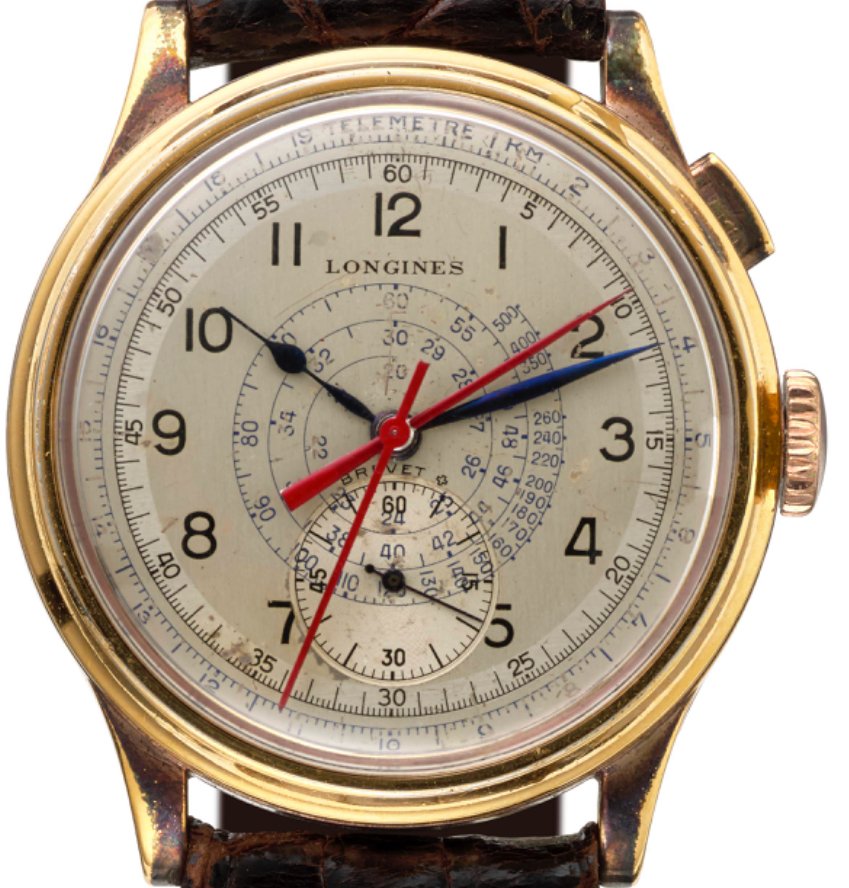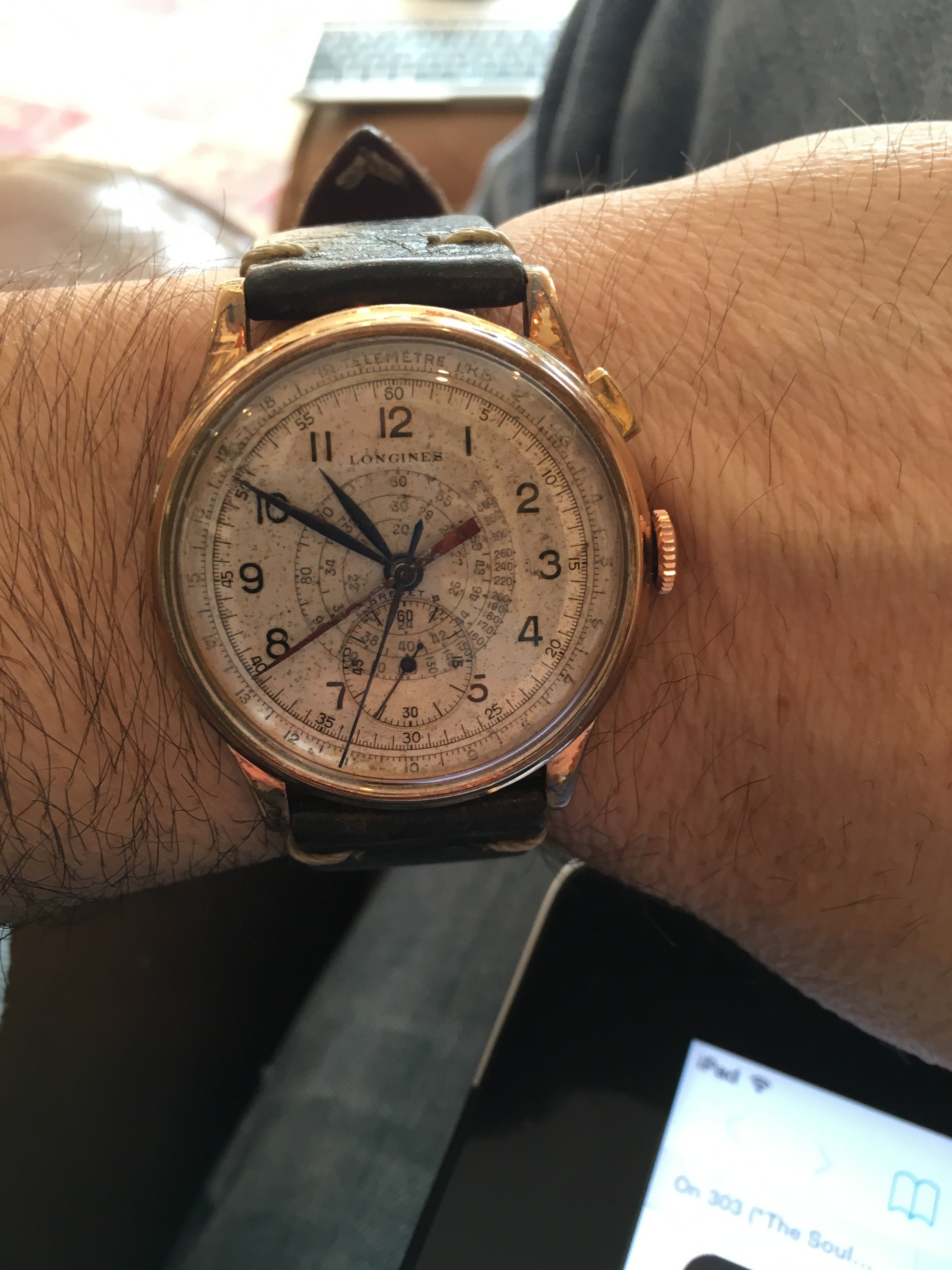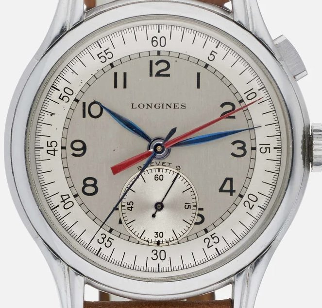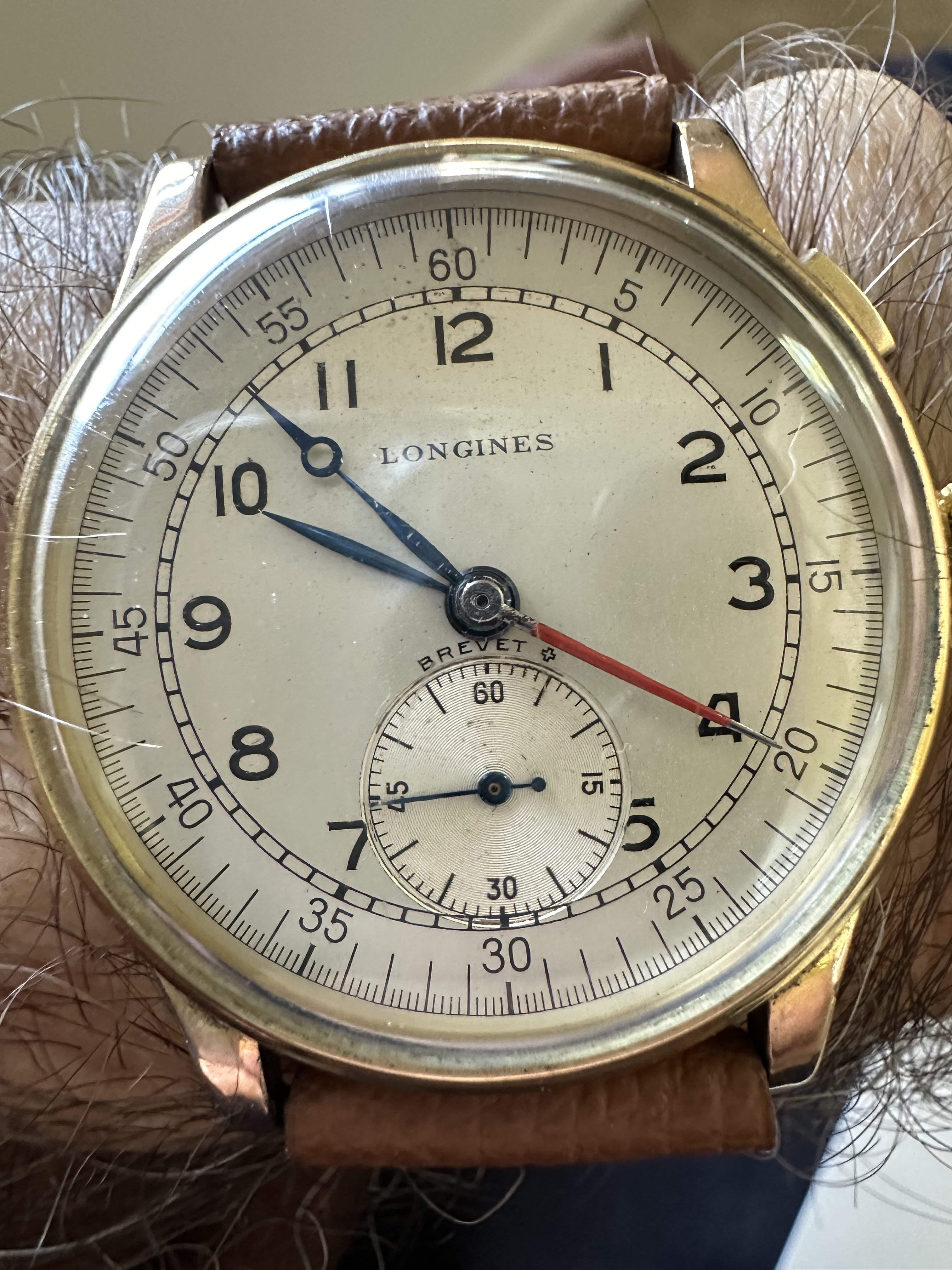 This watch is missing a central seconds hand. I also think the chrono minutes hand tip and tail both were damaged and it was patched back up. When I purchased it I was thinking the watch was originally sold without a seconds hand at the buyer's request, but the broken minutes hand makes me now think that is not the case. Also who wants a chrono with a minutes hand only?