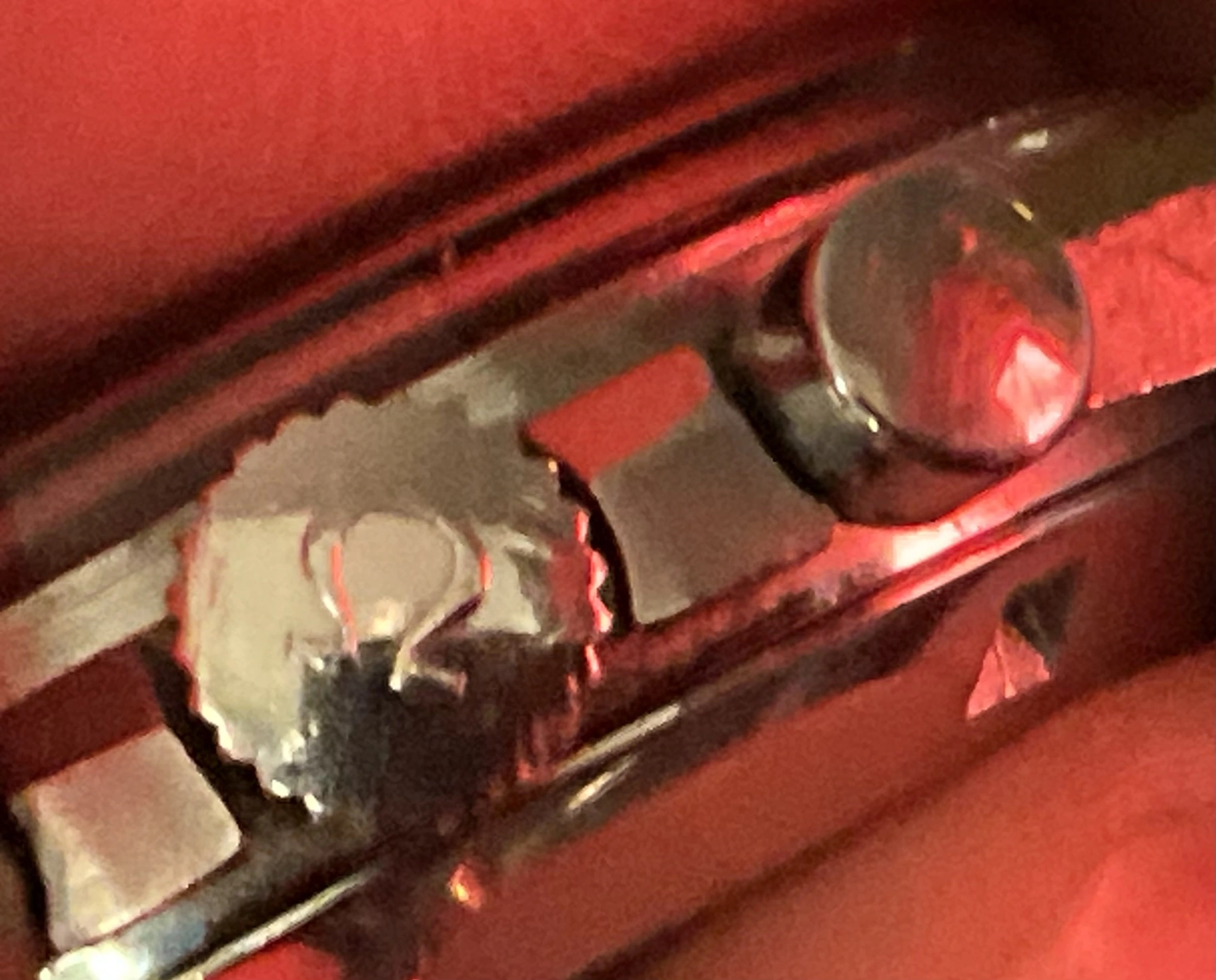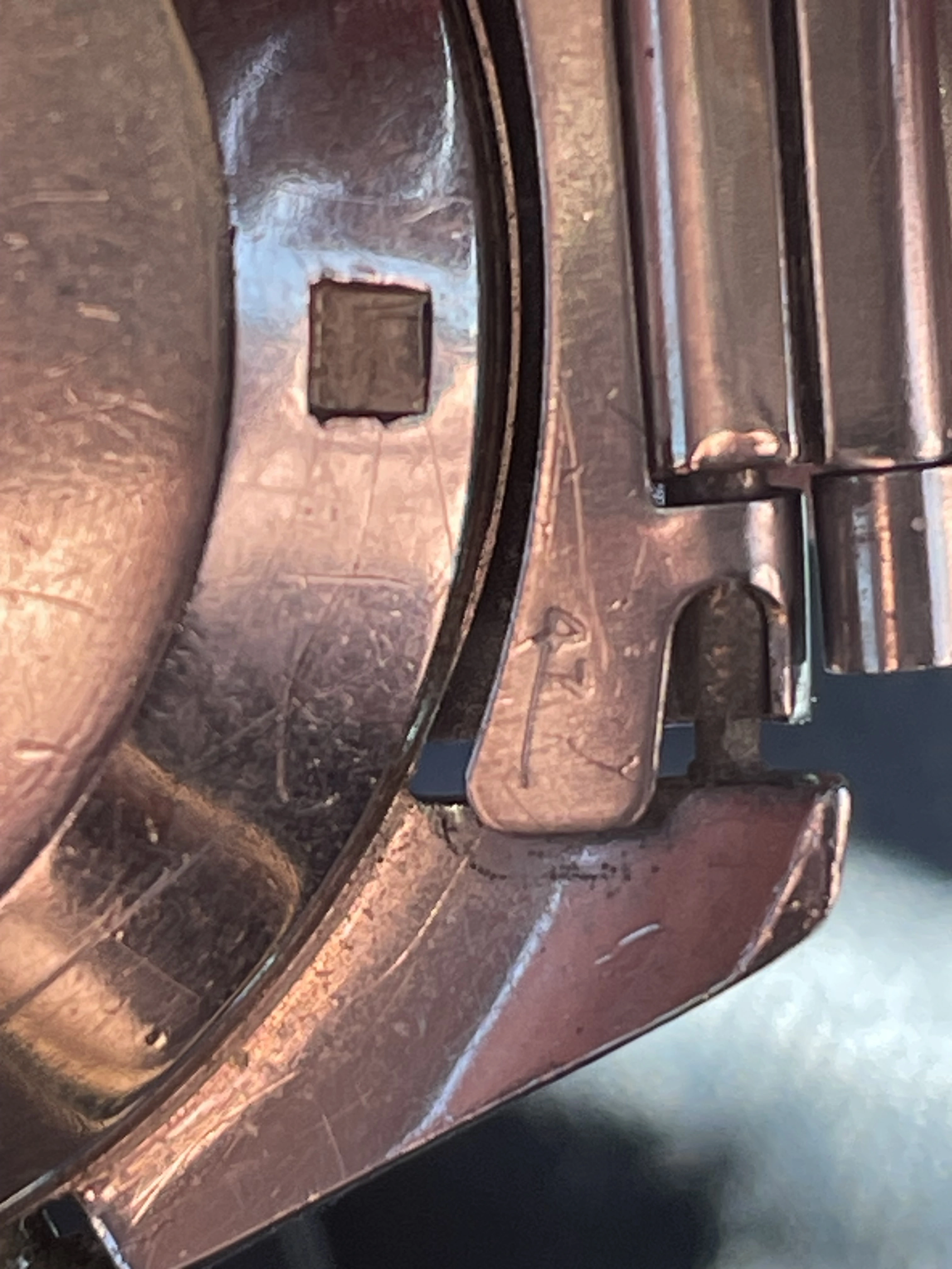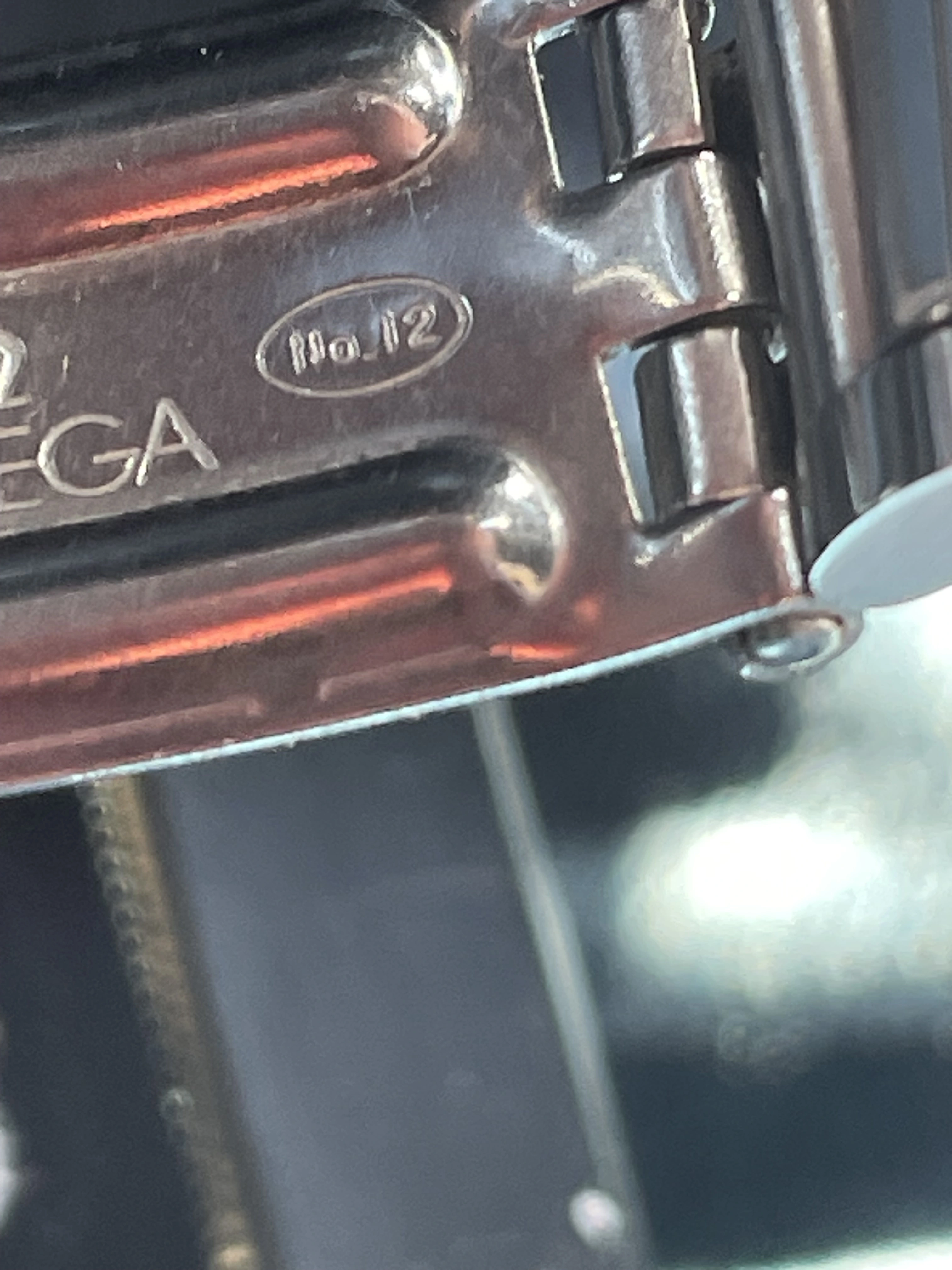 What I think I see as a beginner: Chrono movement does not engage, but the reset seems to work (can see the hands move a bit), watch runs strong and keeps fairly good time, bracelet appear to be 1175, end links are 47s, clasp is #12 but dates to mid-70s, lume isn’t thick and sandy like others I have seen but reacts like 1968 vintage lume under a black light (glows for 7sec after removing the light), crystal is not OEM, dial looks to only have one little freckle (above the 5 marker), paint on the hands looks pretty fragile and likely will need conservation when serviced, movement looks complete and corrosion free, crown looks correct.