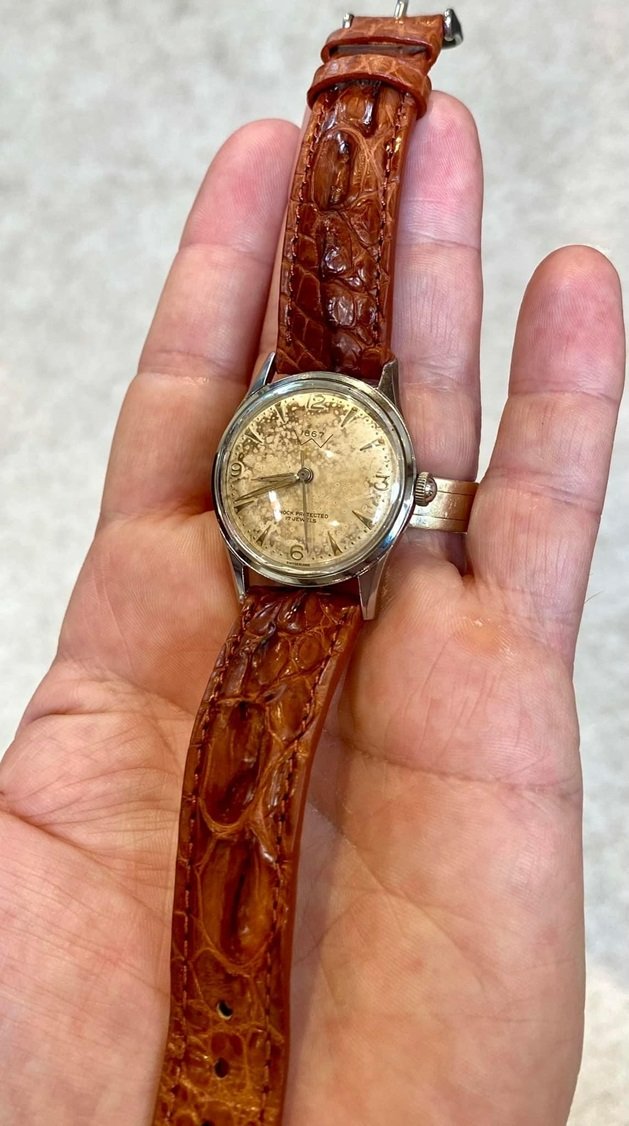 Does anybody happen to have any information about this logo per chance? Clearly the dial has some age due to the markings as well as the creamy orange lume on the hands and indices (which i personally love and is why i purchased it). The dial looks slightly different from every angle.