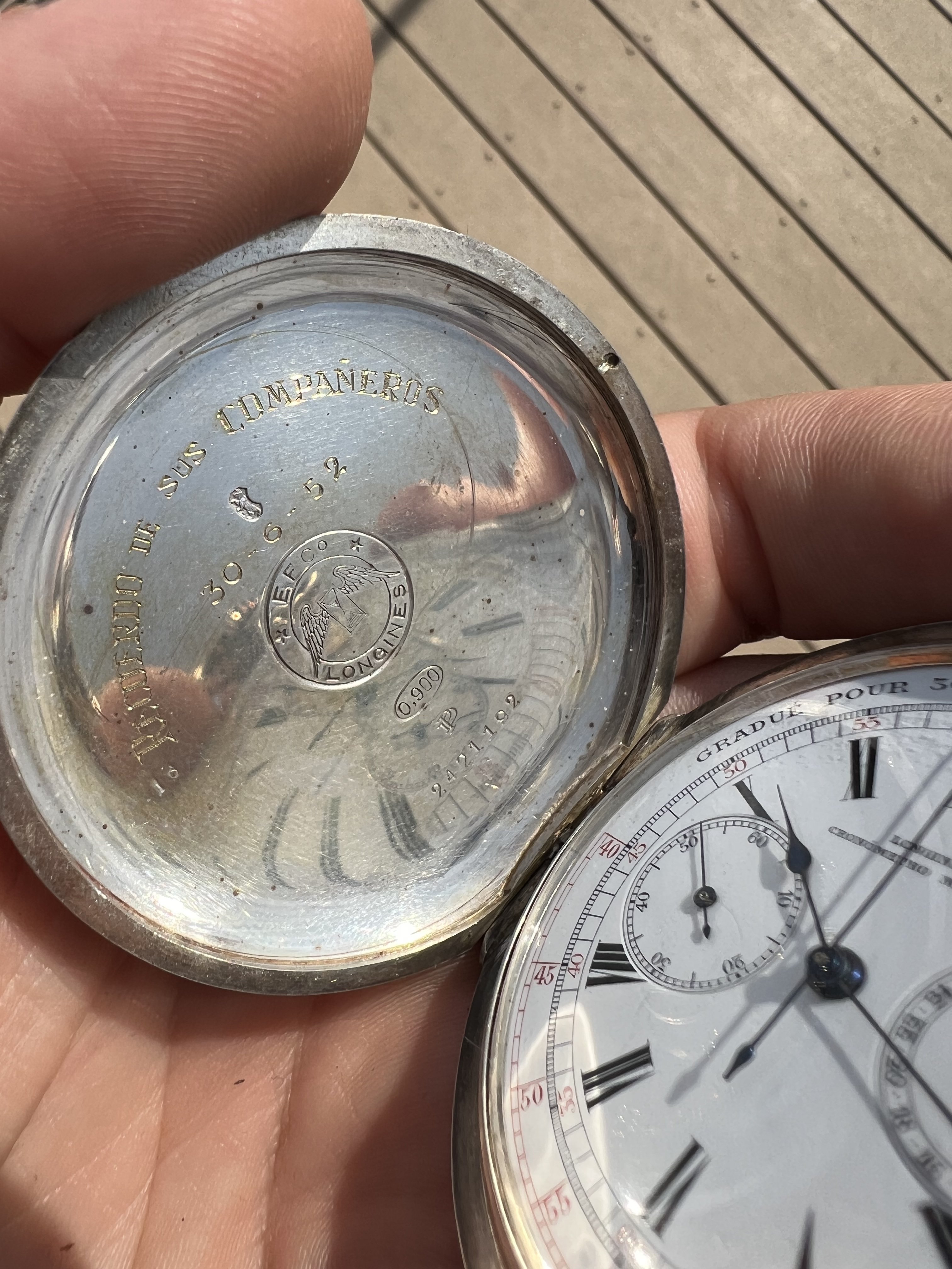 Wanted to share a new acquisition (and my first pocket chronograph). Caliber 19.73N, case serial dates to ~1909, sold in Argentina, where the eBay seller was located. Has an interesting engraving from later in its life (1952) when it was presumably gifted.
