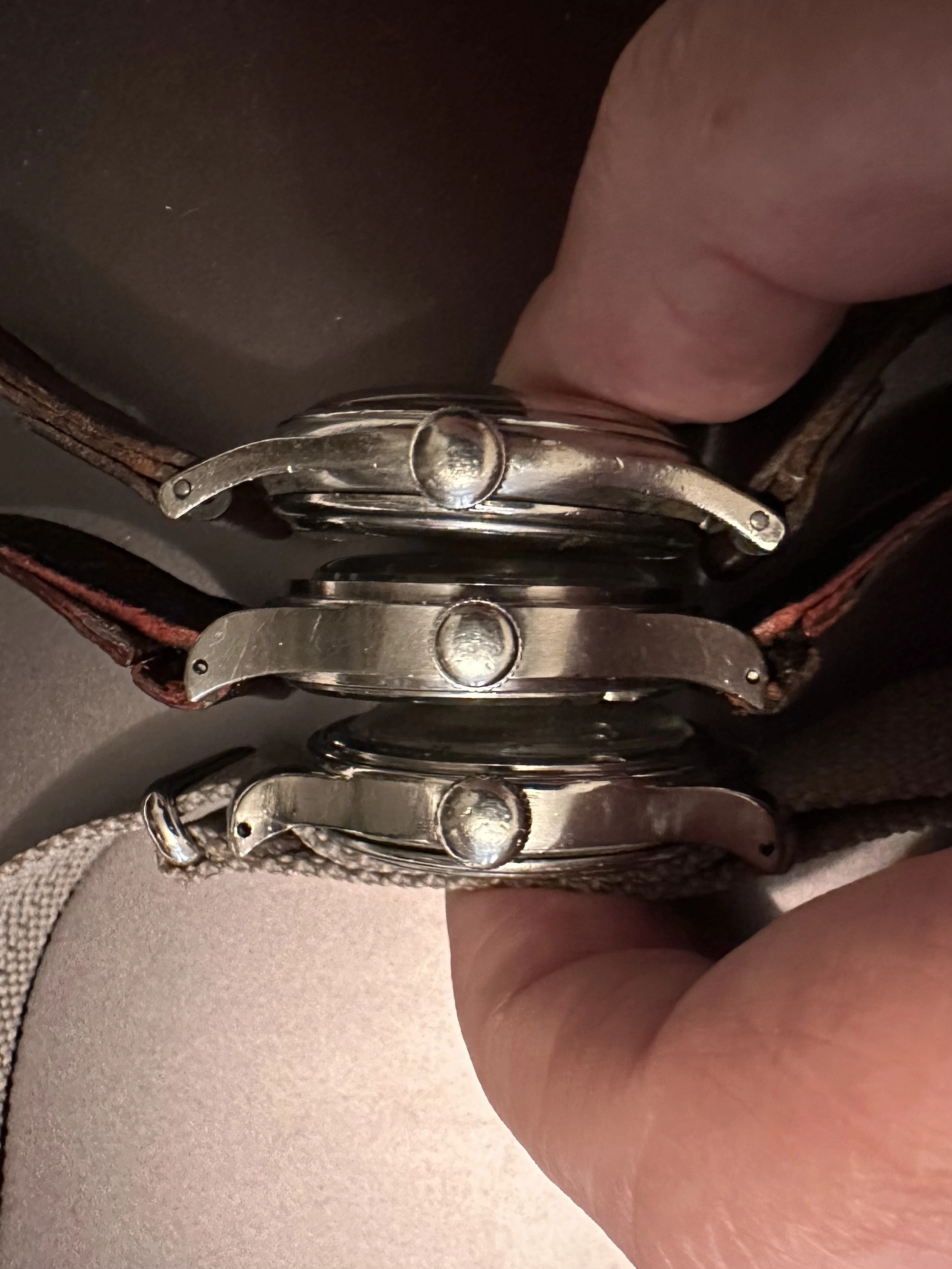 Very different case to my 1947, 35.5mm Longines Ref 5483 Sei Tacche, but similar to my 1940 Tre Tacche, though rounded step instead of sharp step on the front. (Sei Tacche on top in pic, Tre Tacche middle)