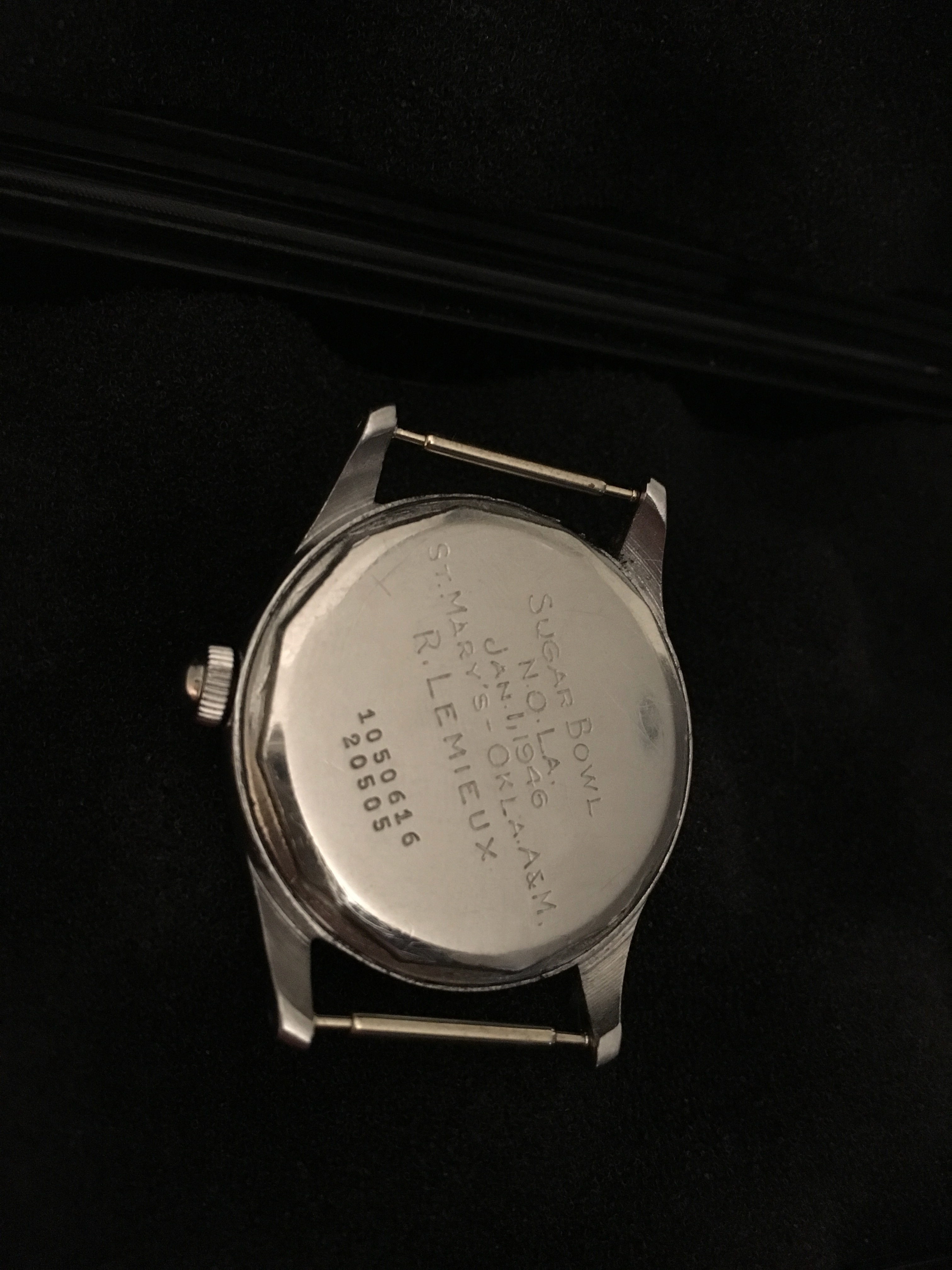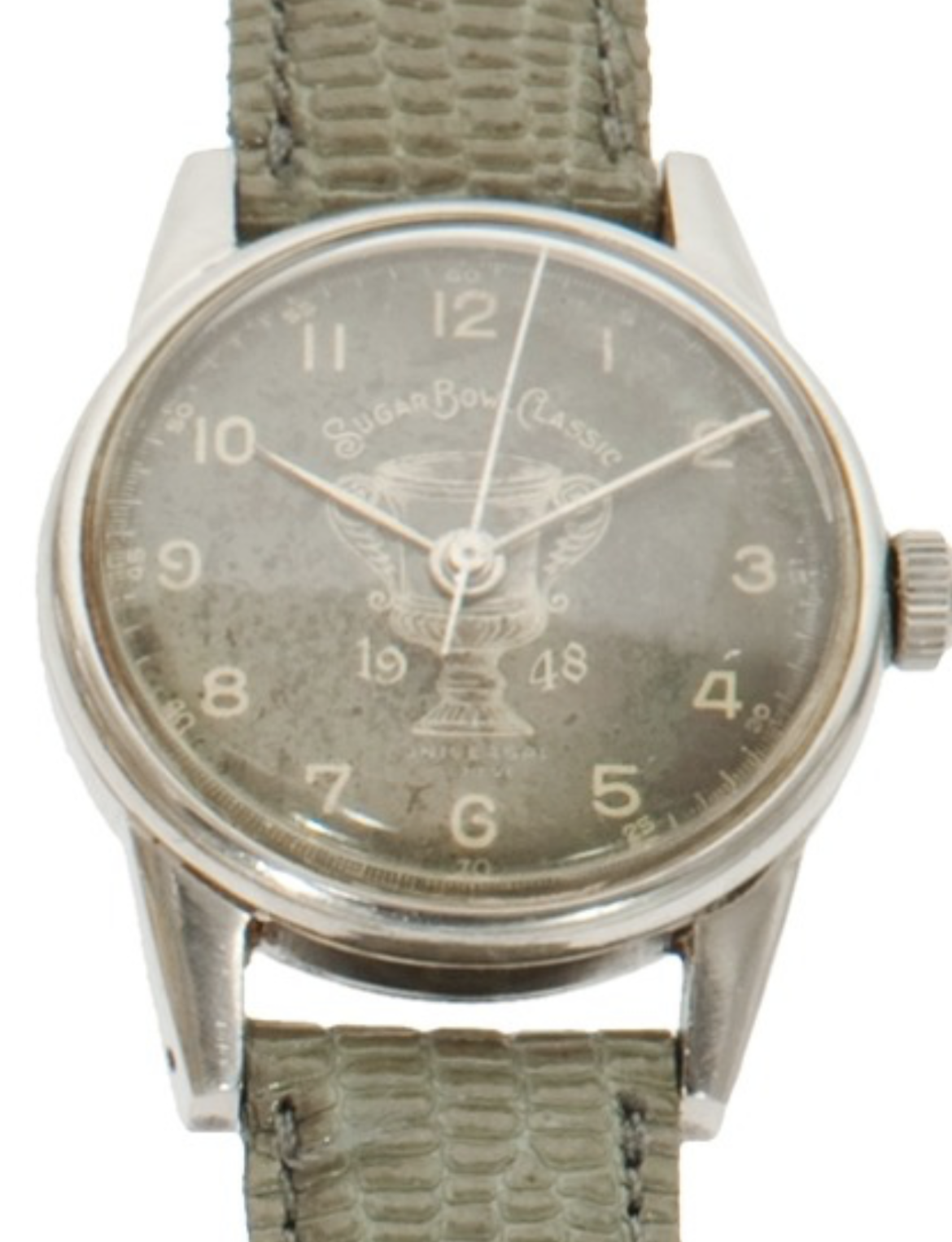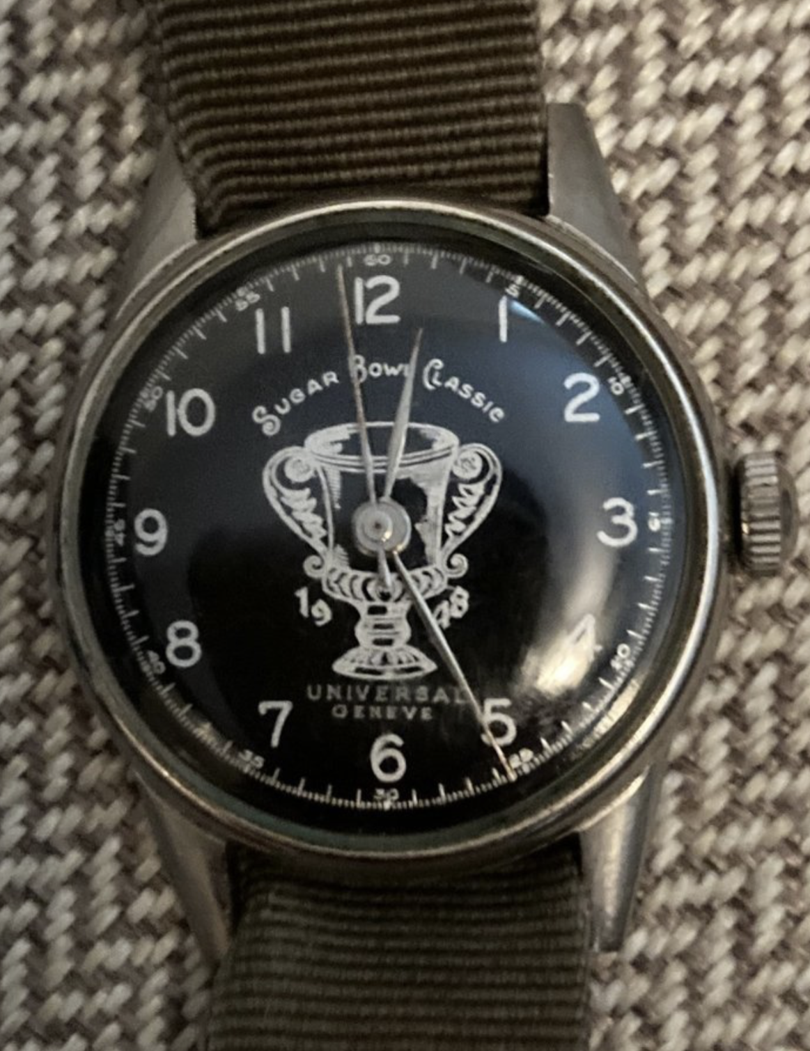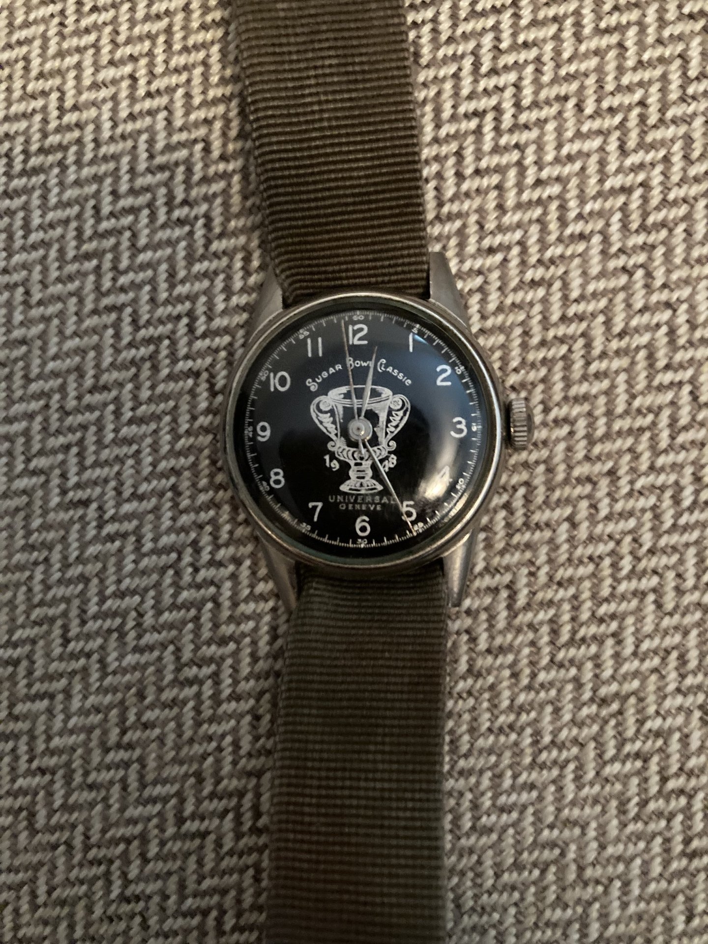 That's a great collecting theme to pursue. I thought the auction link above had an interesting group of college football bowl watches. Besides the UG, the description noted a 1948 Gator Bowl Hamilton, a 1963 Orange Bowl Elgin, 1964 Sugar Bowl Omega, 1979 Sugar Bowl Hamilton and a 1973 Sugar Bowl Hamilton.