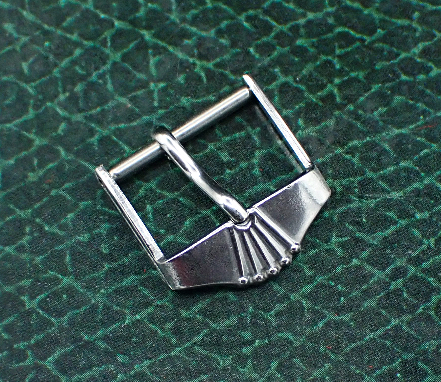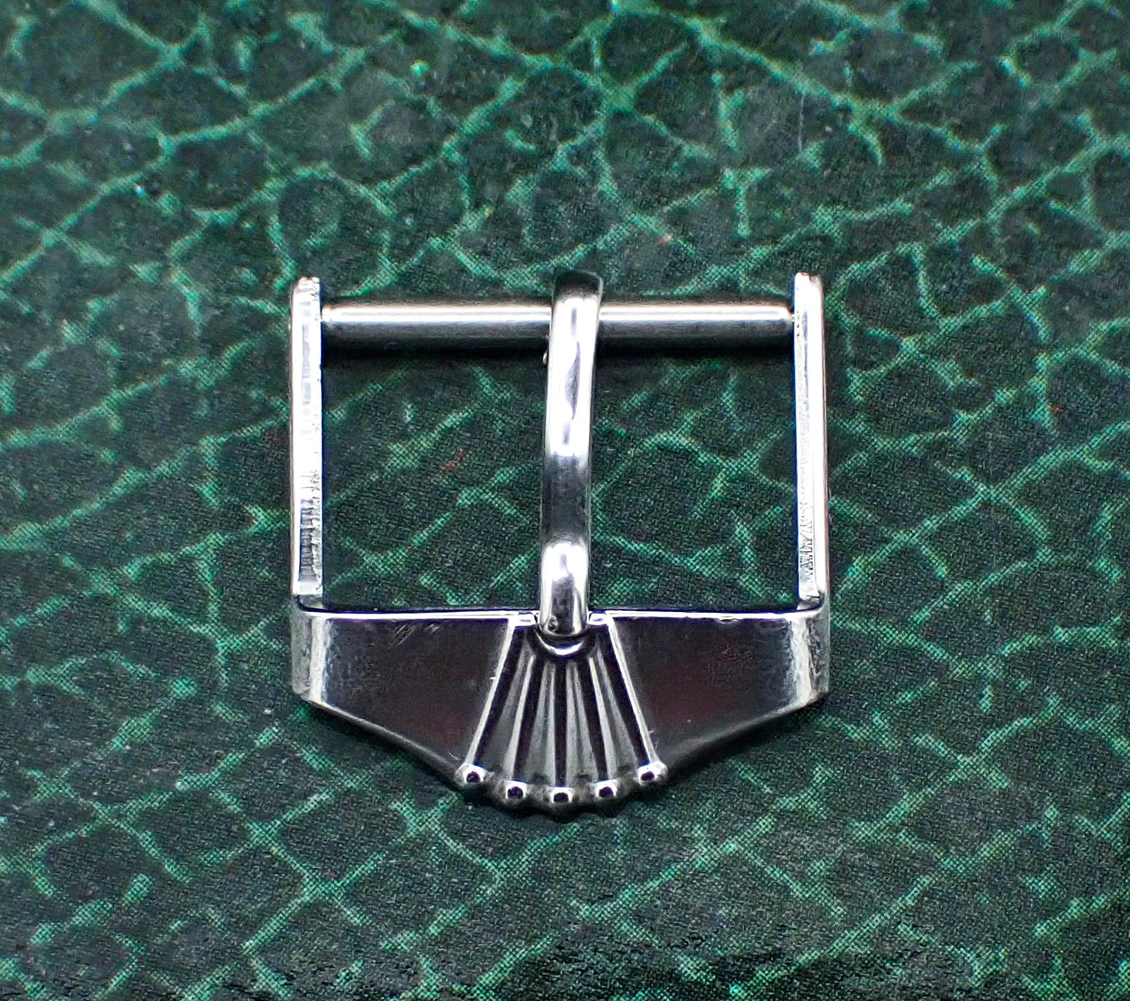 ยทOn offer is this genuine vintage circa 1950s Rolex Big Crown Buckle, aka "Shovel" or "Broom", in Stainless Steel and 16mm width for No-Crown Guards Submariners & GMT-Masters, Pre-Daytona Chronographs, as well as steel Ovettone Datejust and other models like the Padellone. These were made for the American market by Rolex USA and have a very unique oversized, highly stylized Rolex Coronet where the tang meets the buckle. This buckle is in Excellent overall vintage condition, with only normal signs of wear and age and no major defects.