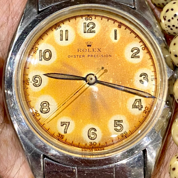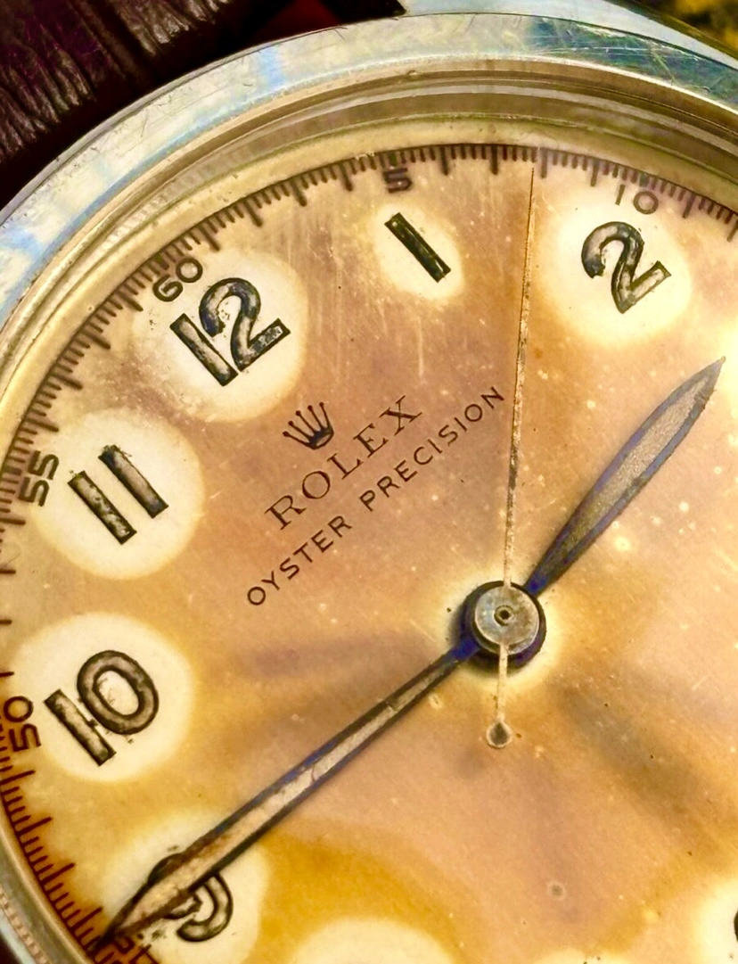We can see faint radium burn from the hands around the dial (at 6 and ten) but the numbers have escaped any deterioration.
