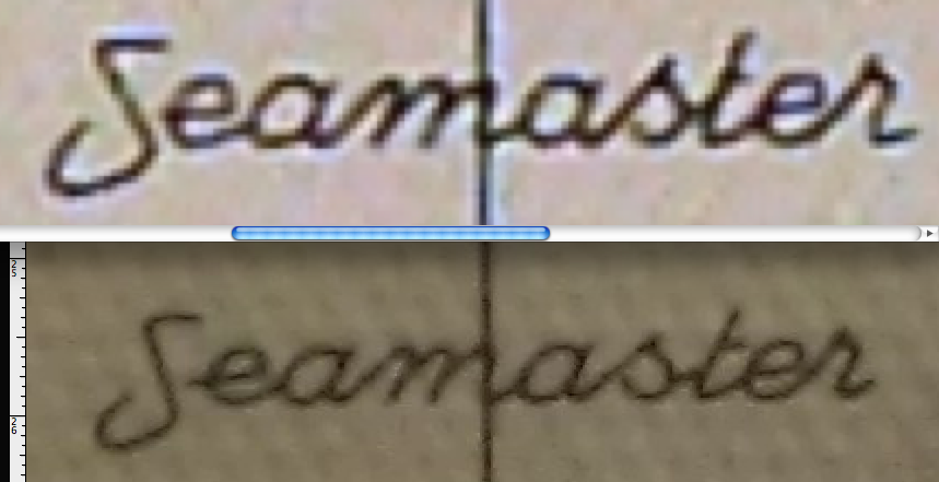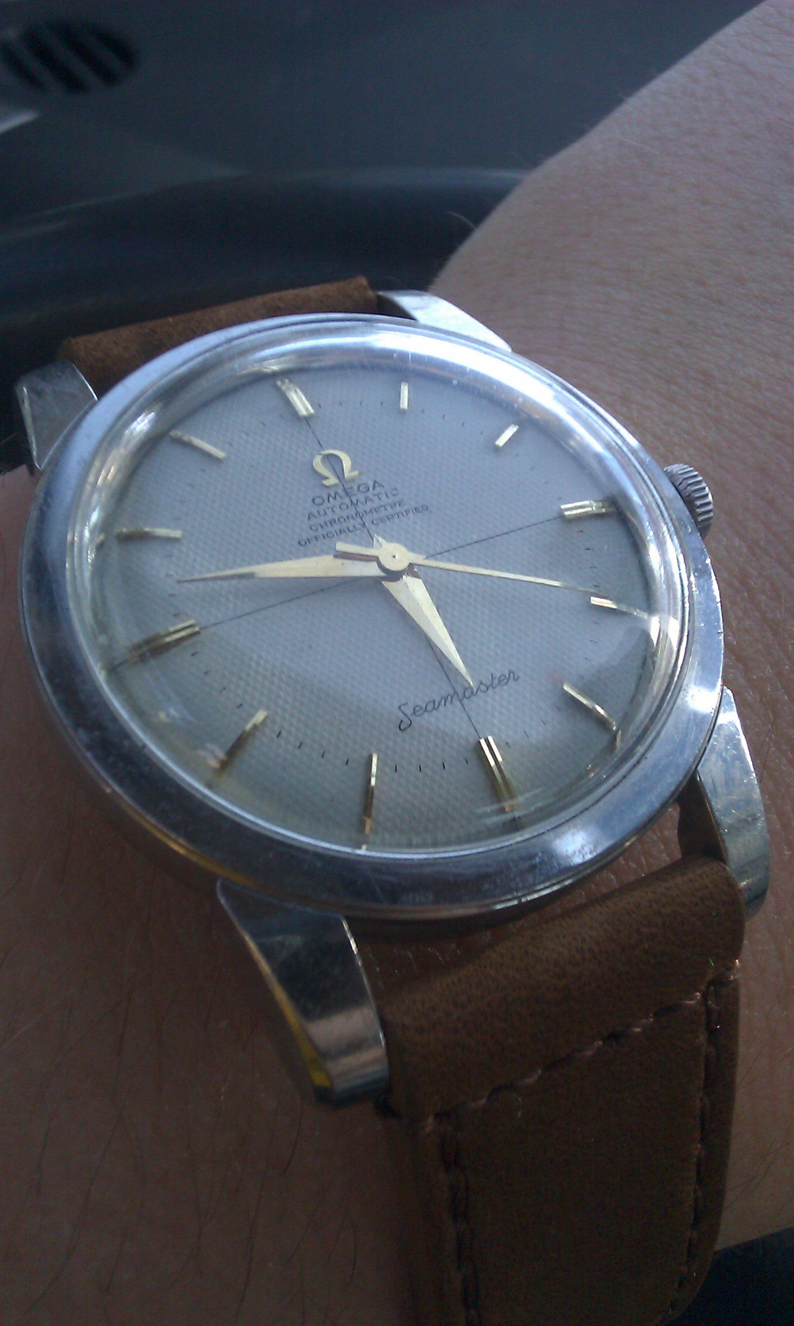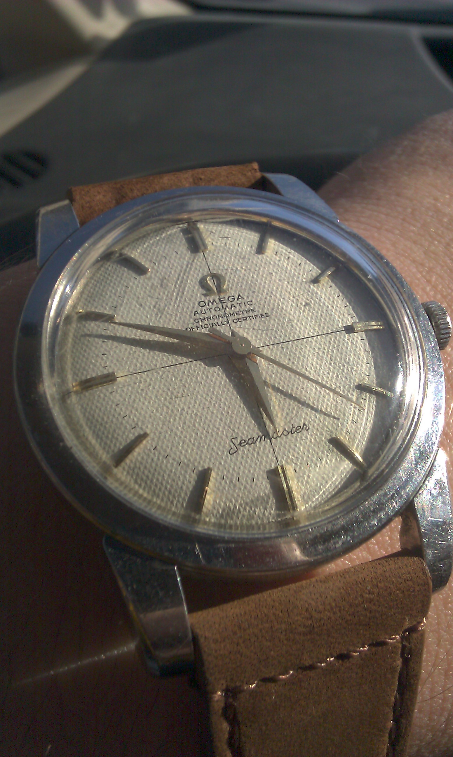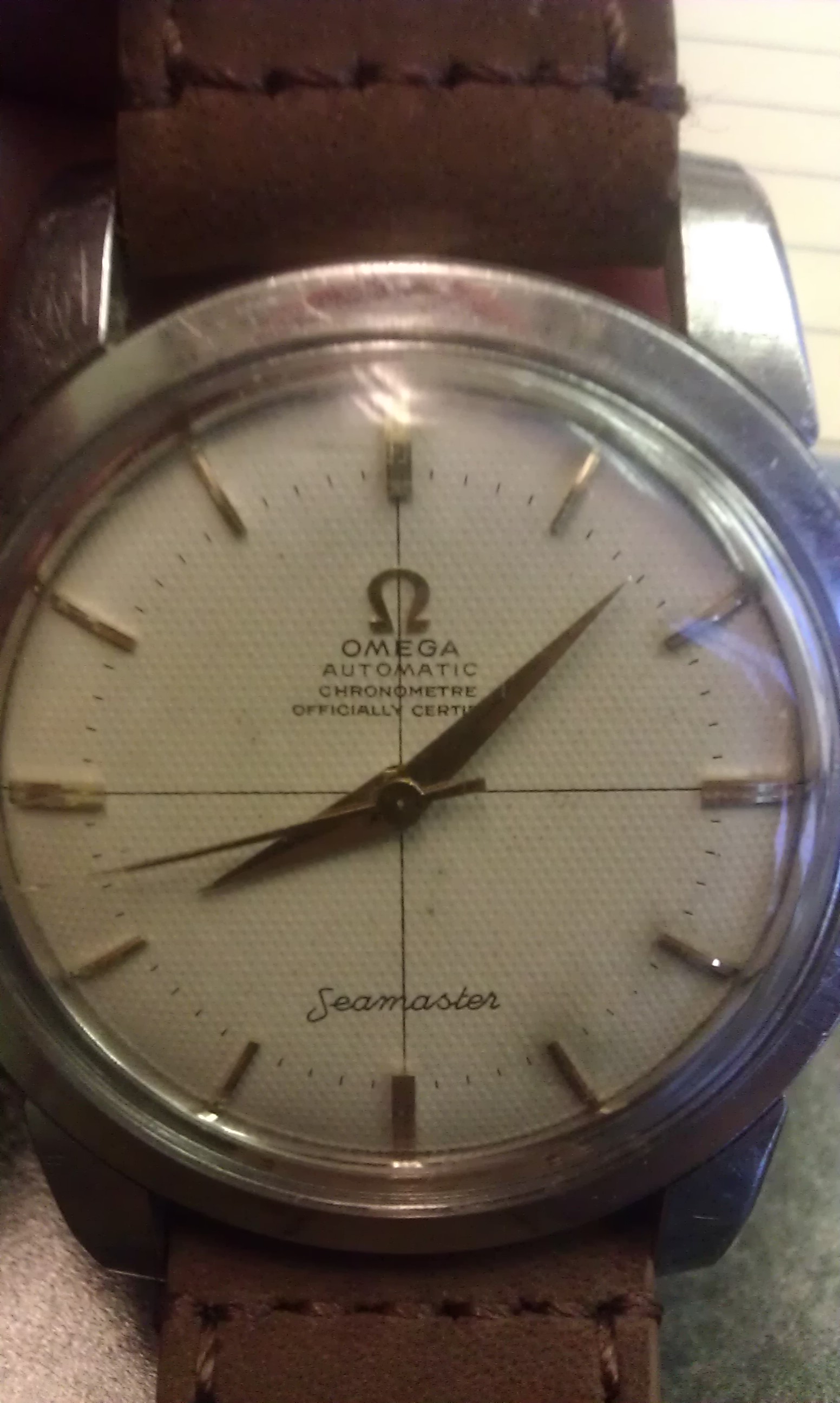 I'm looking for some more info on my grandfather's 1953/54 Seamaster Officially Certified Chronometre (Sic) serial number 139xxxxxxxx. He bought it in Gibraltar in 1958 when the shops there were all still British, so it was used or just sat in the store for 5 years. The crown may be stock, but obviously isn't the standard (Obviously there are discrepancies in the Omega world). Guilloche/waffle texture with crosshair. Dial has not been retouched in any way. The top of "swiss made" is just BARELY visible on the bottom, covered by bezel. The bezel is flatter than most I've seen. Crystal is a replacement omega period crystal, obvious scratches and marks.Also, the typography of both the top section and bottom section are unusual, with the "Automatic: and "chronometre" aligned at the edges like a box, and I have found an EXACT match to the "S" in the SEAMASTER in only 1 other watch online, it is not as curvy as most you see. Slight staining on the 4 and 5 oclock batons. It runs but doesnt keep the best time, about 15 seconds a day. Basically I am interested in how much you guys think it may be worth, given that it is a combination of chronometre, crosshair, and guilloche, and I haven't seen another piece with all three of these desirable characteristics in the hundreds and hundreds of watched I've looked at online. Any comments and thoughts are appreciated!