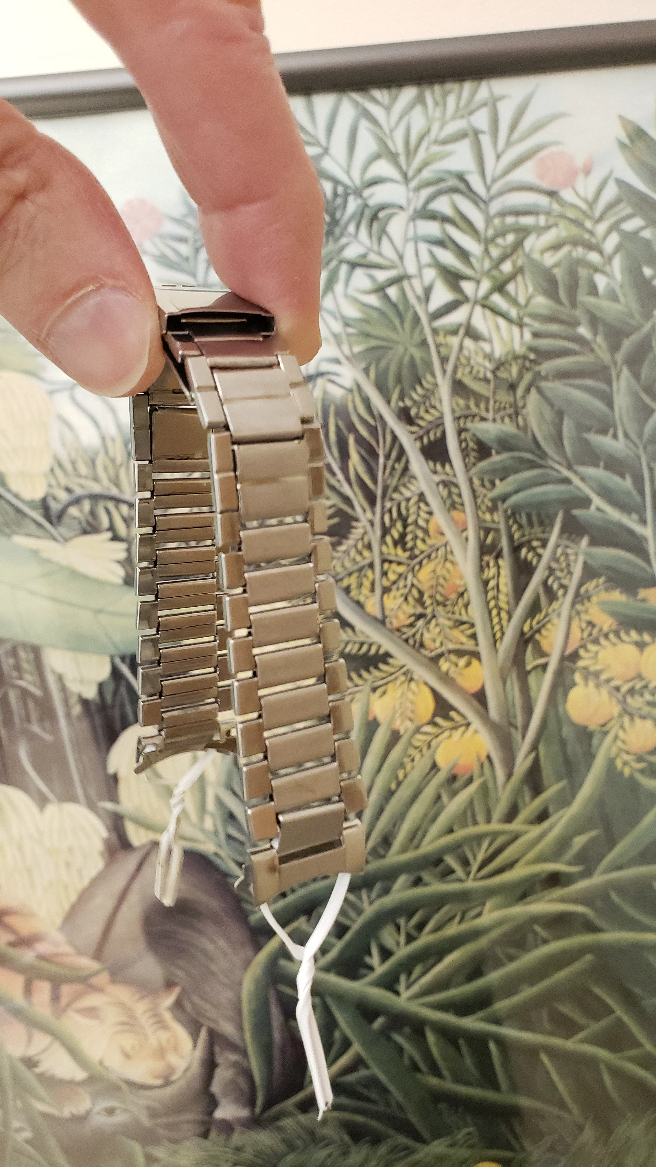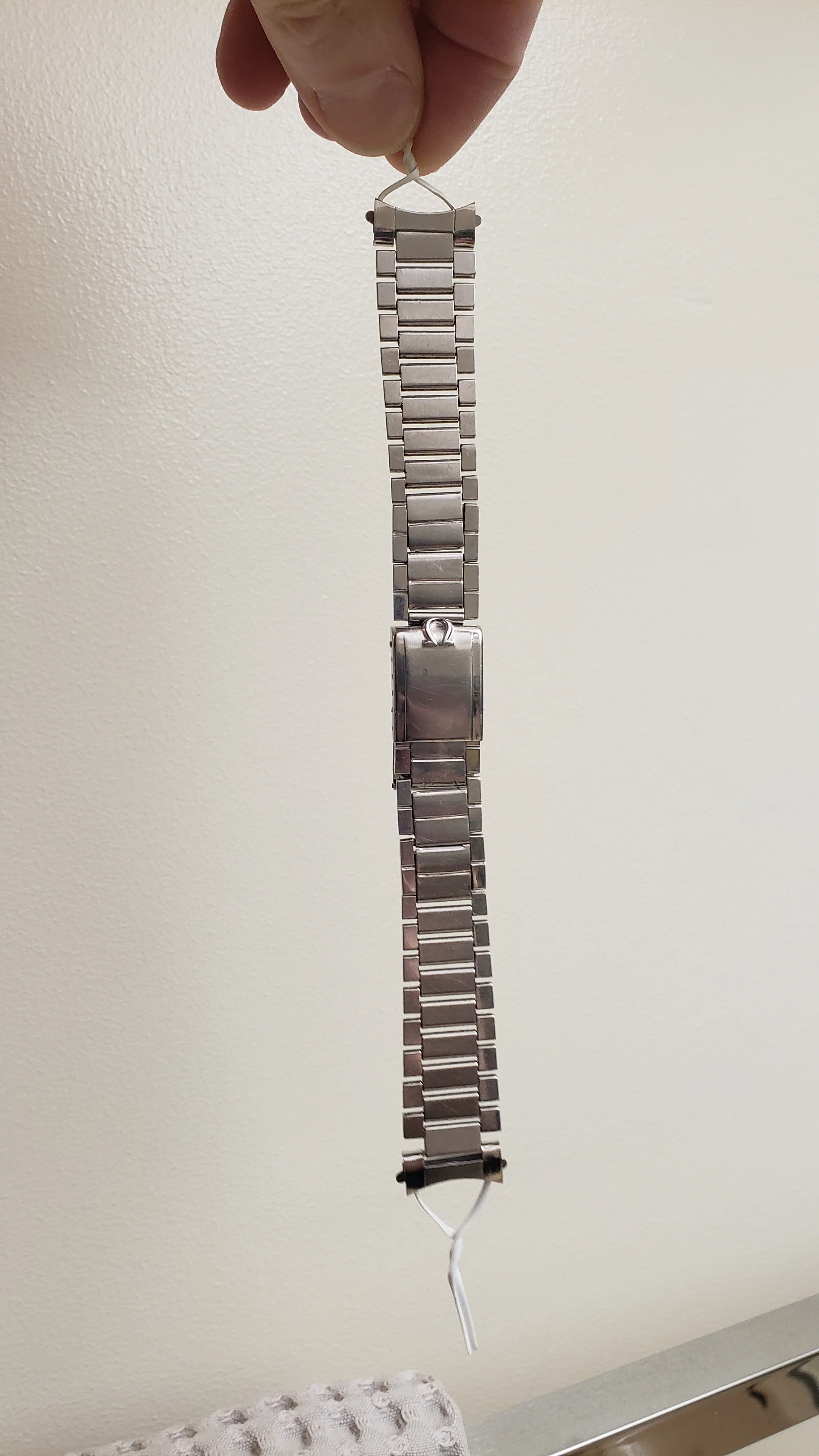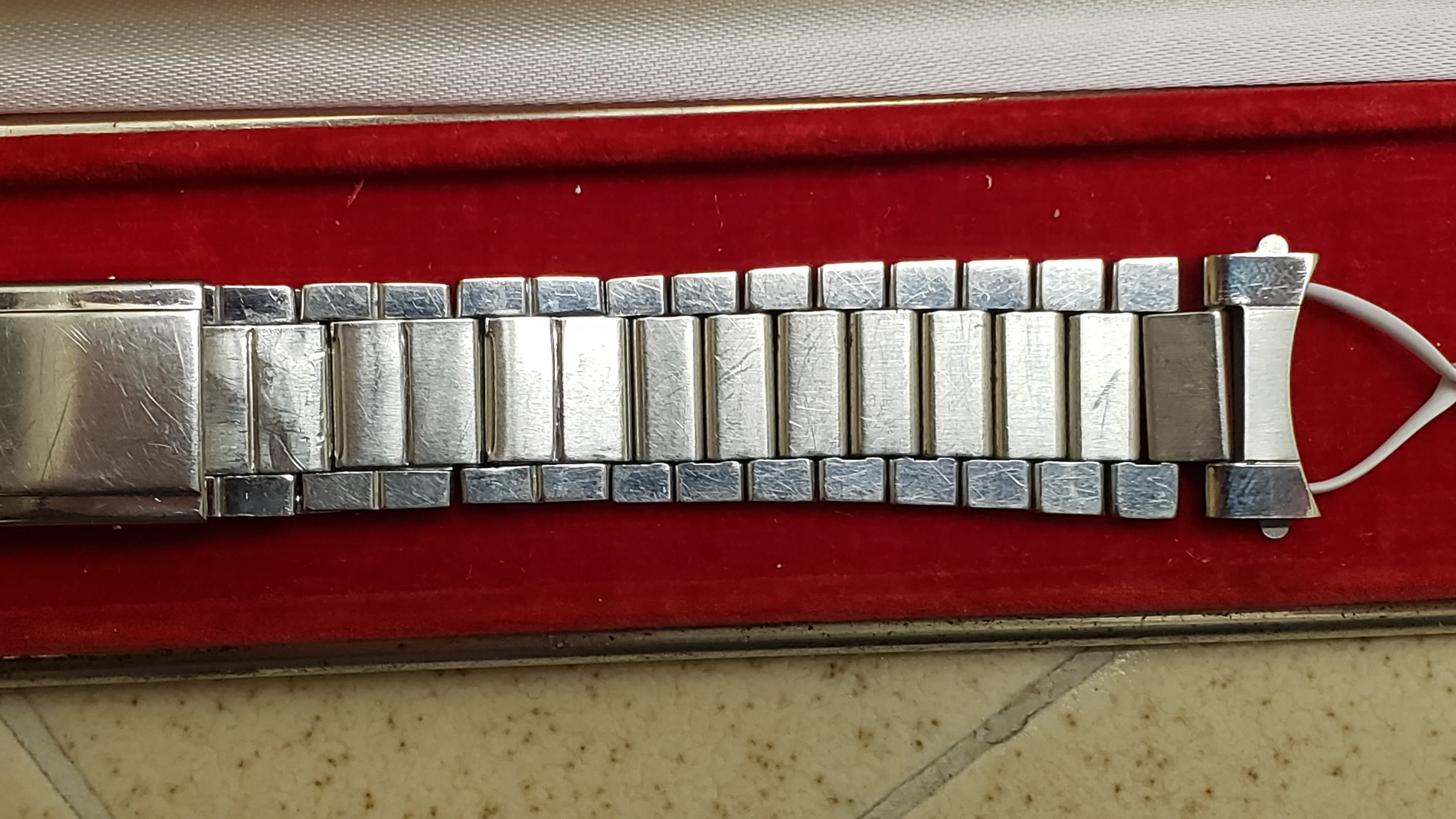 It has a minimal amount of stretch on the 16 solid permanent solid links and the total 5 double spring links have functional springs and stretch and rebound relatively well. The bracelet is unpolished and a couple of the expanding spring links have some wear from previous heavy-handed attempts to open/close the spring compartment.