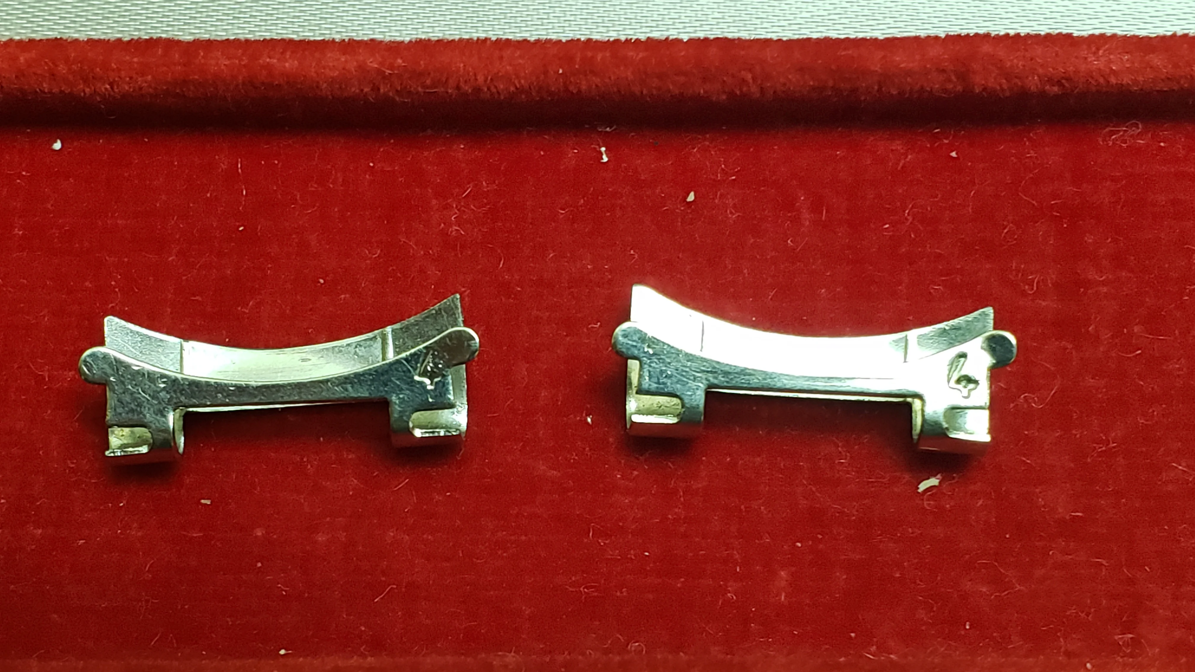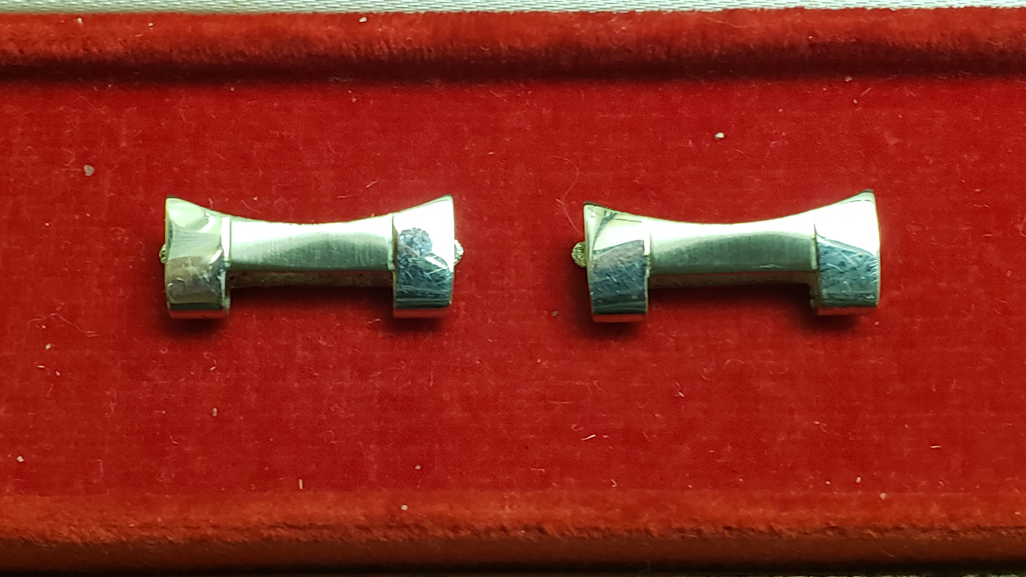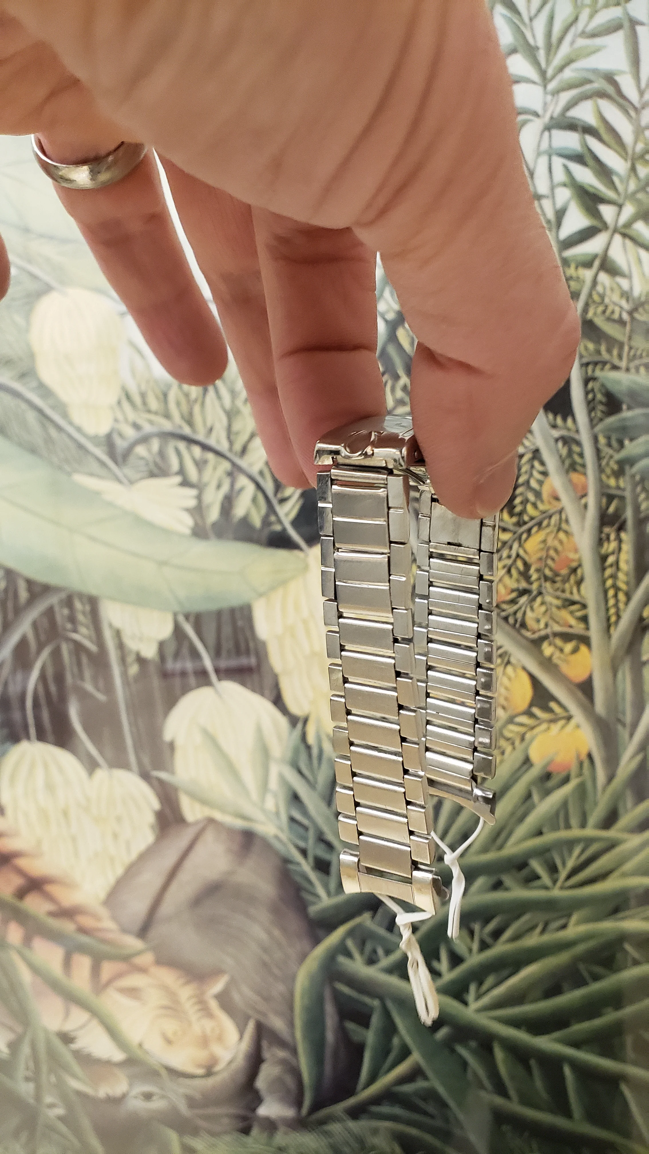 It has a minimal amount of stretch on the 16 solid permanent solid links and the total 5 double spring links have functional springs and stretch and rebound relatively well. The bracelet is unpolished and a couple of the expanding spring links have some wear from previous heavy-handed attempts to open/close the spring compartment.