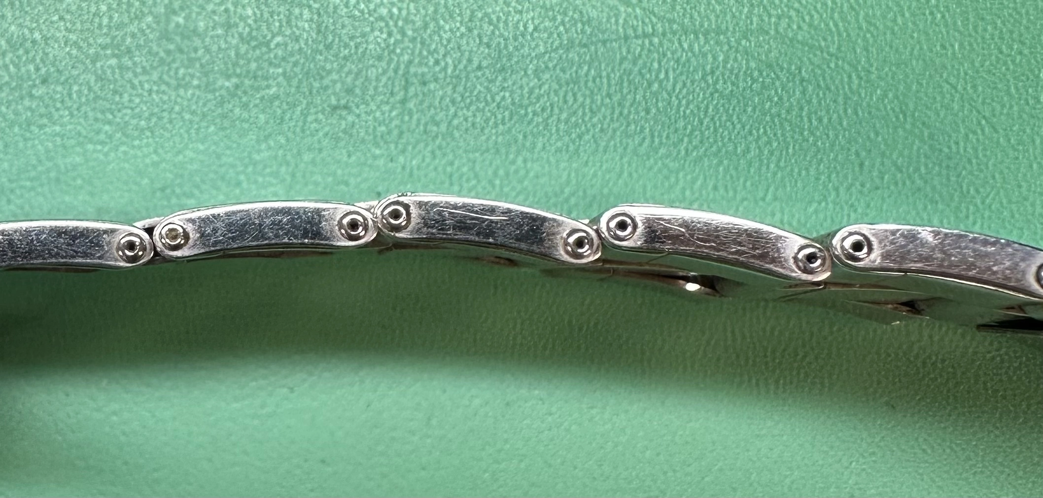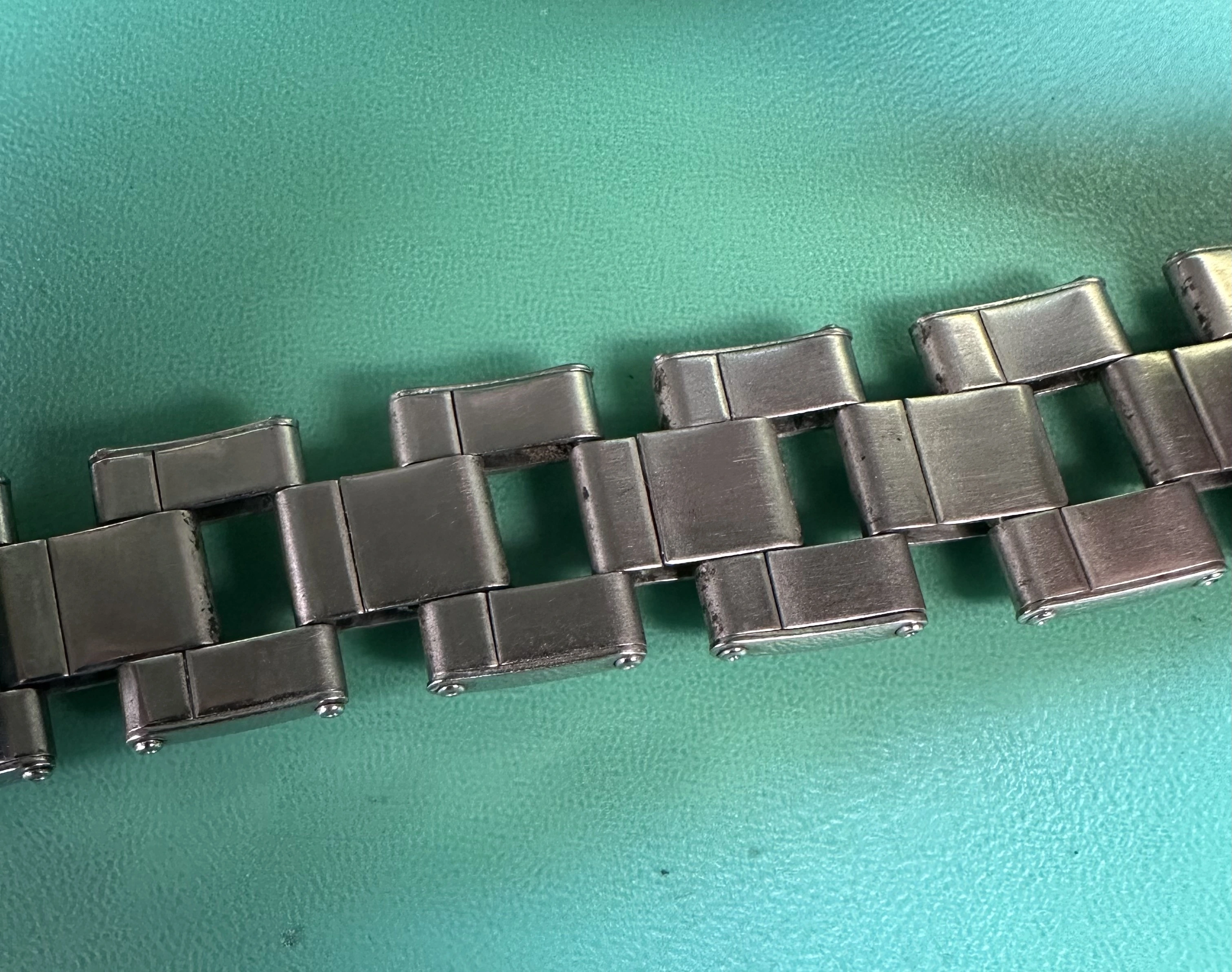 Ideally, I would like to do a full restoration by grinding off the rivets, replacing the springs, and re-riveting the links. However, I have yet to find a source for these rivets. The Swiss bracelets have standard rivets, which can be easily replaced if removed. However, the US bracelets have hollow rivets. Any idea if these can still be purchased somewhere? Worst comes to worst, I will go the route of bending open the folded links, but don't love doing it.