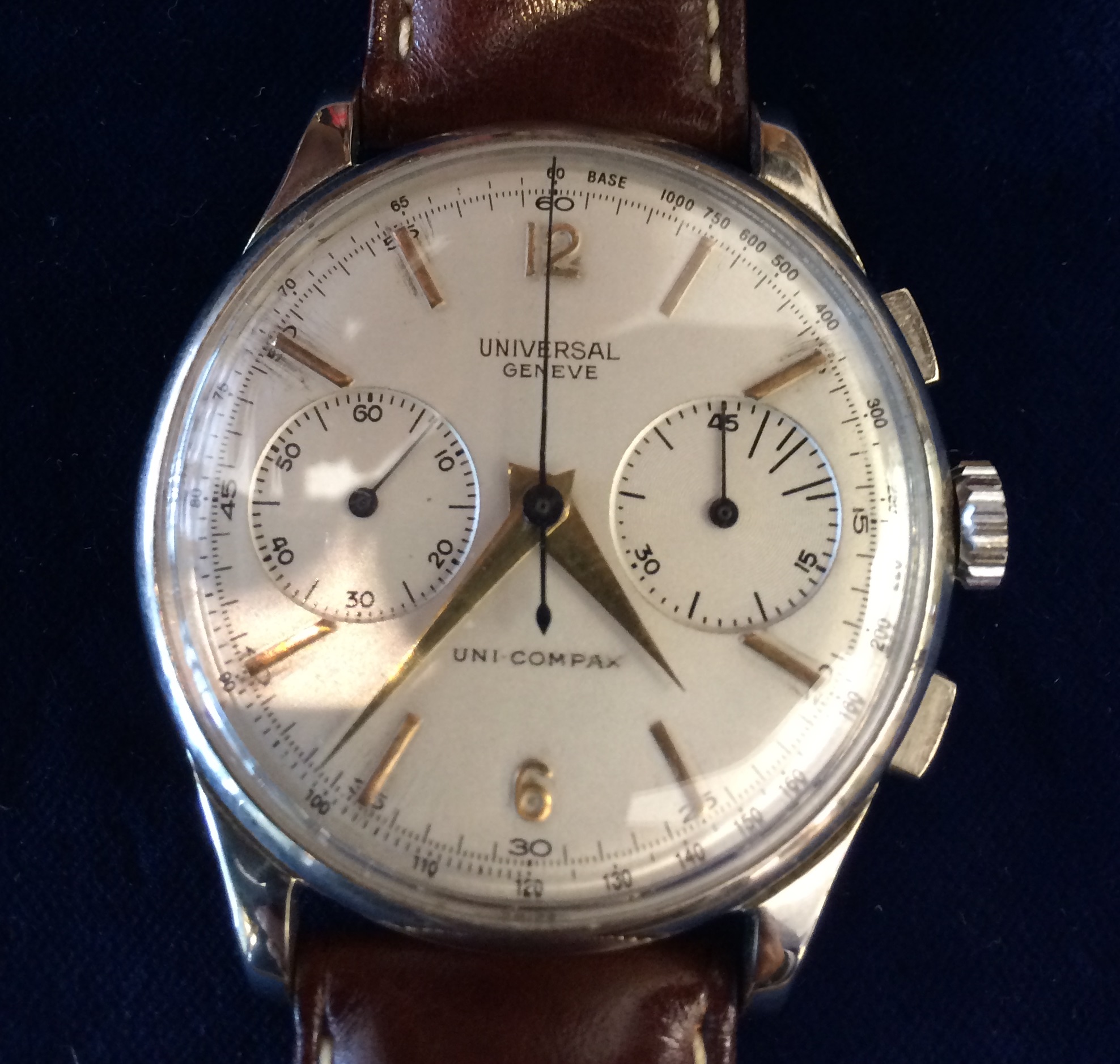 I recently came across this 1960s (?) Uni Compax in a small shop in Zurich. The seller claims it's "all original", however to me the dial looks retouched. What put me off is the smeared "x" in "compax", the thick markers in the subdials, and what seems to be abrasion around the hour markers.