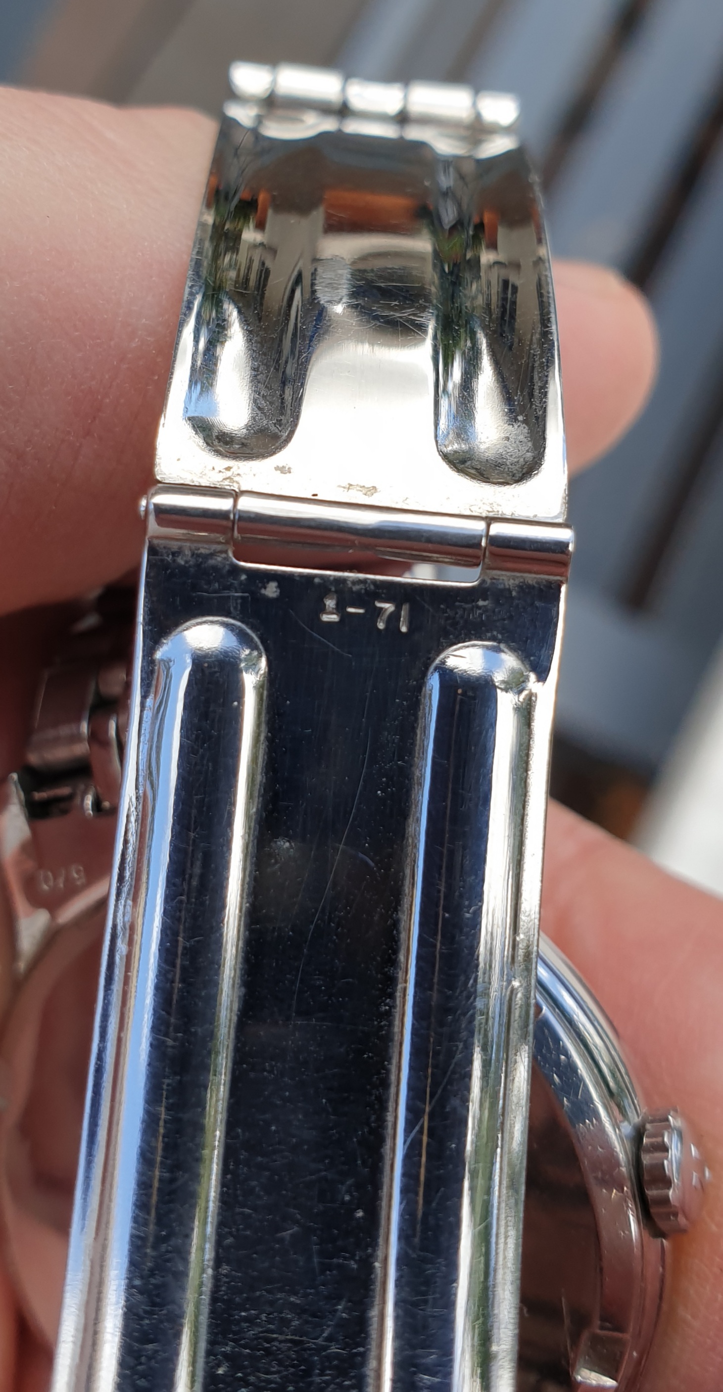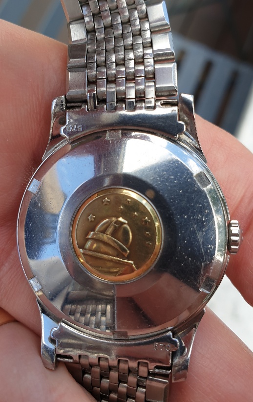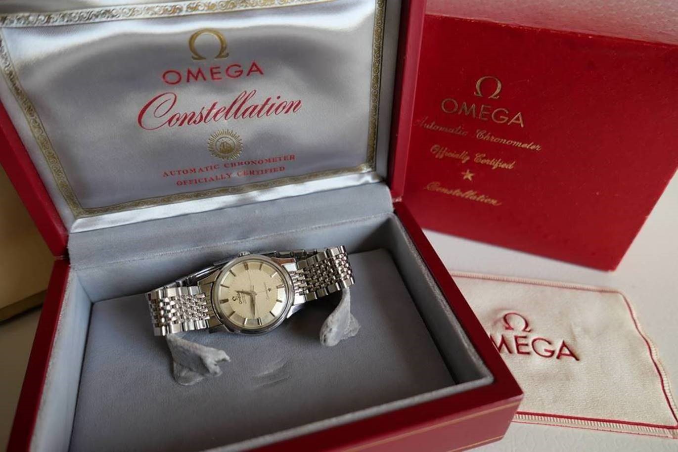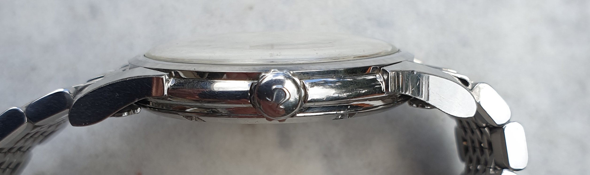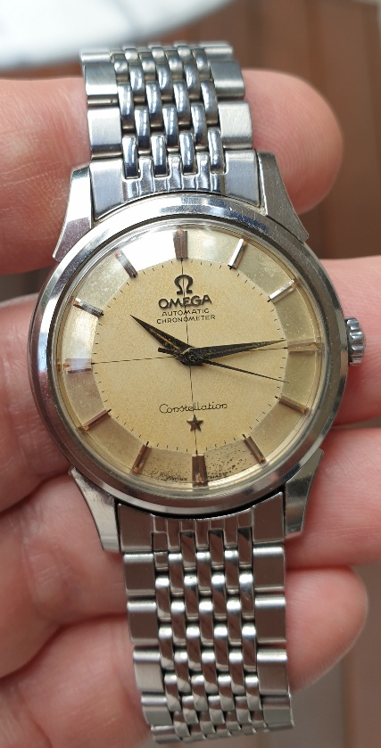 For Sale - 1961 Omega Pie Pan Constellation 14381-7SC with Box. The dial has a creamy champagne tone, some discolouration at the 6 o'clock position. Nice Omega BOR 1037/ 570 band, 1/71. A superb slim line dress watch.