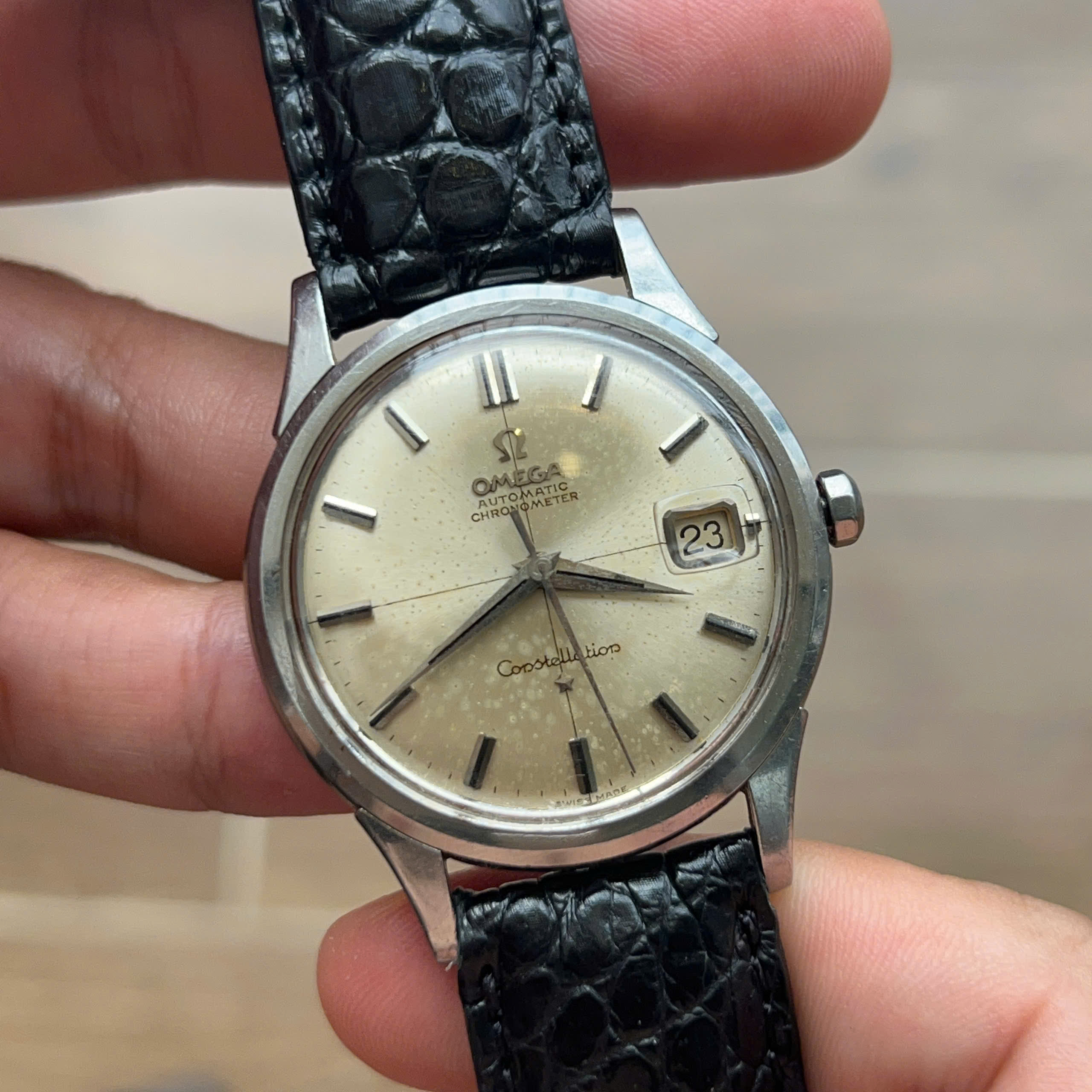 - Movement: Omega Cal. 561, watch is running, winding is smooth, date jump as it should, semi quickset date checked. Service history is unknown. Serial number is in 19 mils range, which dated the watch to aproximately 1962.