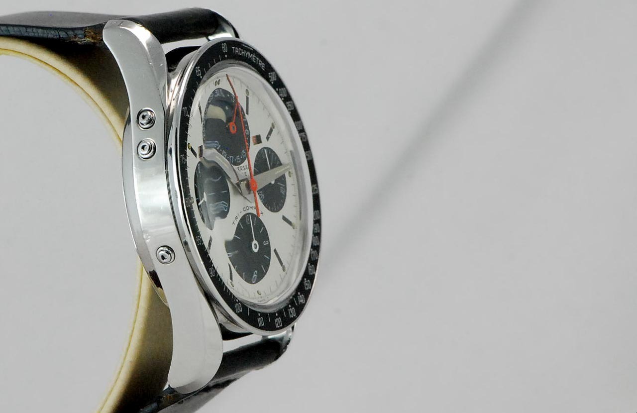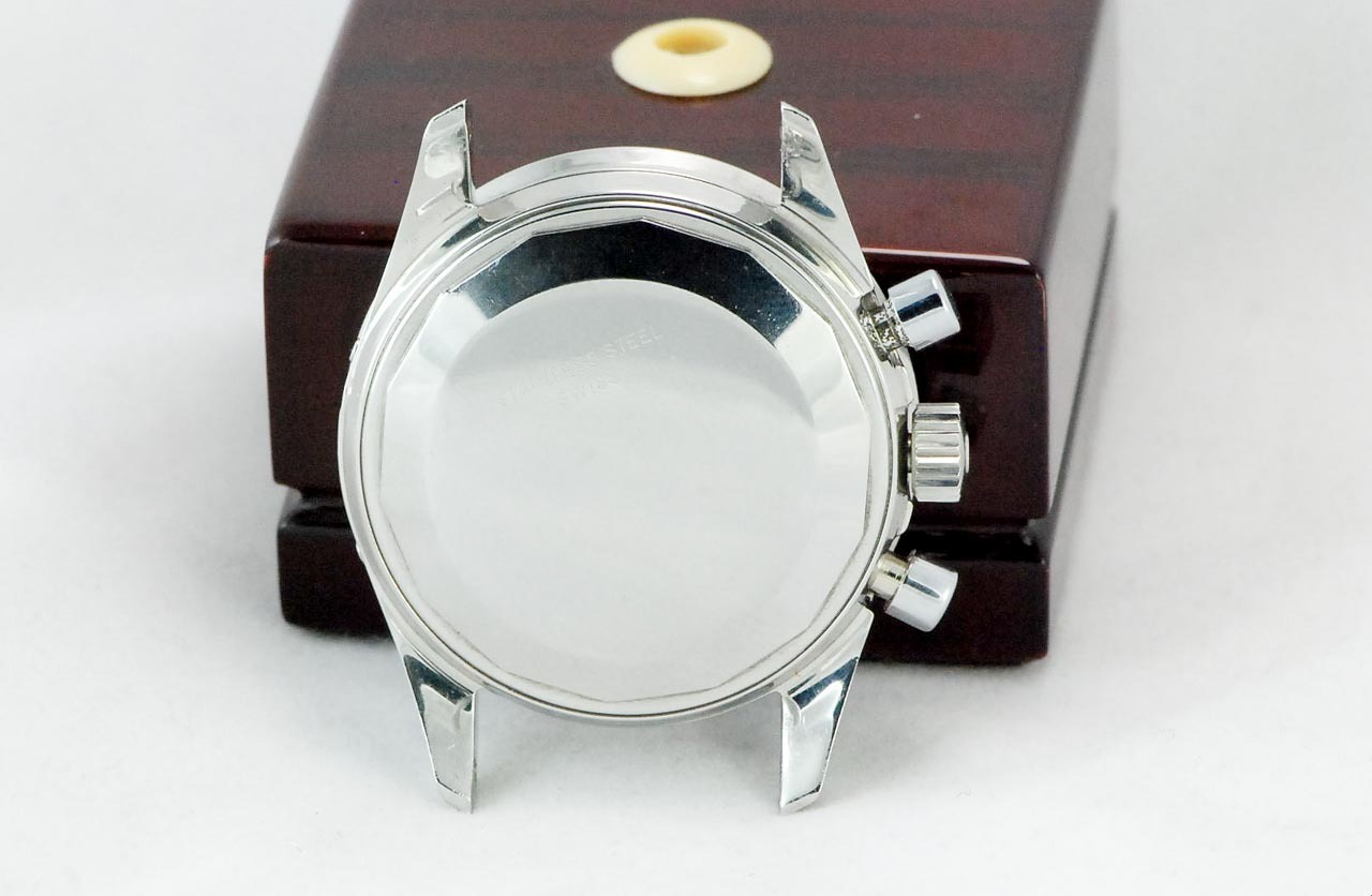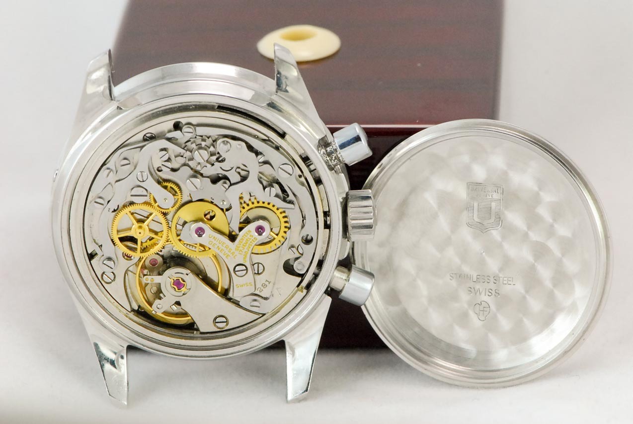 Case: Solid stainless steel waterproof screw down caseback. Beautiful twisted lugs design was contemporaneous with the well known Omega Speedmaster. Signed inside with the Universal Geneve logo. Case back contains the serial number and reference number.