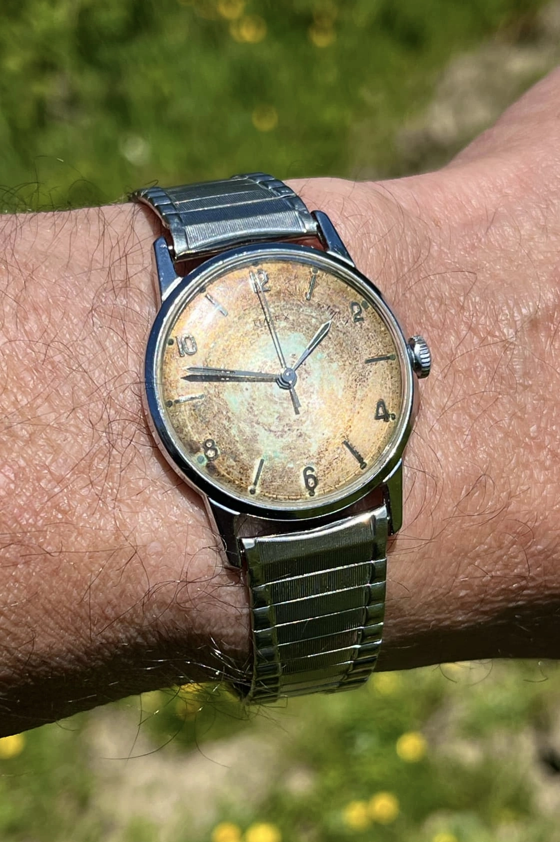 Posts 113 Likes 568 dinglem ·May 18, 2025 Another every day watch for me, but with a stand-out ‘Black Hole’ patina and original ‘66 bracelet. Amazing how different it looks in natural light.