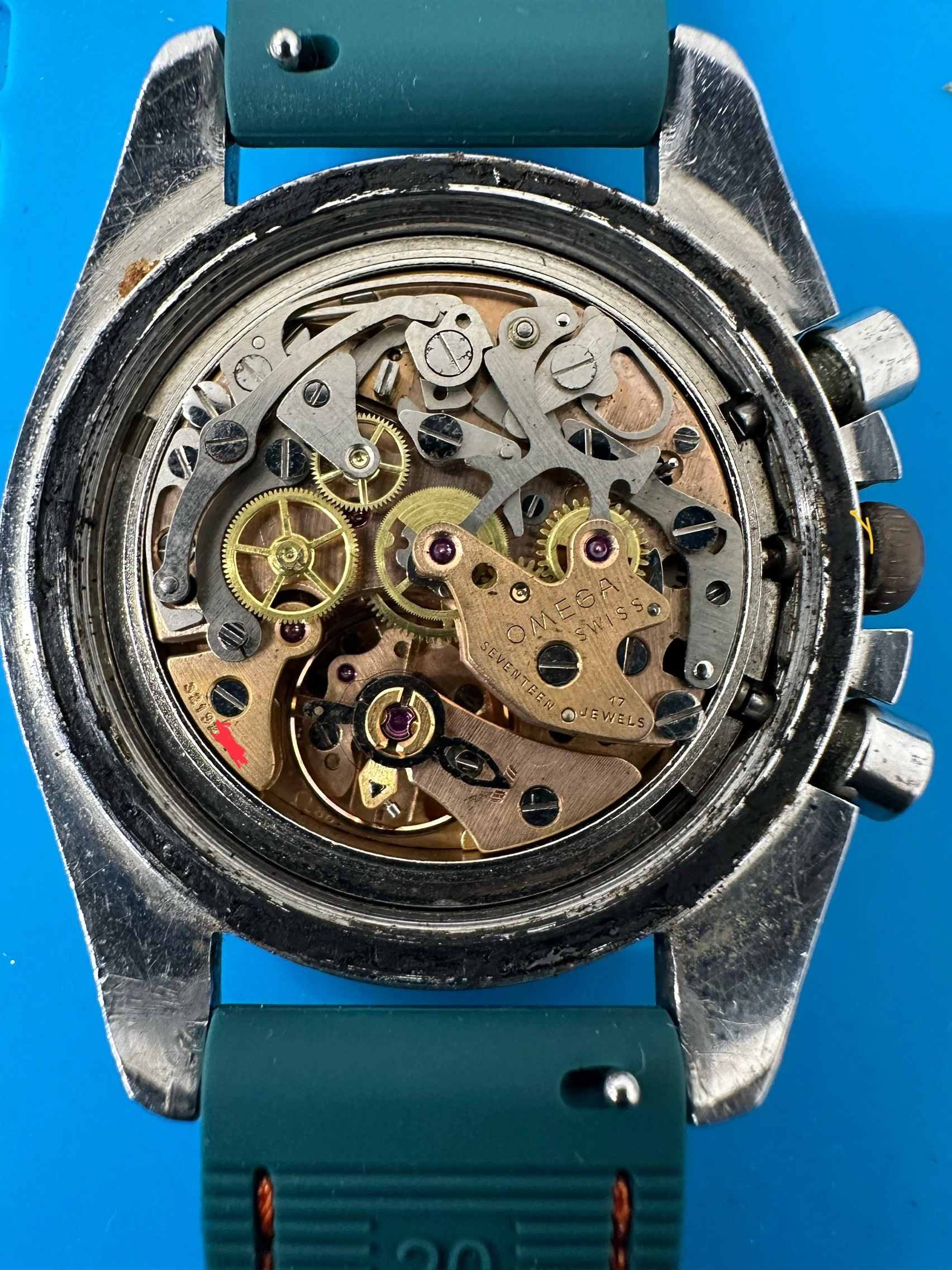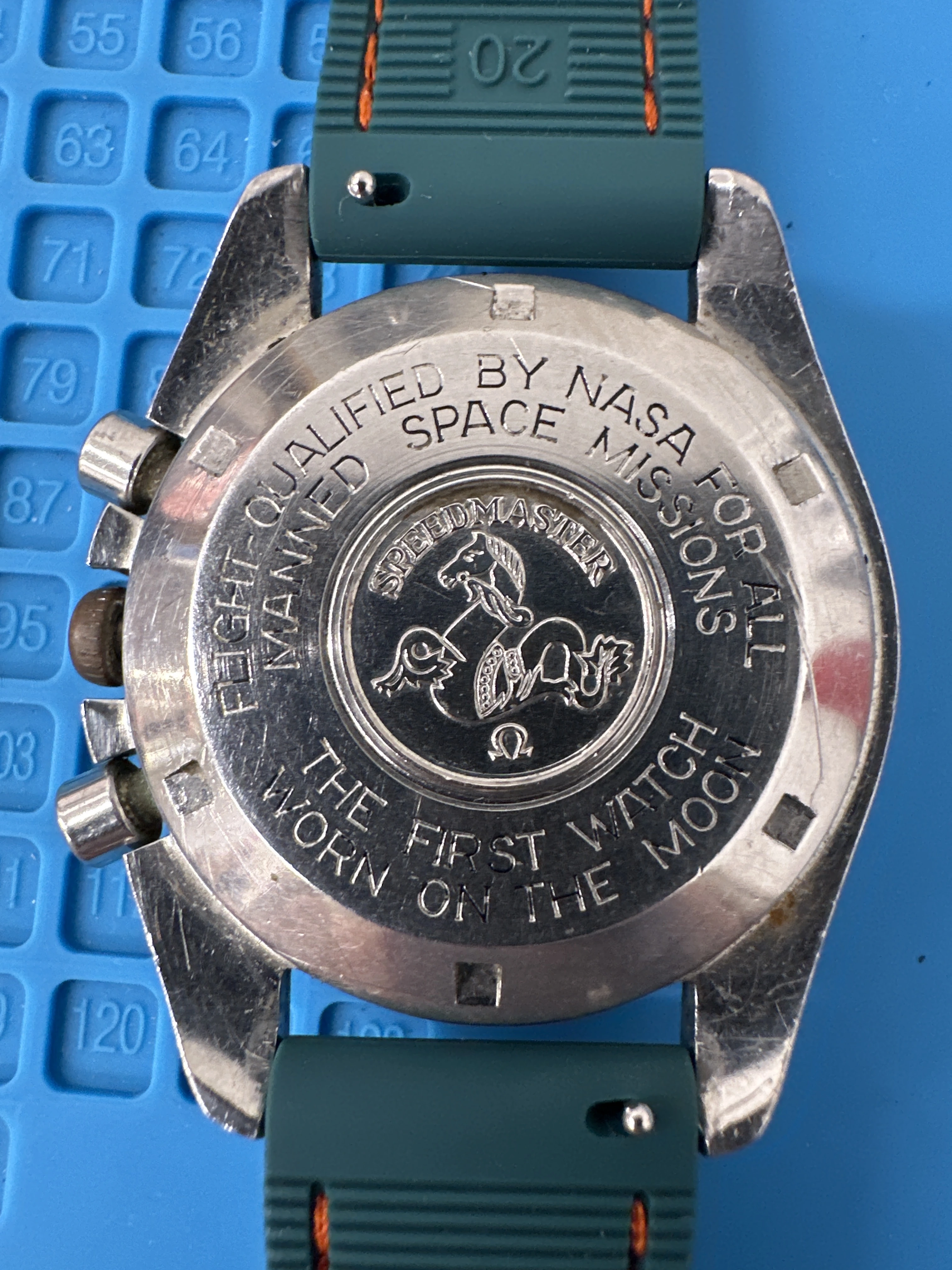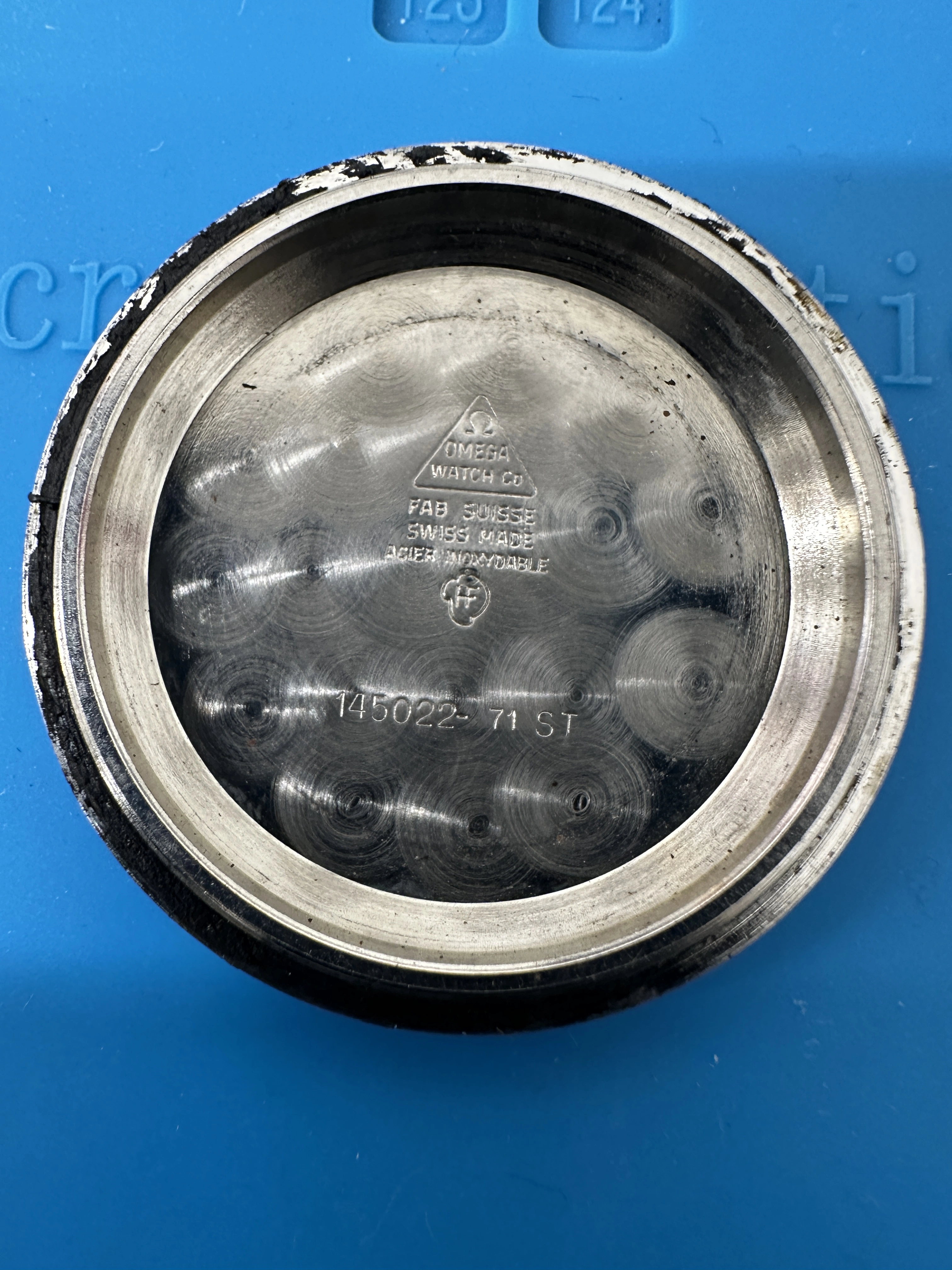 I’m making my first post after spending the afternoon lurking on this forum. I’m having trouble determining whether this omega Speedmaster ref 1455.022- 71 I was offered the other day is worth the $2.5k usd it has been offered to me for. I’ve been wanting one for a while. It needs a service, could probably use a new crystal (this one’s been extensively polywatched), the gasket is tar, etc. The chrono hand and crown are clearly replacements. The watch runs and the chrono hand is smooth/ quickly jumps back to 12:00 when prompted.
