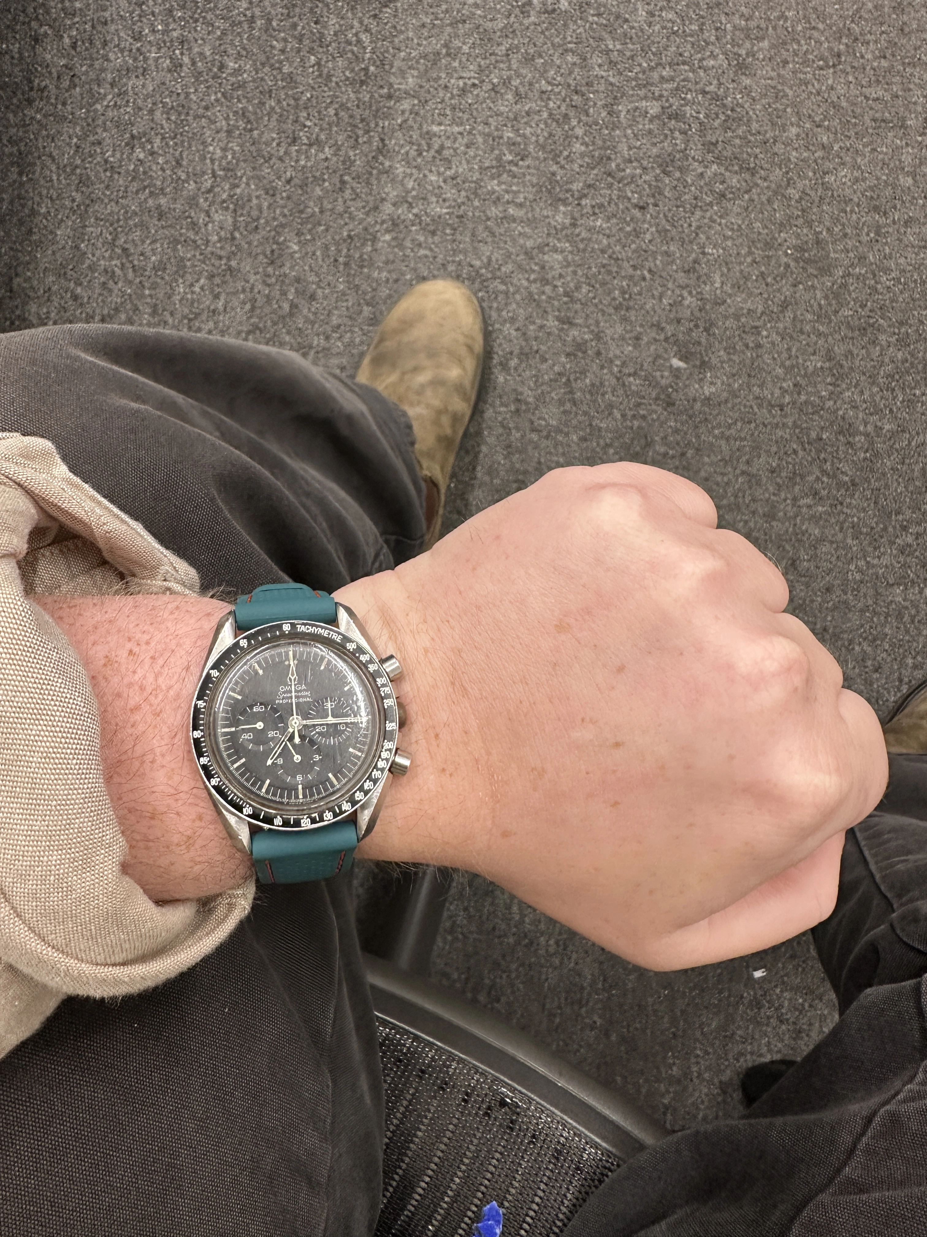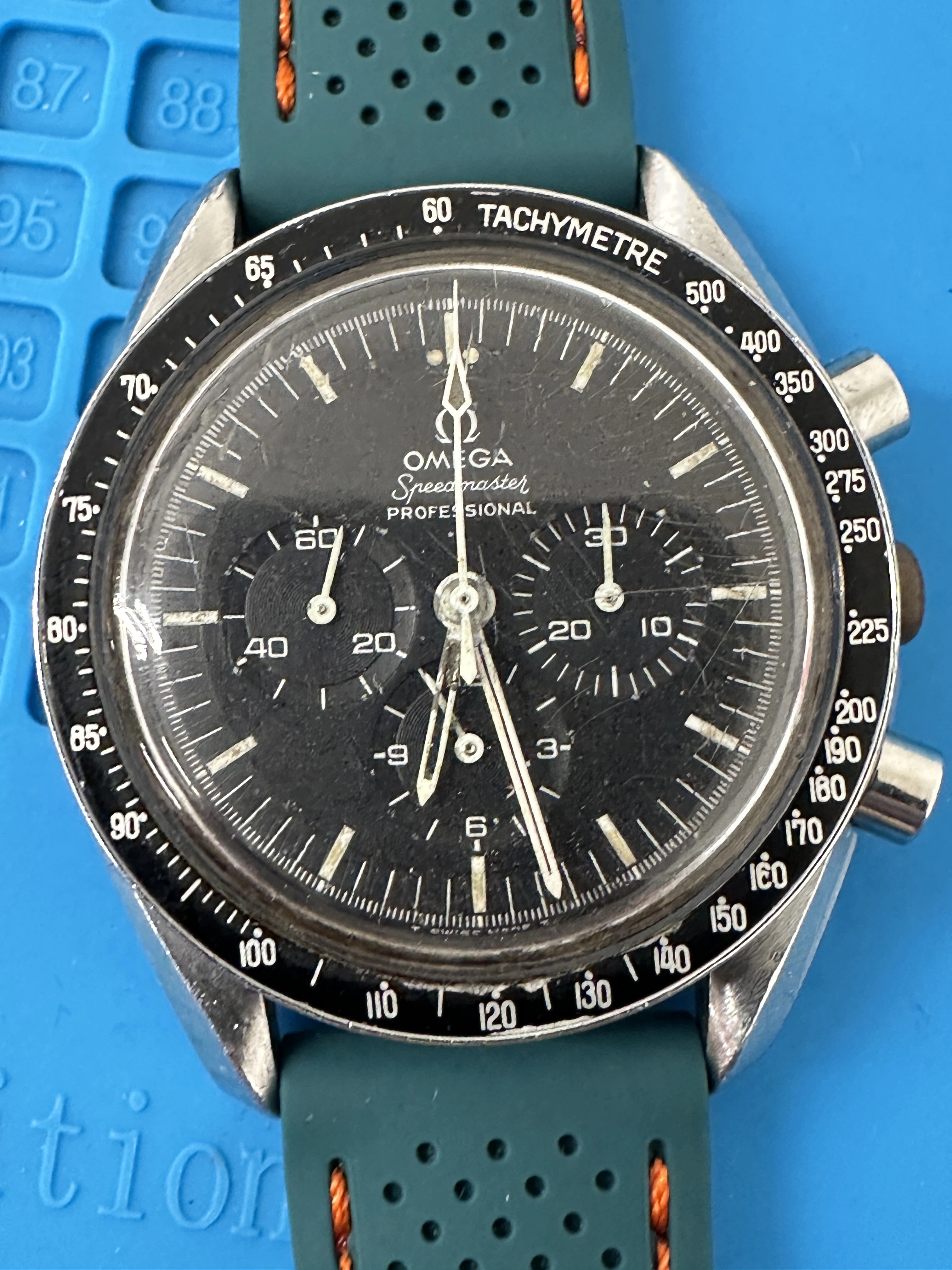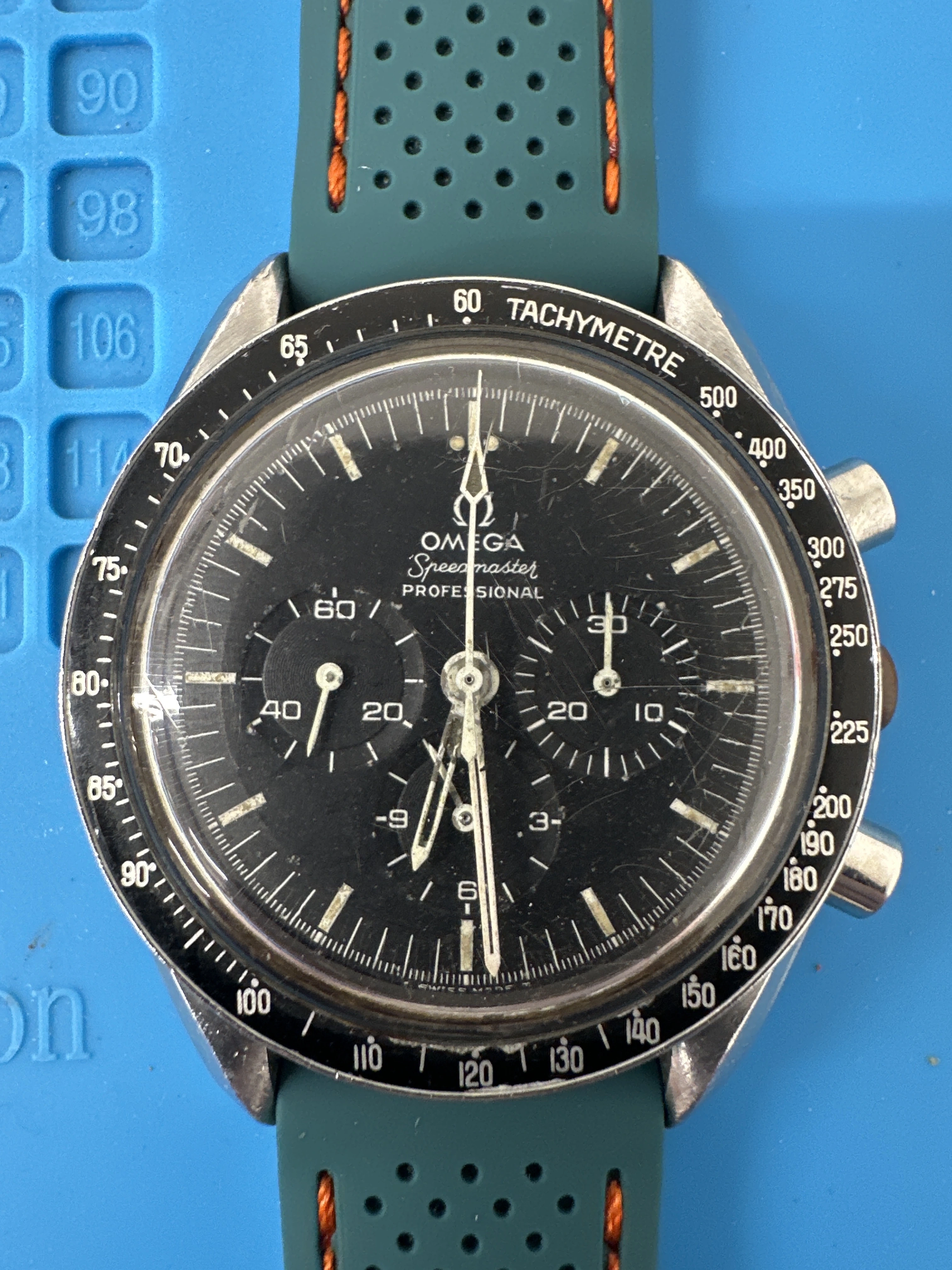 The dial has white marks near the sub seconds, hands are missing lume, and the remaining lume is grubby. I’ve looked at the Speedmaster 101 price chart and 2.5k seems to be relatively in line with a fair example of this model. I would only be getting the head and an aftermarket strap, unfortunately no bracelet. I wore it the other day and enjoyed it.
