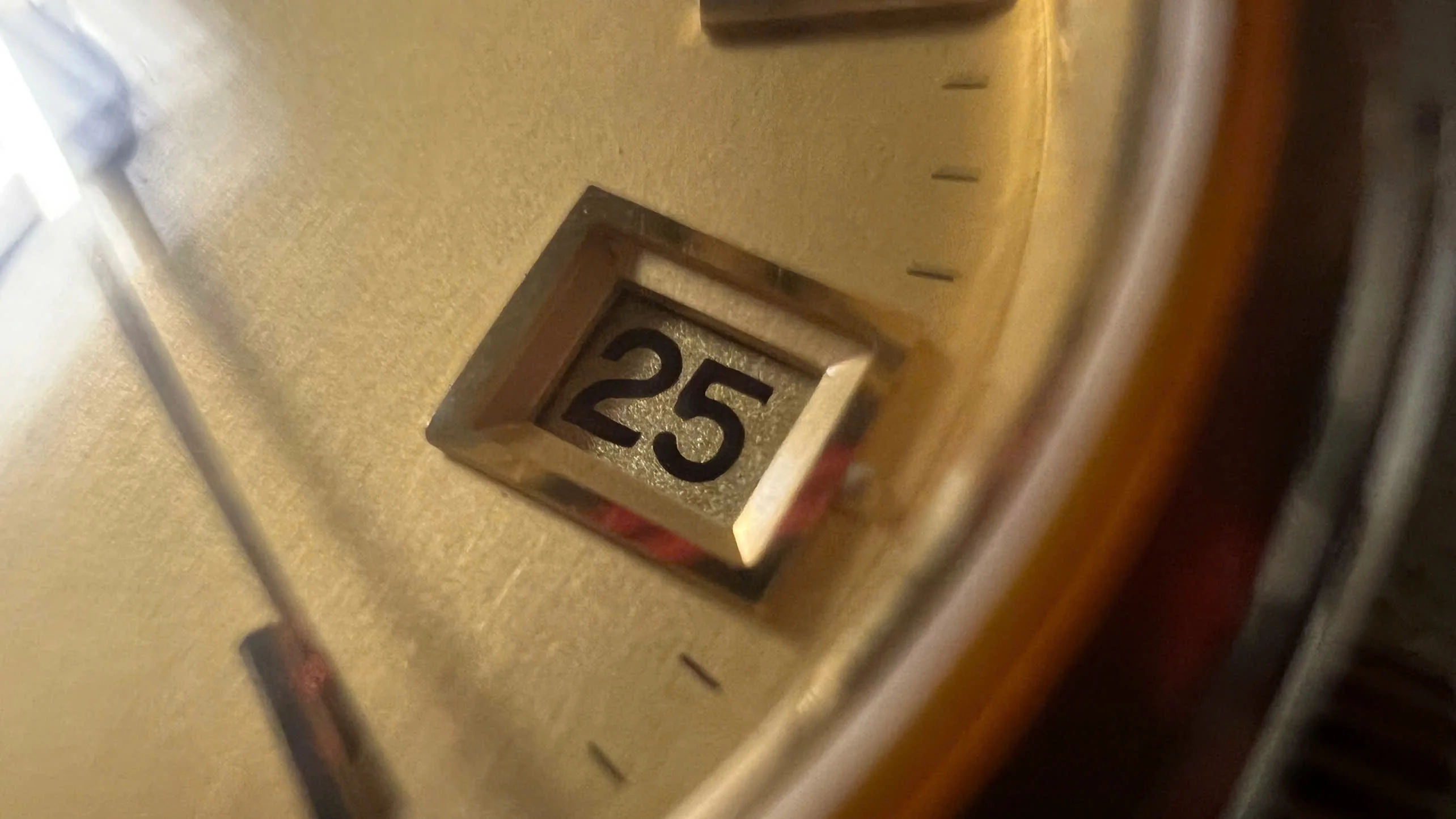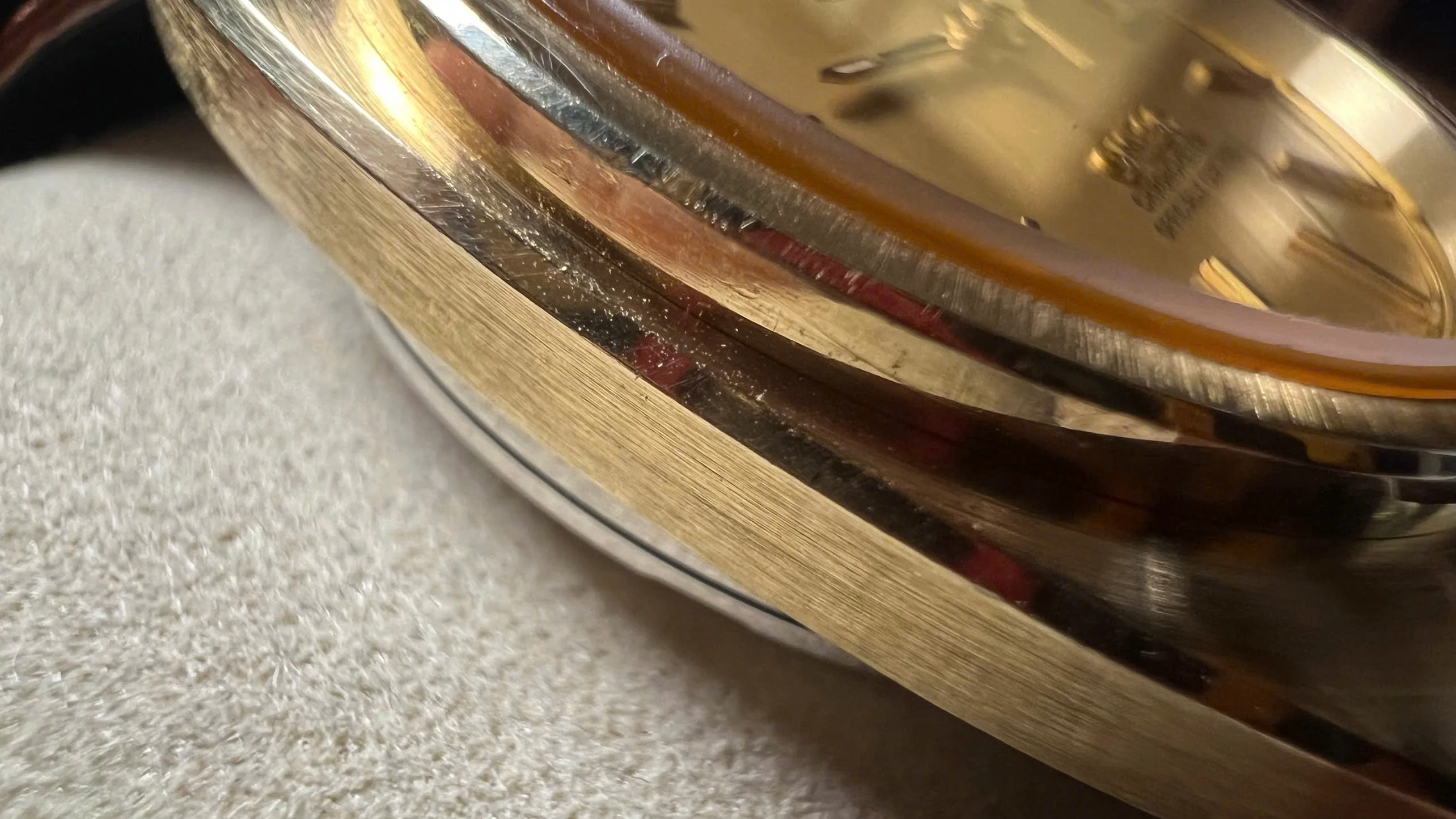 Case: 34.5mm gold-capped case with solid gold bezel and observatory medallion. Some light wear as expected, but overall sharp with good lines.