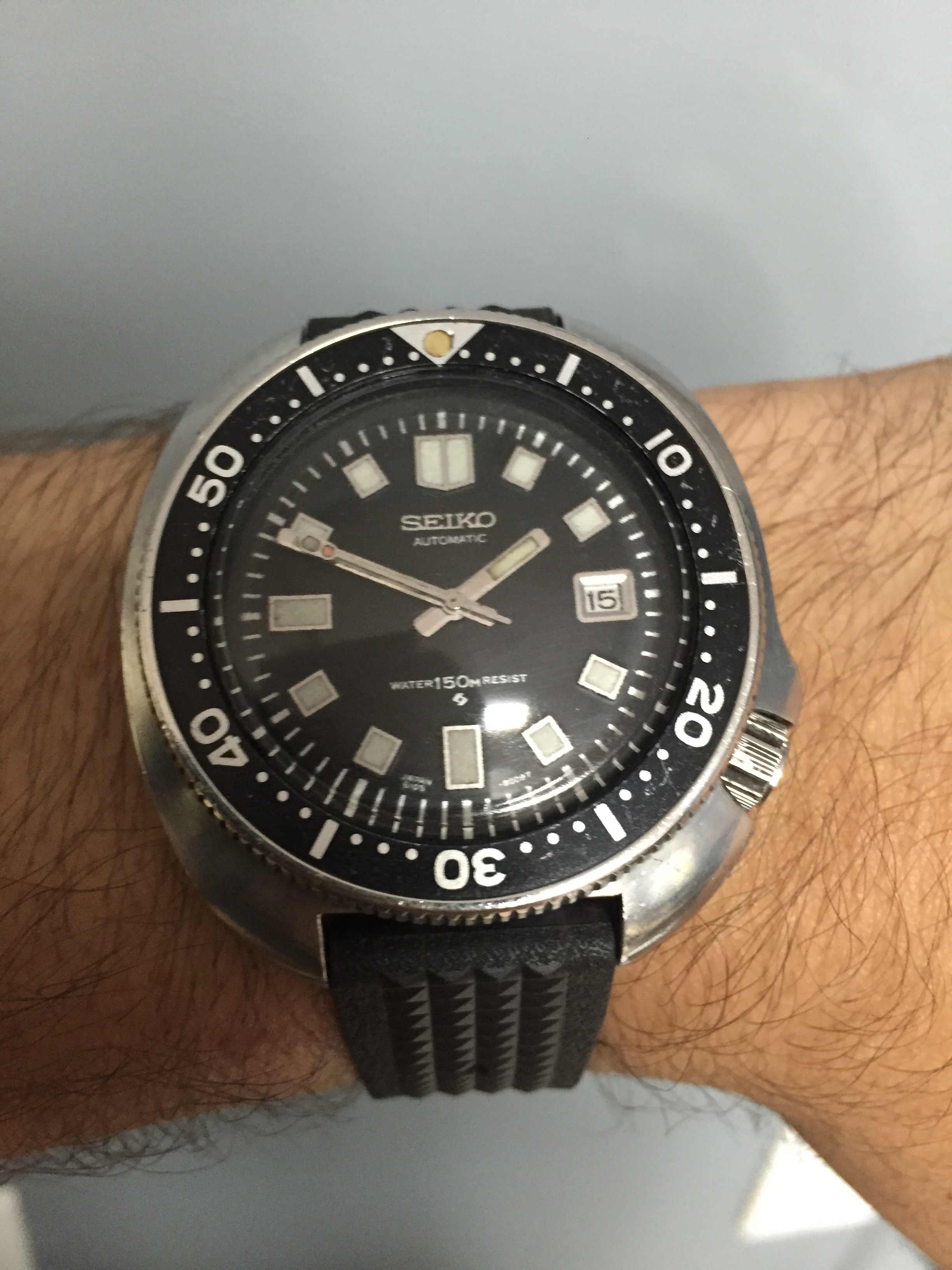 ·So I purchased this seiko at a great price from a client, and at the time cosmetically it appeared to be in rough shape. But the watch had good bones. After slapping on a new waffle diver strap, and polishing the original crystal, it looks amazing.