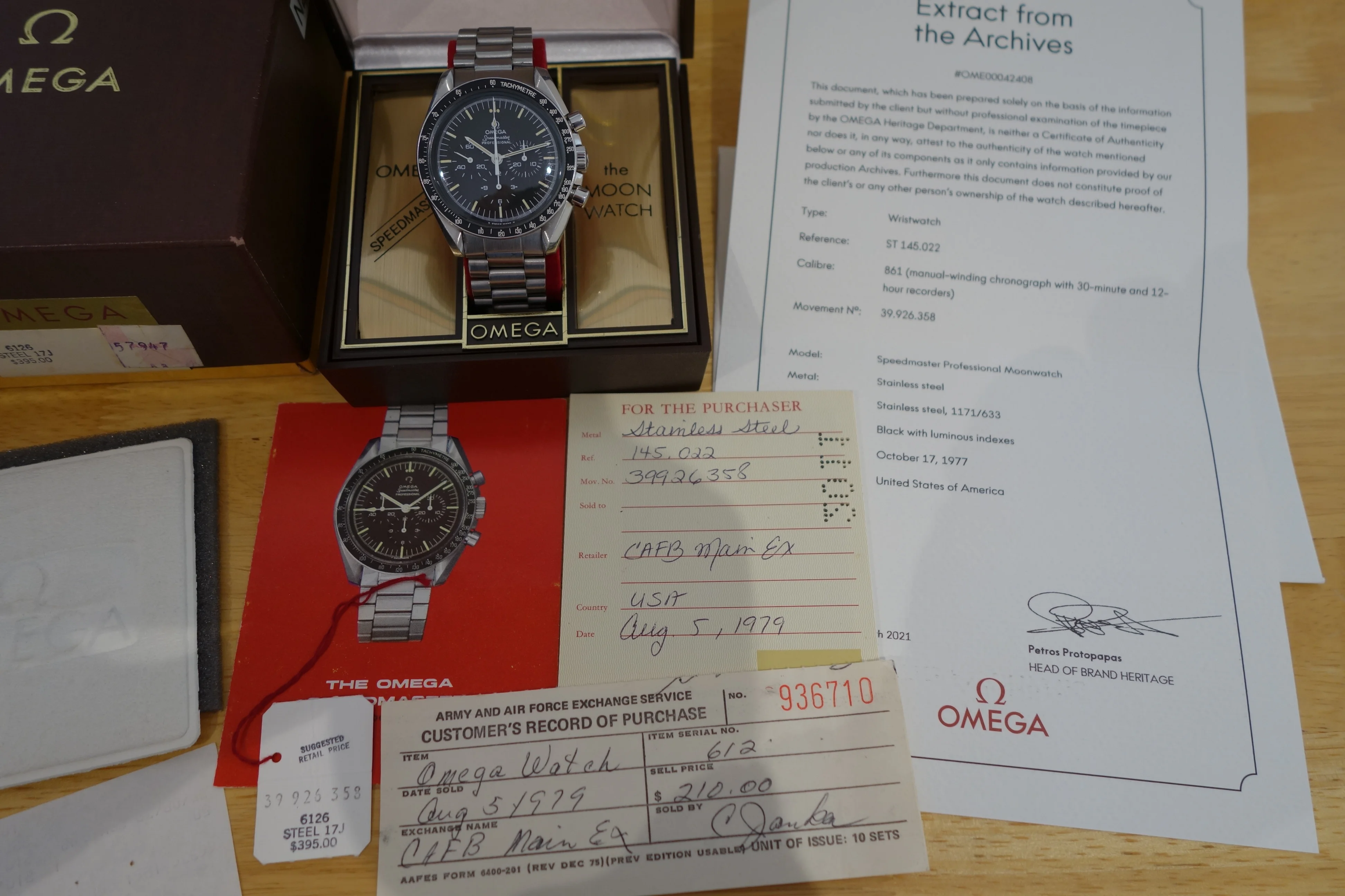 ACCESSORIES: Original box, booklet, warranty papers, hangtag, and Extract of the Archives showing production of October 17th, 1977 and delivery to the USA. This watch also comes with sales slips from CAFB, which is most likely Columbus Air Force Base, though Castle AFB and Cannon AFB are possibilities as well. Service receipts from 2023 are included as well. Overall, a fantastic package.