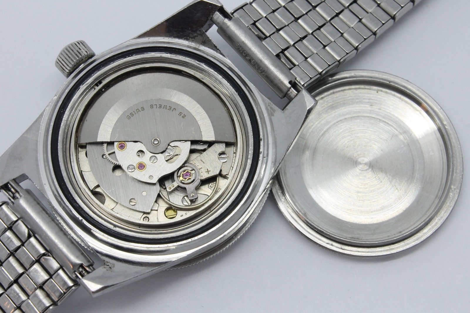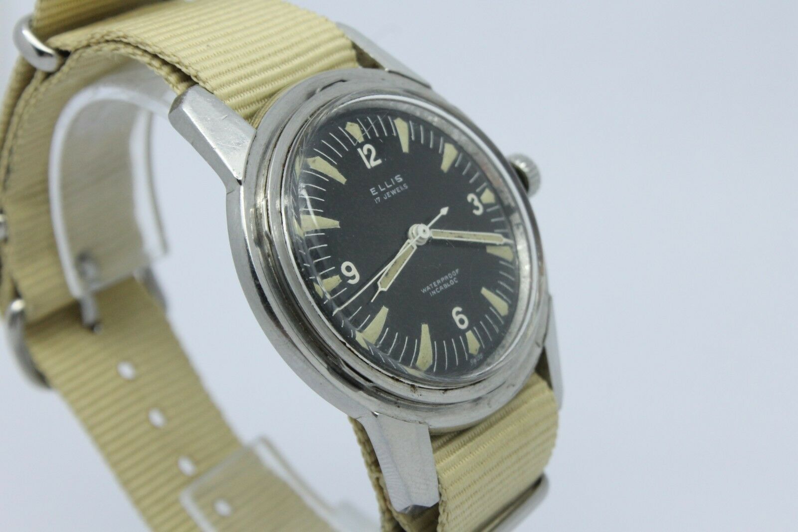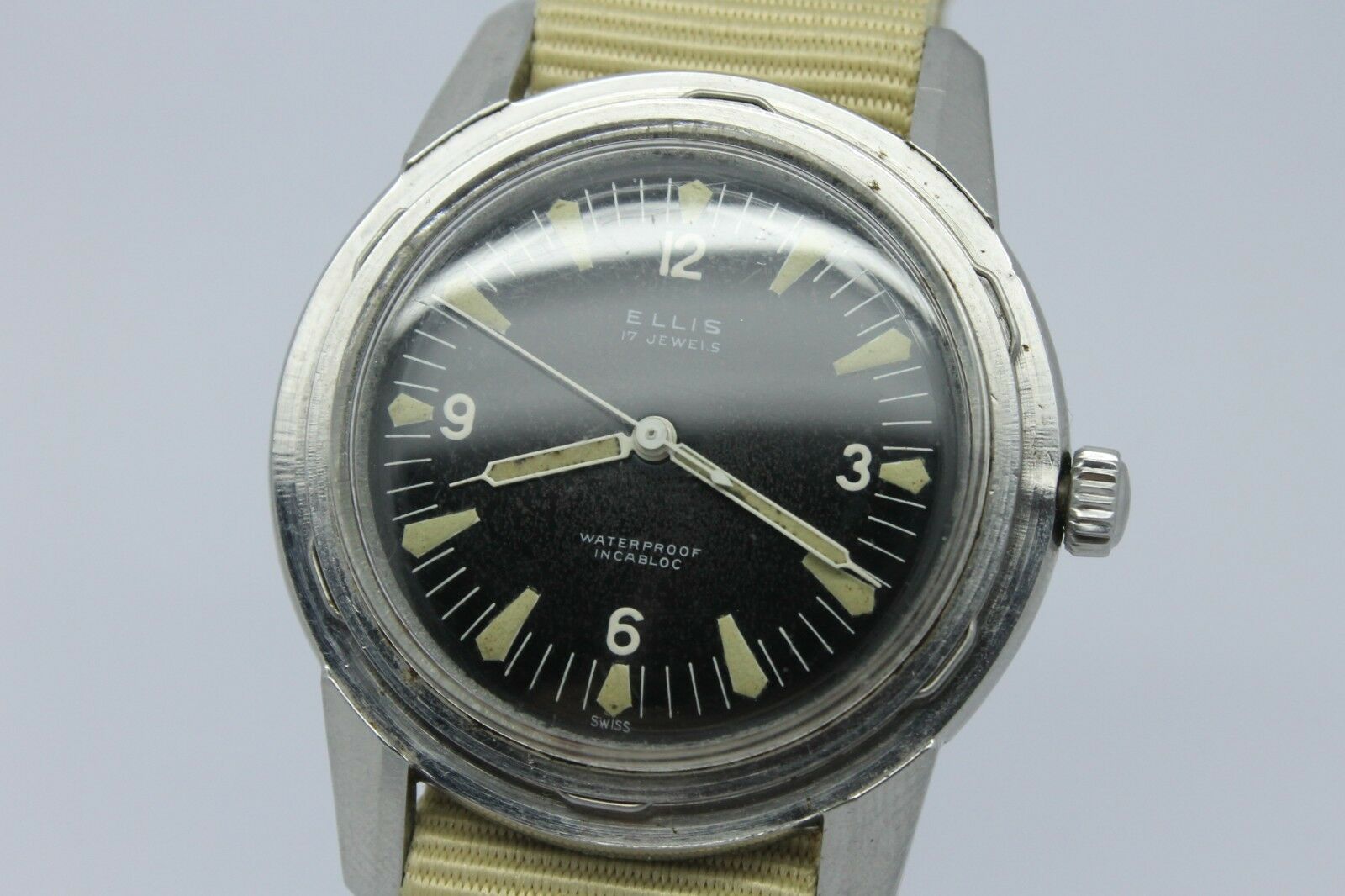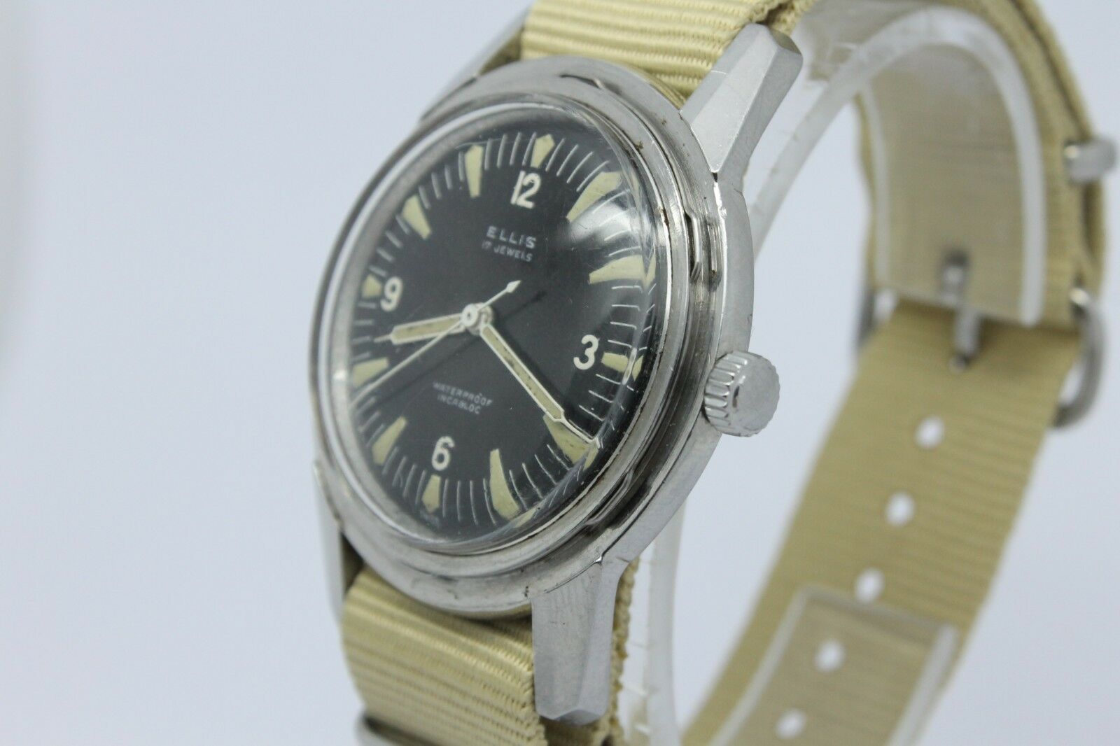 So the first one was made by the Ellis Watch Company - there seems to be very little about this company known - I couldn't even find anything on Mikrolisk for it. And it is missing it's bezel, but what really caught my eye was the case that seemed to be unique compared to any other vintage divers I've seen, and to my (complete novice) eyes seems to have a couple features that typically were on Spillman made cases - faceted lugs, and how the case back opens. But I can find no other examples of 3-hand dive watch Spillman cases to compare it to - all of the ones I see when I search are on chronographs. This is listed as being 40mm, even without the bezel!