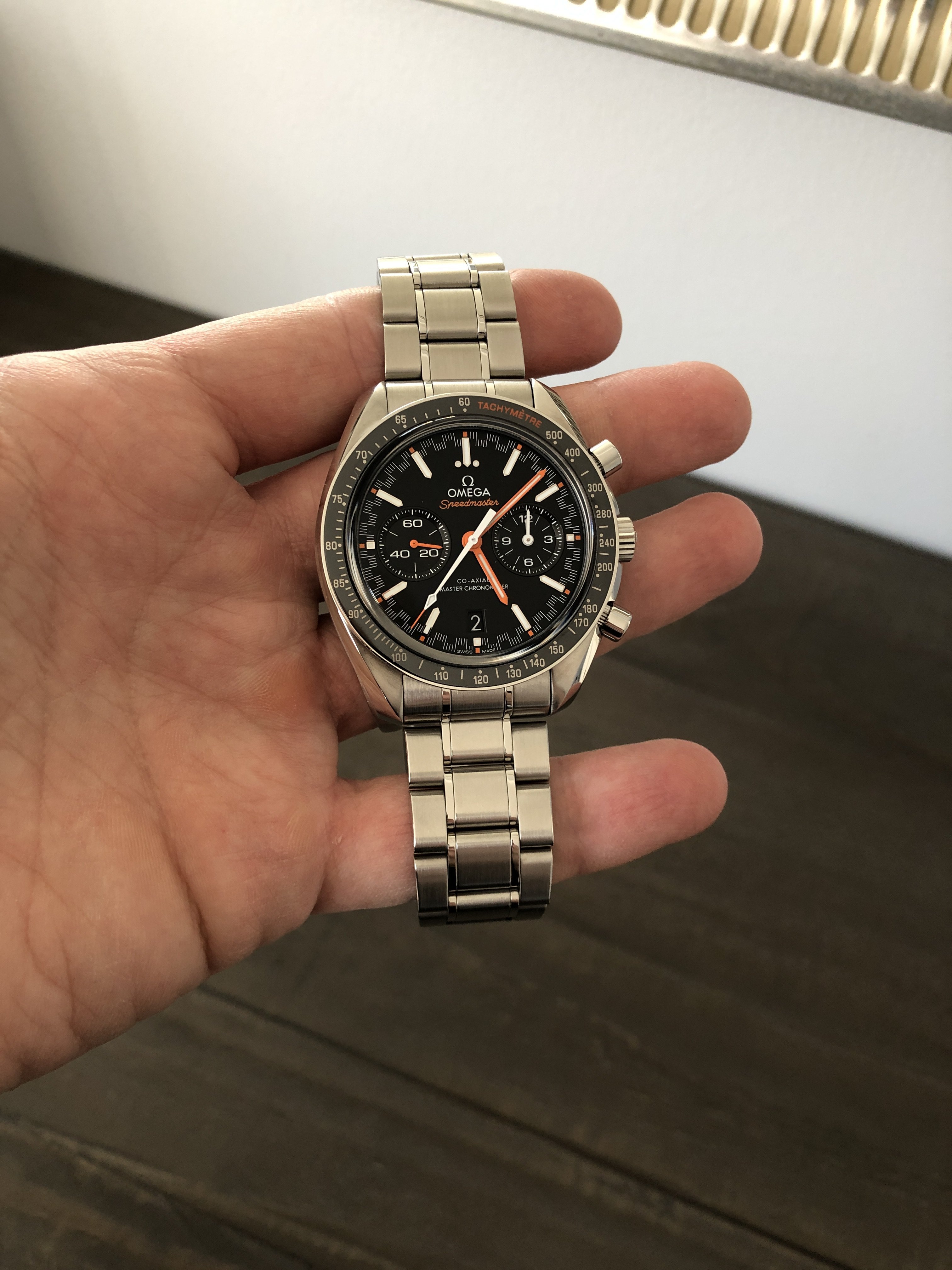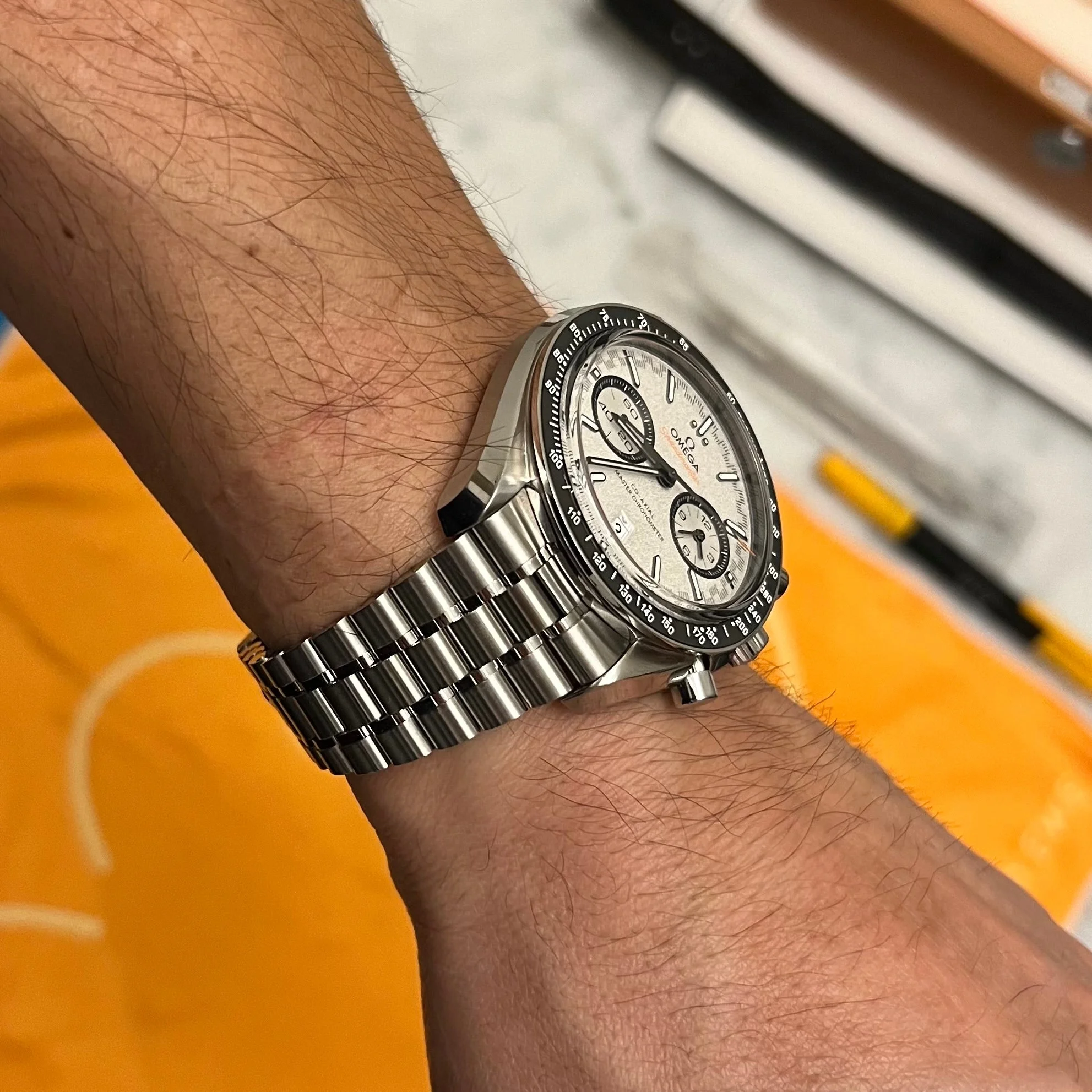 Posting to confirm that the Chronoscope bracelet can be successfully fitted to the 44.25mm Speedmaster Racing models. The Super Racing bracelet does not fit. The good people at Feldmar Watch in Los Angeles were amazingly flexible and helpful in testing both bracelets to help me come to this solution.