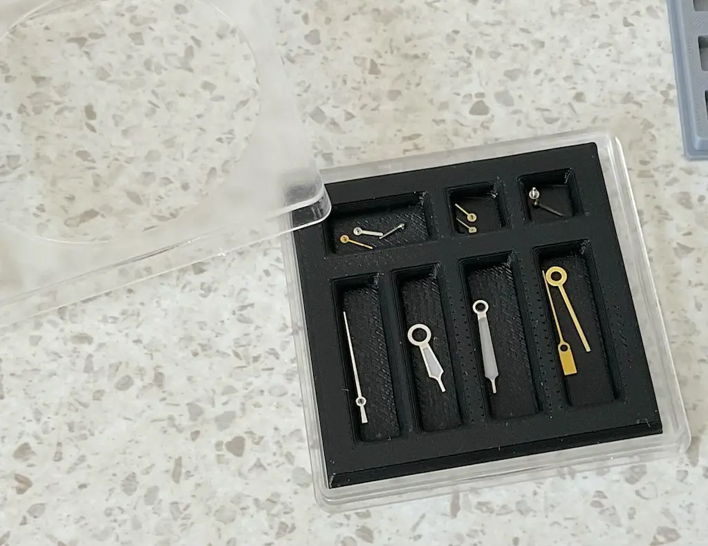 After seeing GGs tool holders I decided I needed some so with his design help (in Europe) and @HIXTAR doing the printing for me (in Australia) I now have them, as well as a storage case for watch hands, and some other little knick nacks.