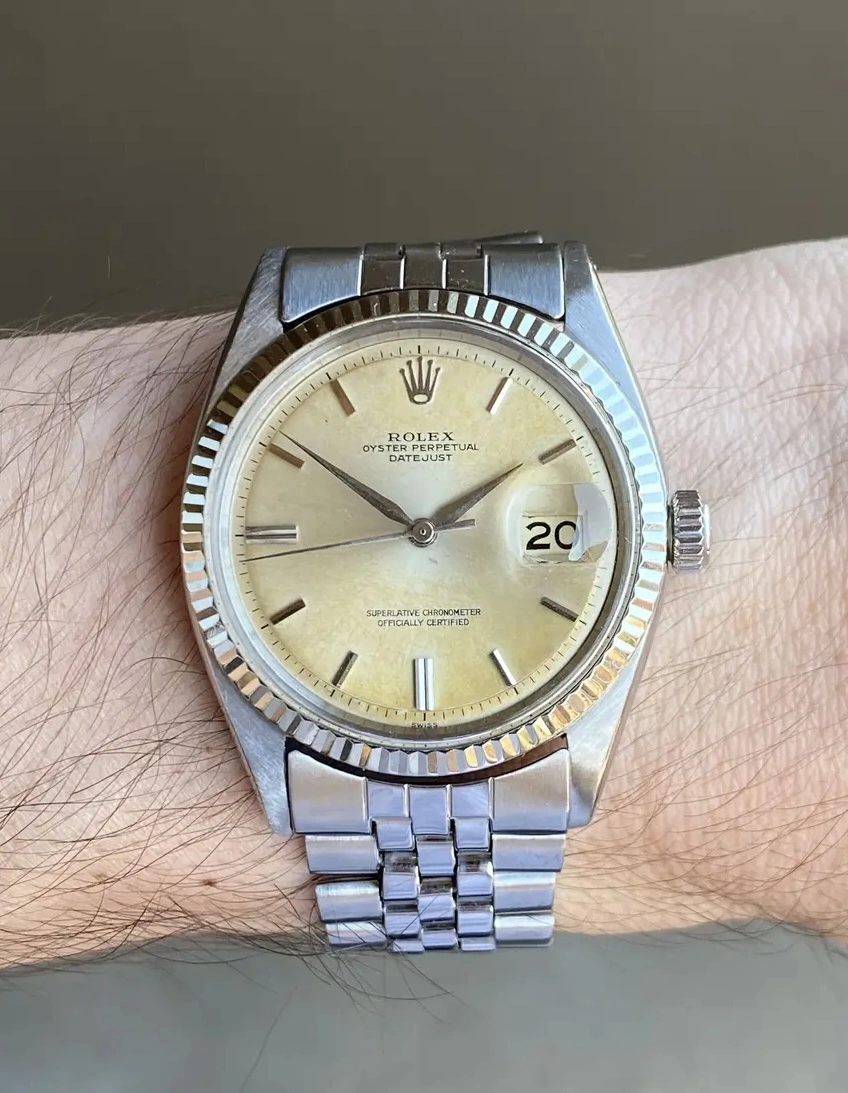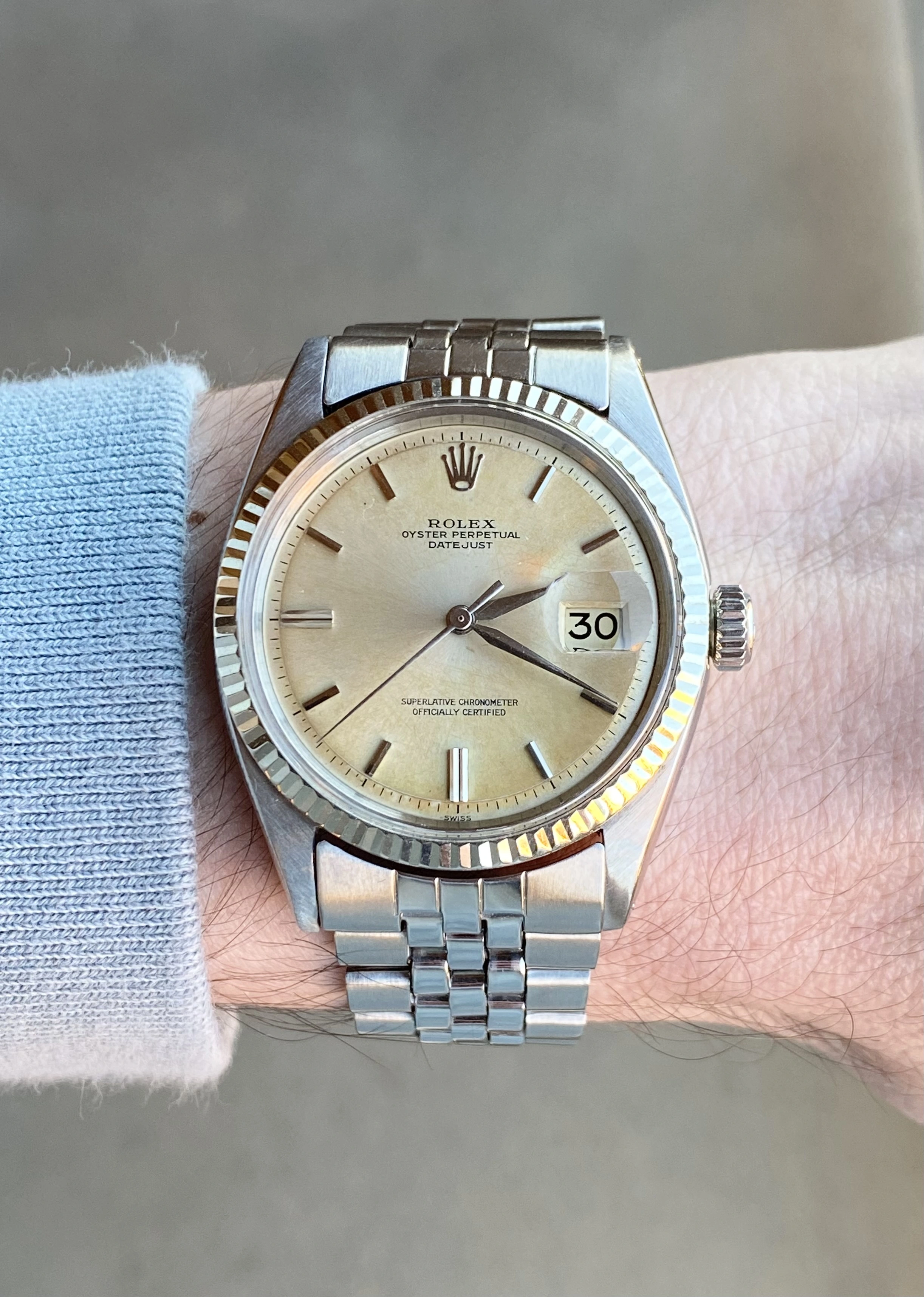 ·Up for sale is a classic 1962 Rolex Datejust 1601 ref. While a common model, this is an uncommon variant w/ a non-luminous dial and attractive alpha hands that only came on these early Datejust models. The 36mm steel case has a white gold bezel and is in nice condition. The dial has developed an even patina that my photos do not do justice to.