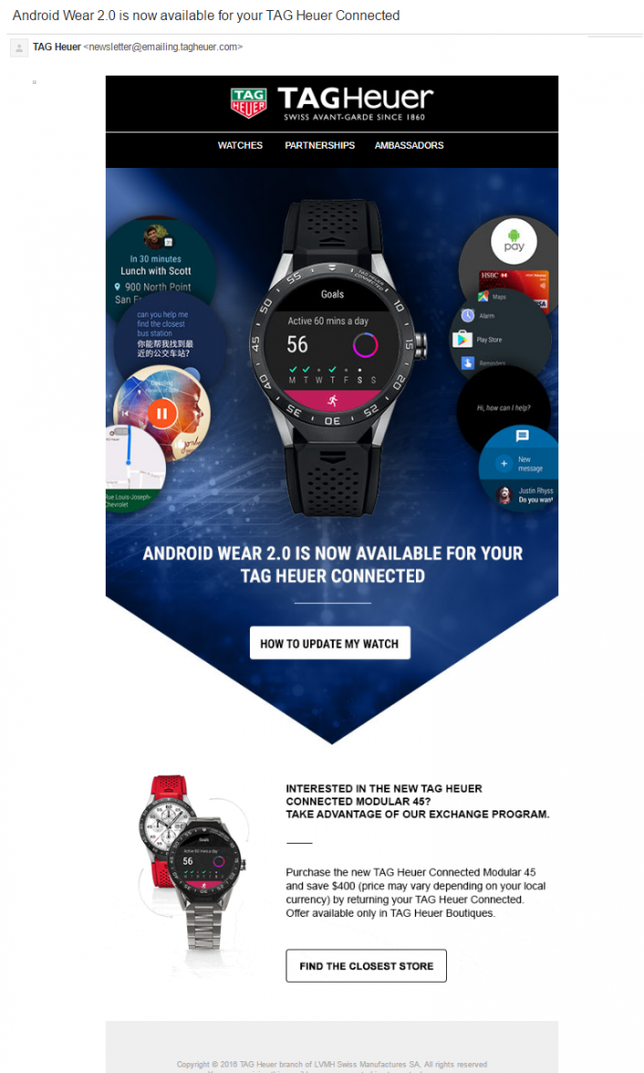 ·Anyone get this email yet? It says owners of the original Connected watch can bring in their original Connected and get $400 off the 45.