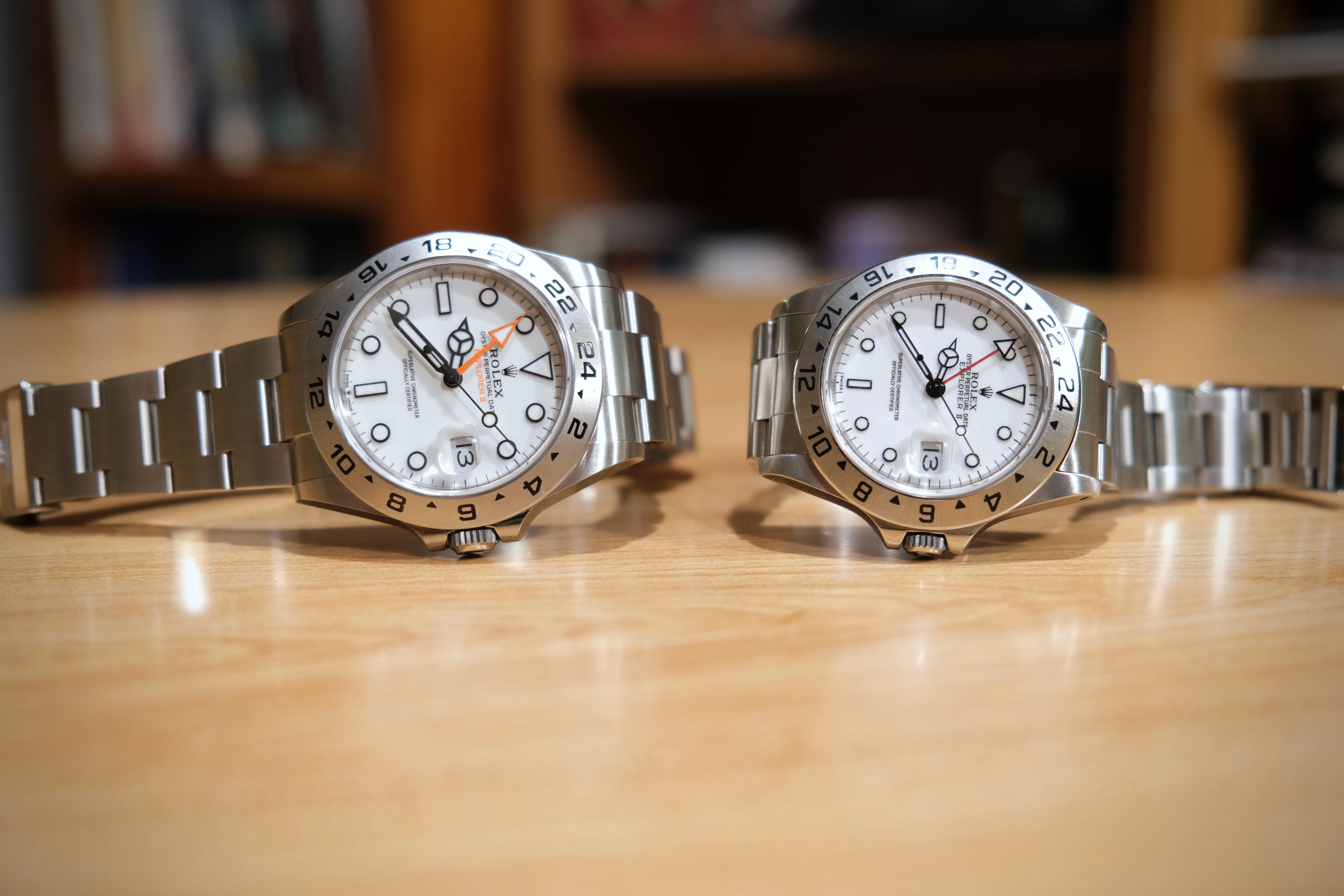 Here's my dilemma - I guess I got impatient and bought a 5-digit Explorer II only a few months after having put myself on the waitlist for the new 6-digit reference. So now I need to decide whether to sell one of the Explorer II's (and if so, which one) or if maybe I should just keep both. I like the red GMT hand and case proportions more on the 5-digit Explorer II, but the bracelet is crap and I keep needing to demagnetize the movement. The new 6-digit Explorer II is a little chunky and very shiny, but the bracelet is 100x better and magnetization won't be an issue - plus I'll be the first and only owner which is nice. Despite some obvious differences, however, I feel like they are probably too similar to both stay in my modestly-sized collection. But then again, the Explorer II is one of my favorite model lines from any watch brand, so maybe they could both stay...