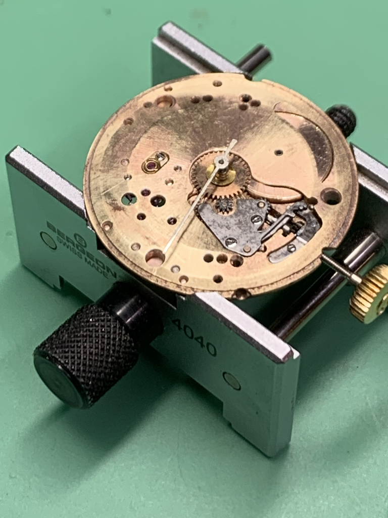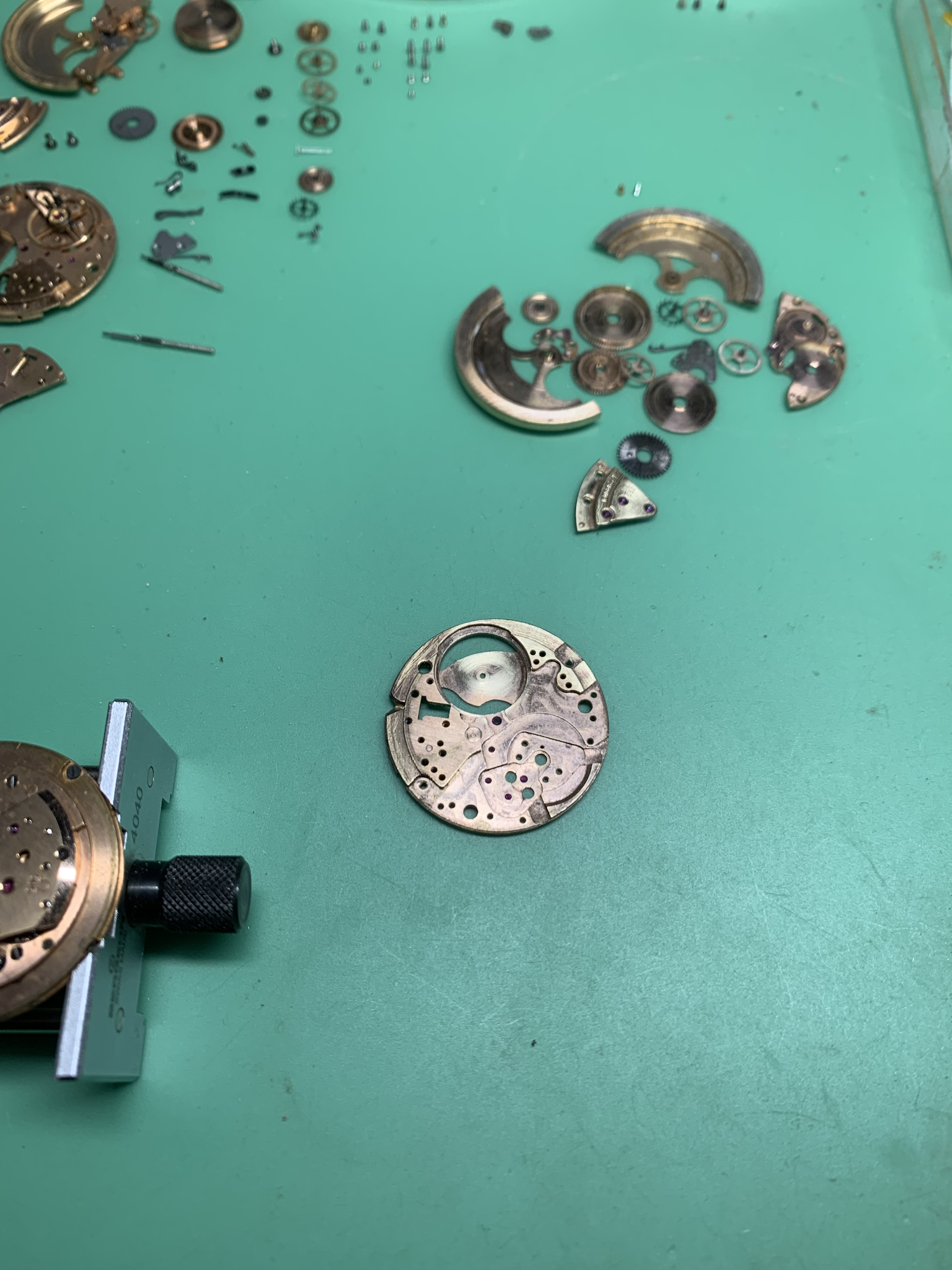 ·Removed the main plate of the 552 from the Alum to remove the dial screw. Ran it through the watch cleaner. Lots of pegwood removing the gunk.