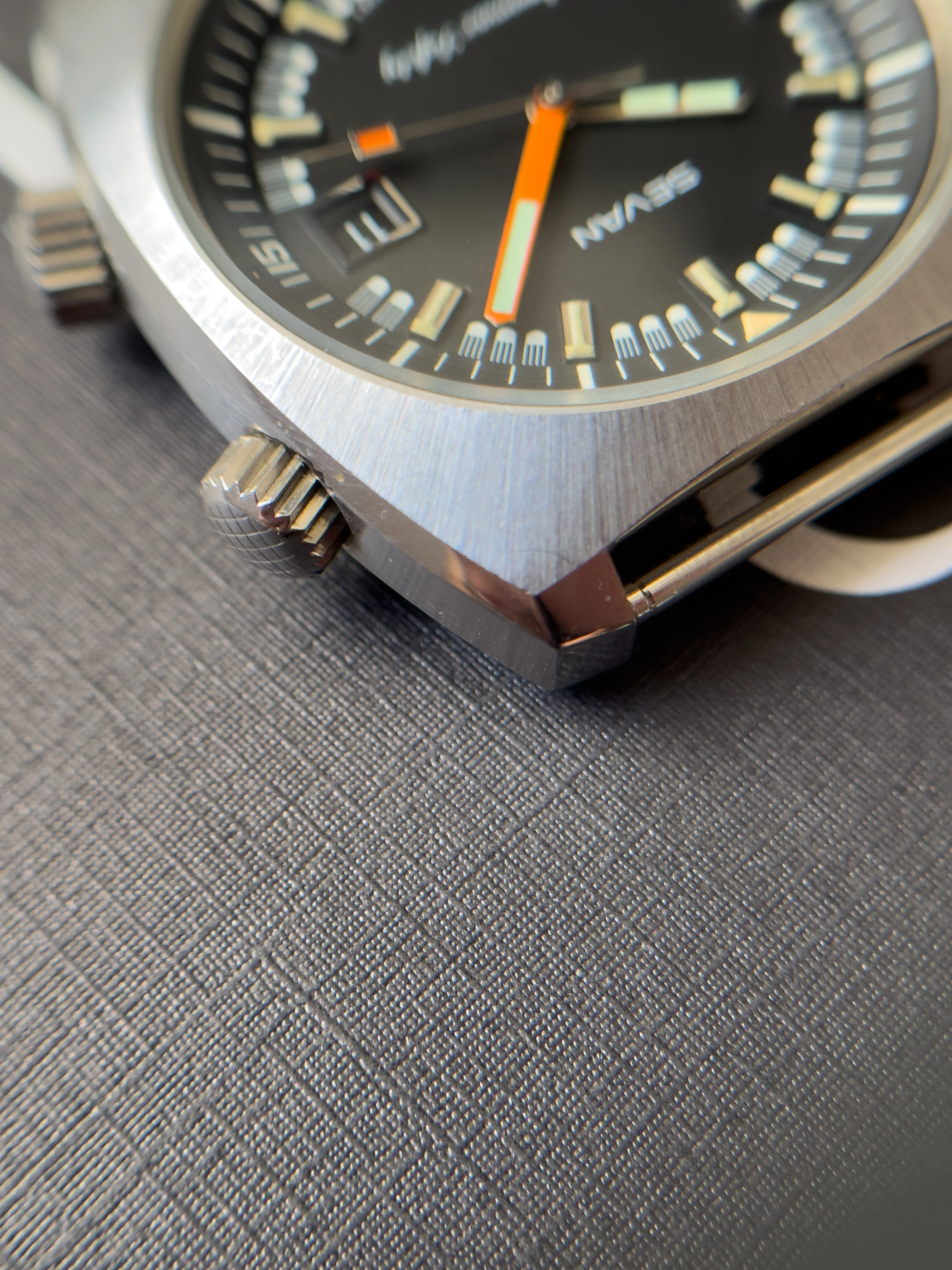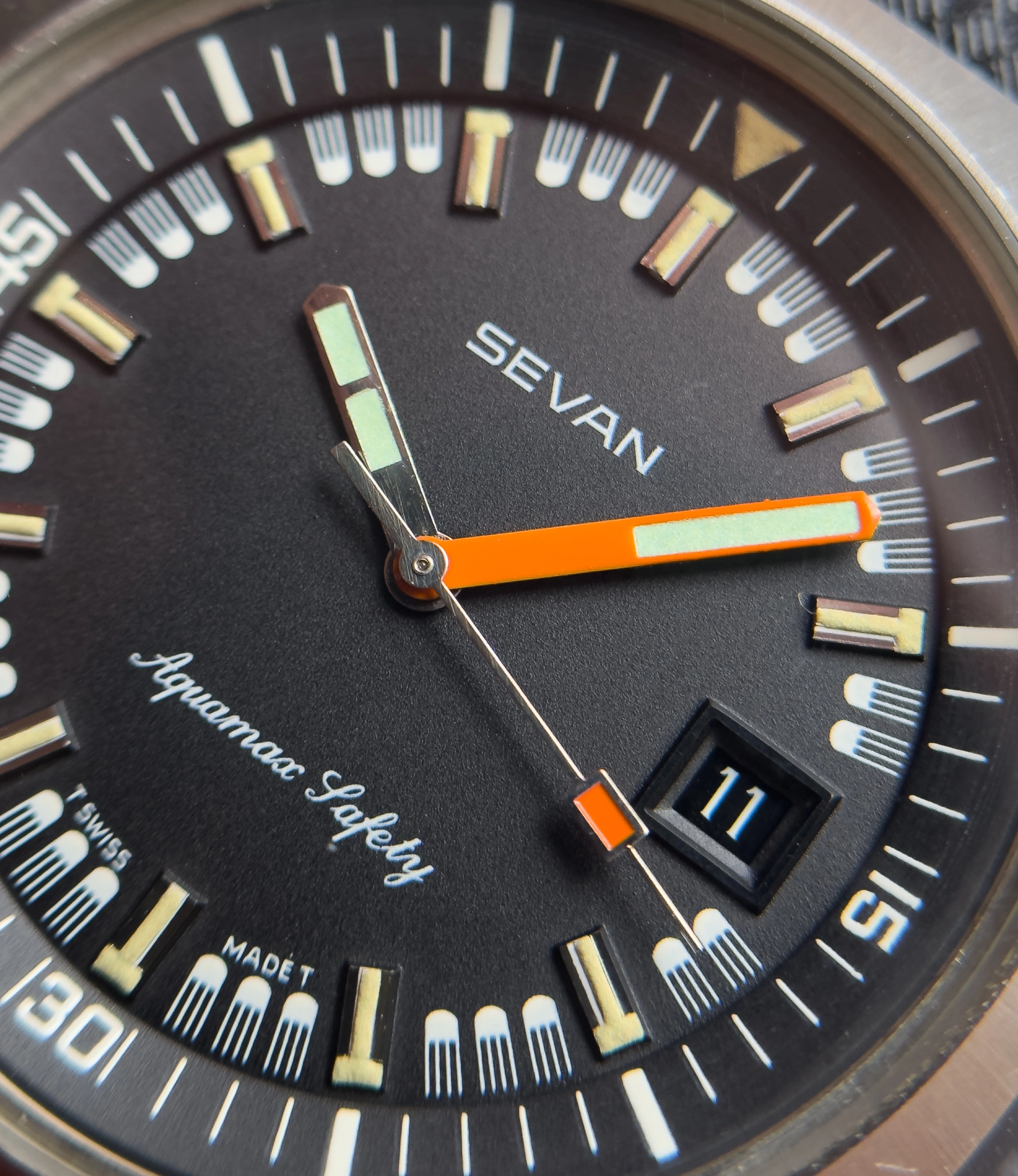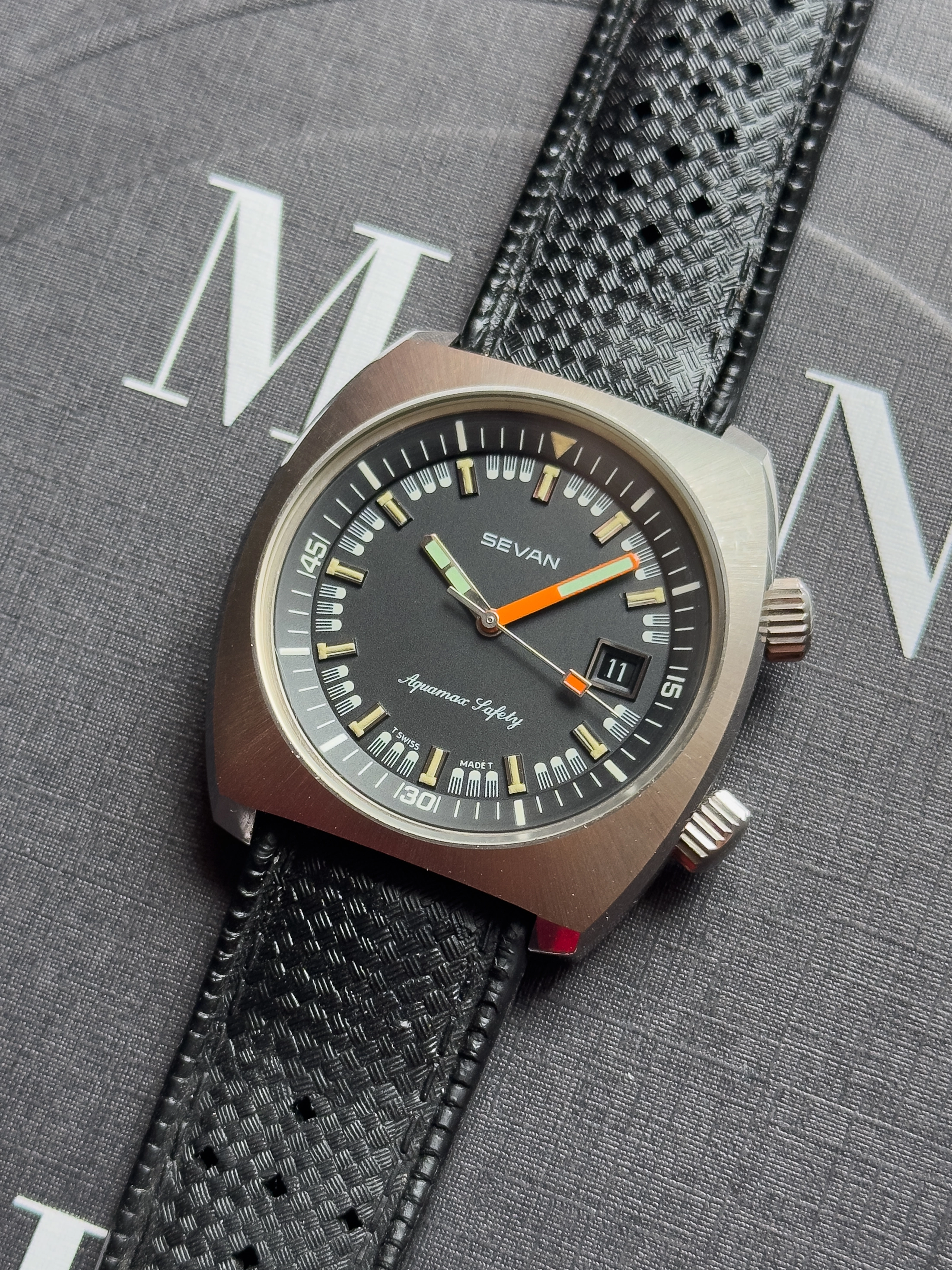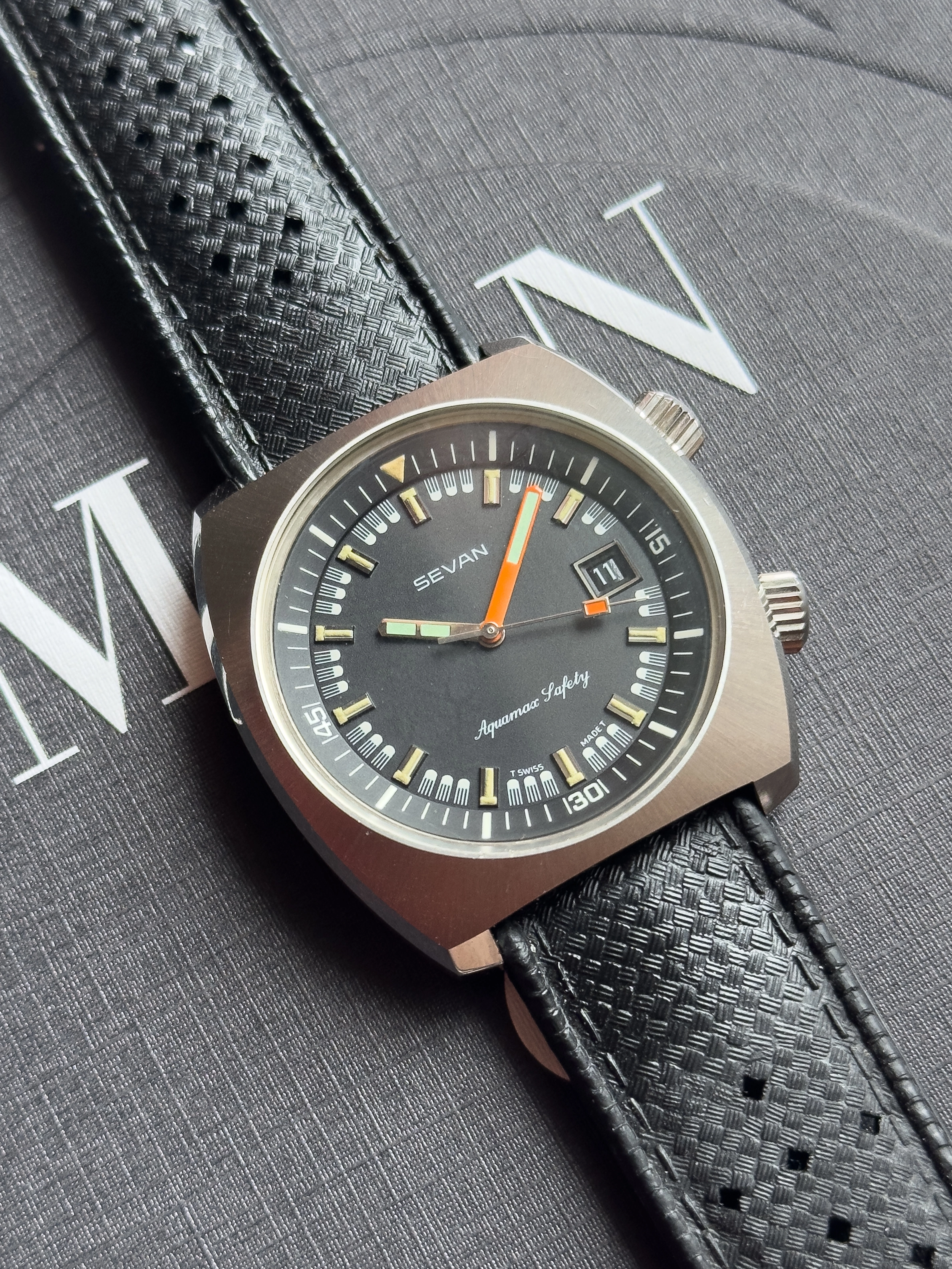 For sale is a pretty sharp 1970's dual-crown super compressor from Sevan with a vintage tropic strap. Haven't heard of Sevan? For shame ๐... but honestly neither had I; however, this is a cousin to the Precimax Aquamax Safety, which you can see in this listing from 5 years ago.