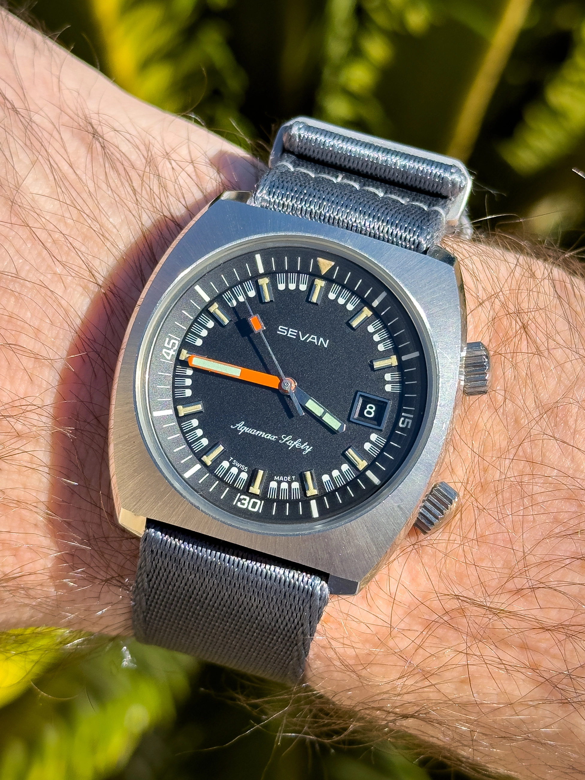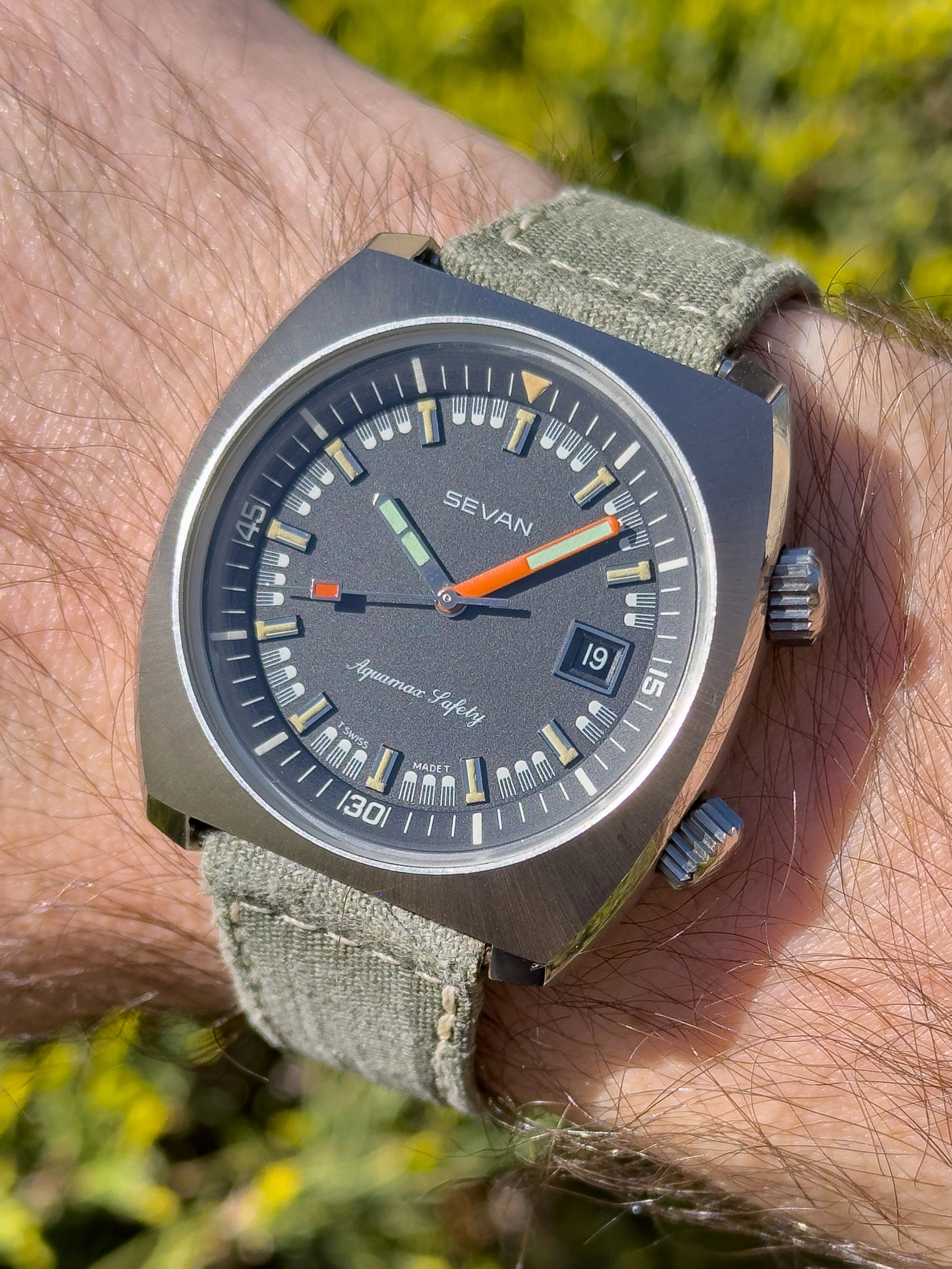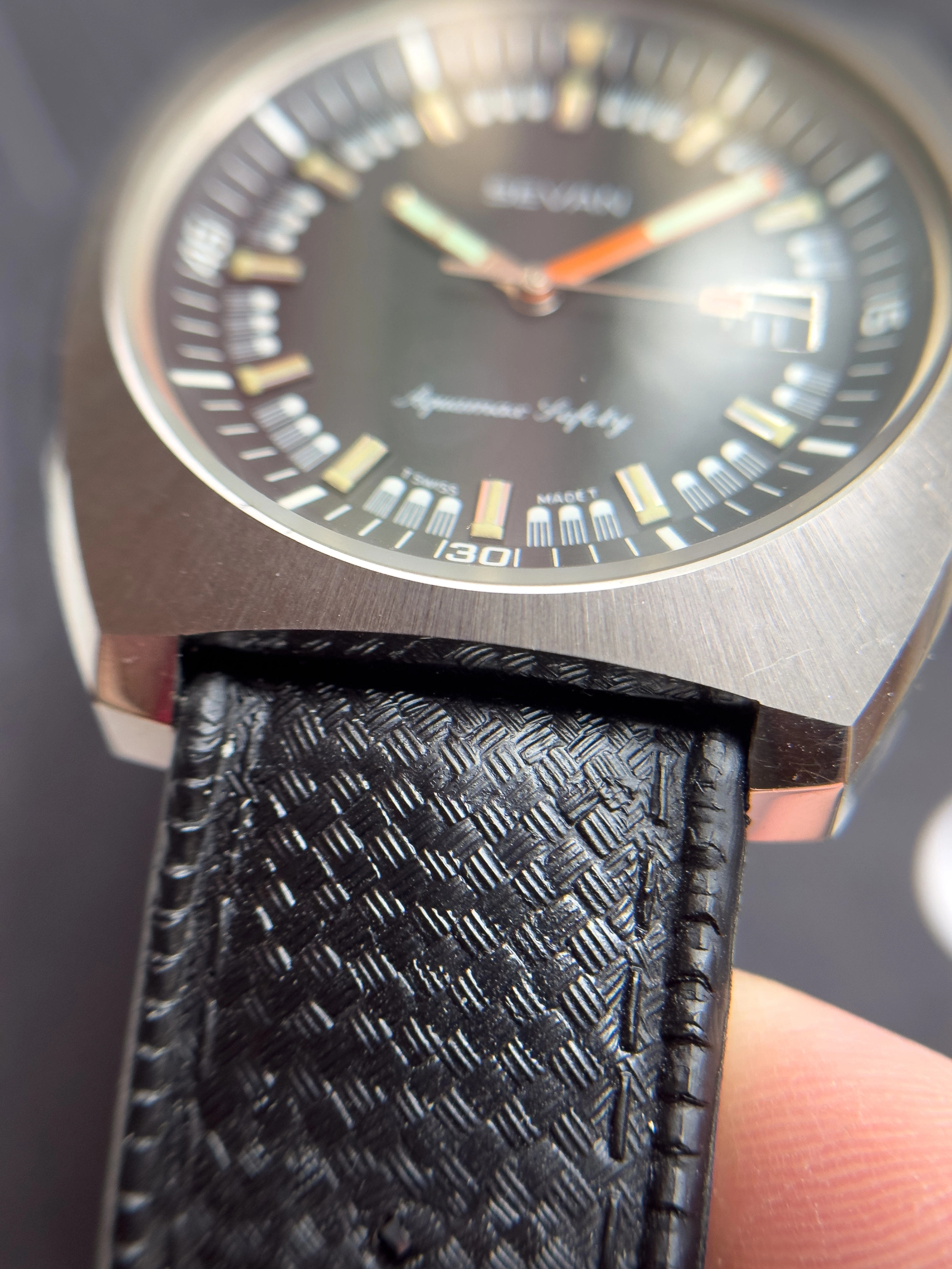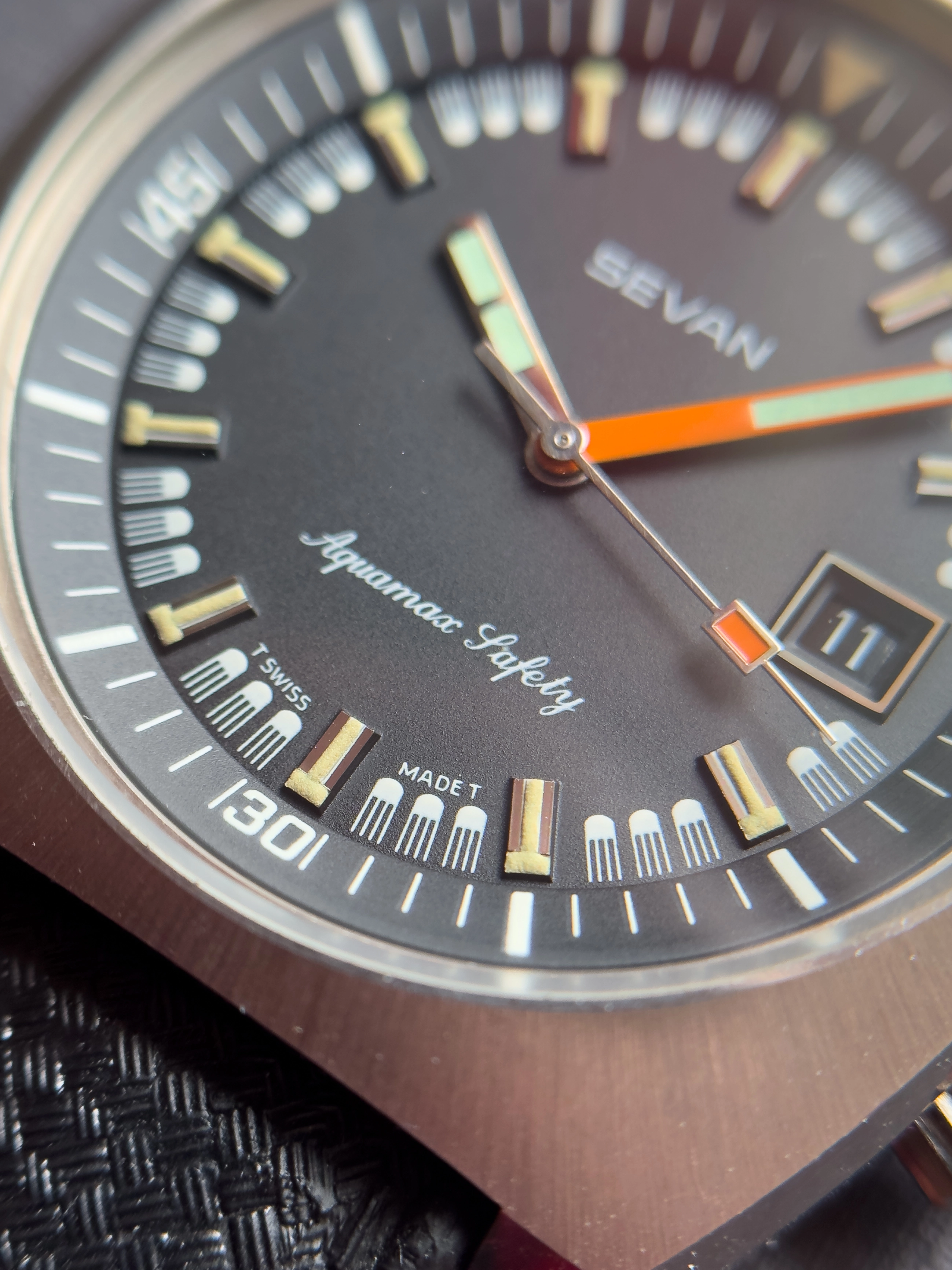 For sale is a pretty sharp 1970's dual-crown super compressor from Sevan with a vintage tropic strap. Haven't heard of Sevan? For shame ๐... but honestly neither had I; however, this is a cousin to the Precimax Aquamax Safety, which you can see in this listing from 5 years ago.