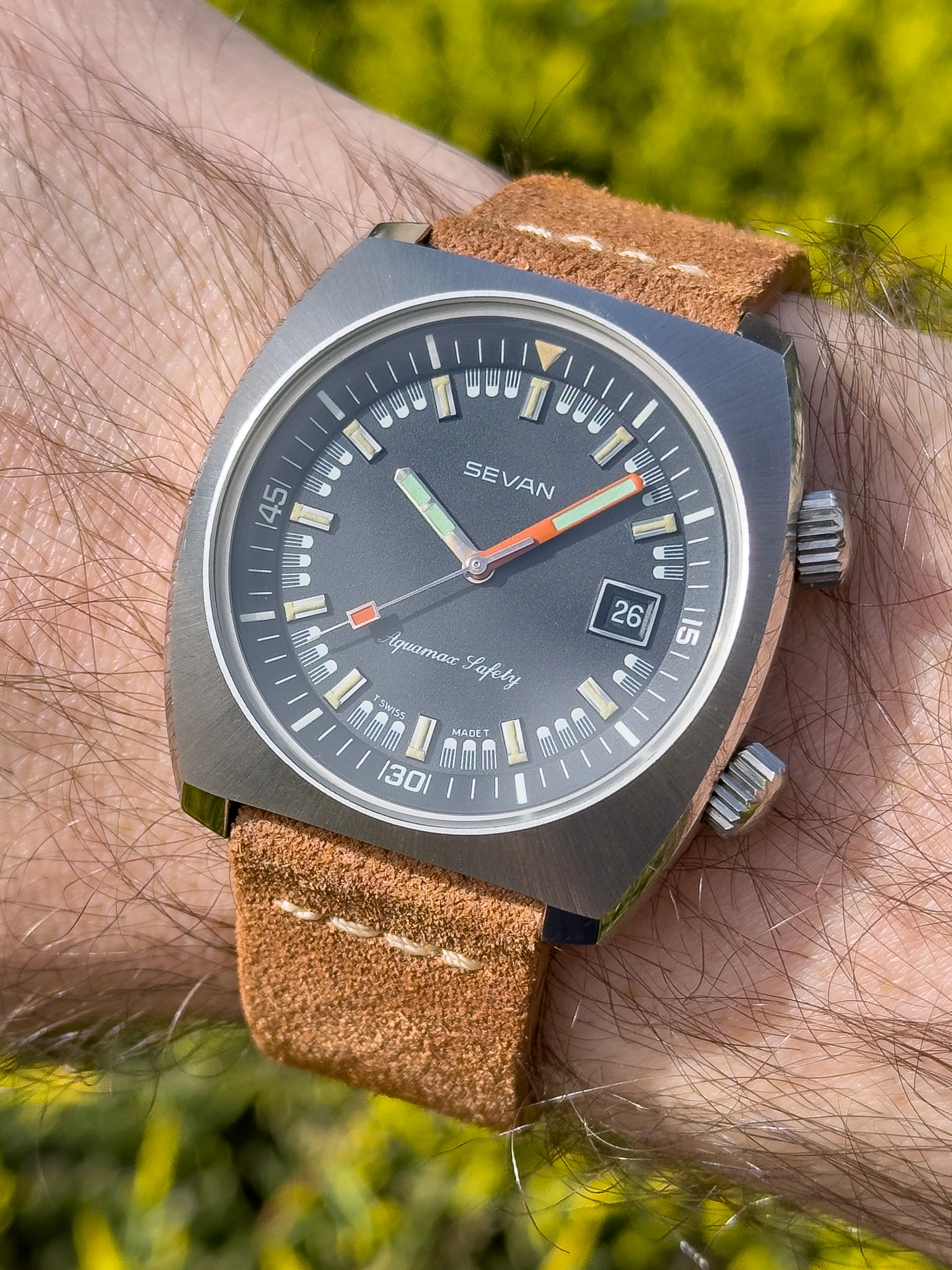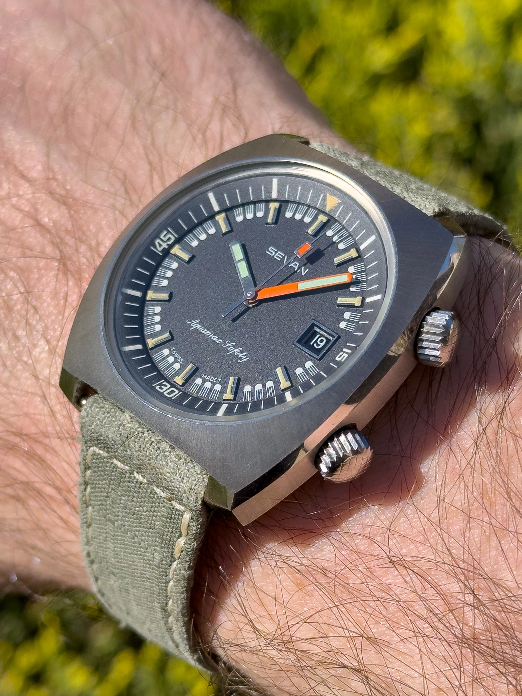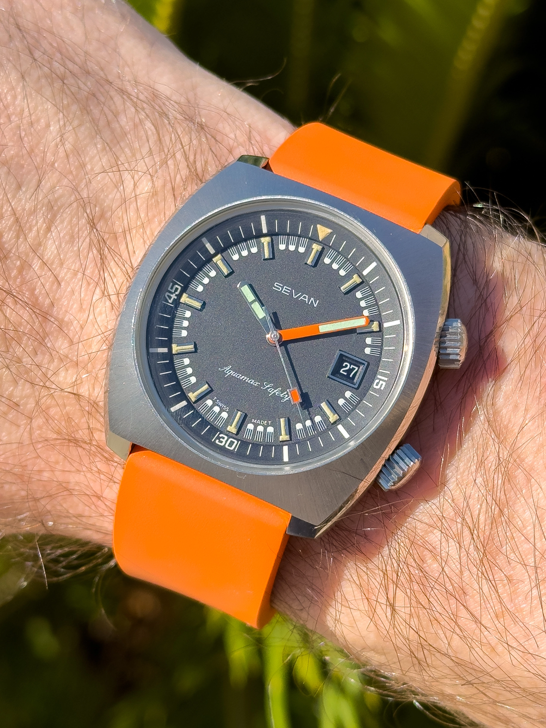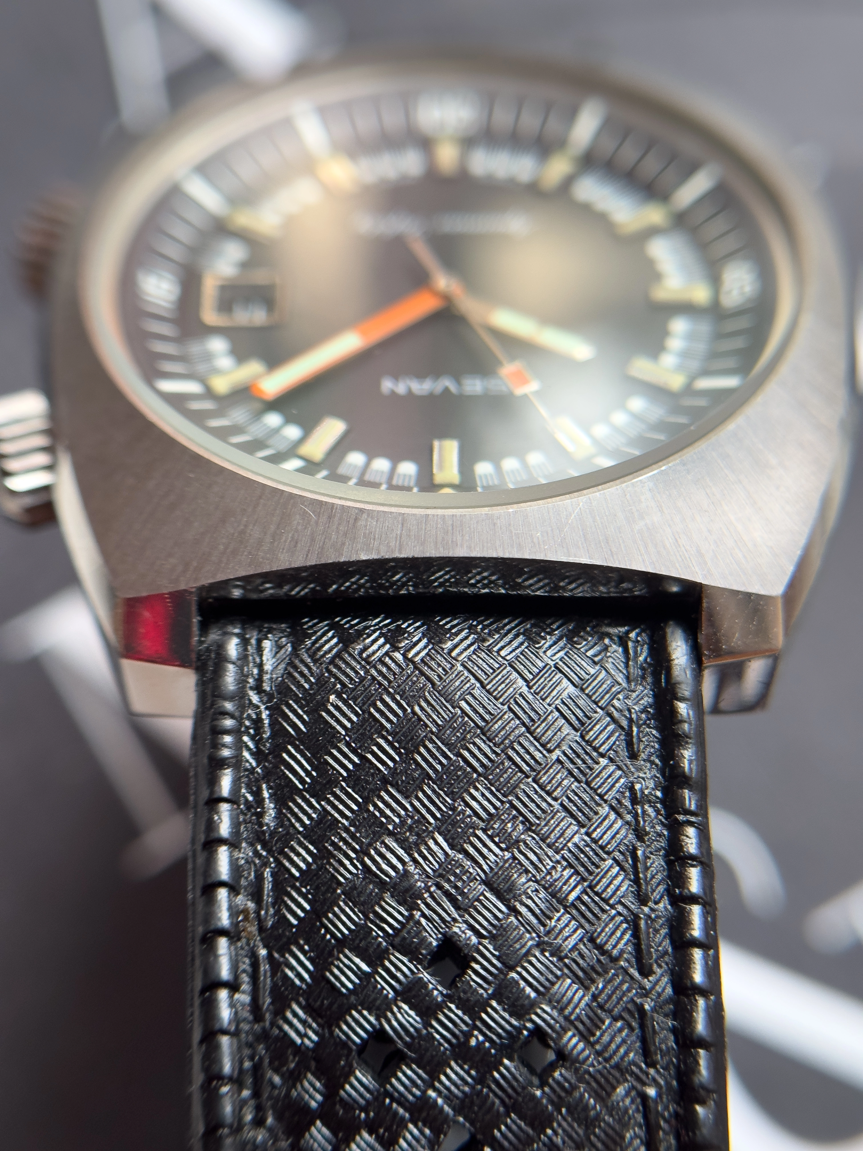 For sale is a pretty sharp 1970's dual-crown super compressor from Sevan with a vintage tropic strap. Haven't heard of Sevan? For shame ๐... but honestly neither had I; however, this is a cousin to the Precimax Aquamax Safety, which you can see in this listing from 5 years ago.