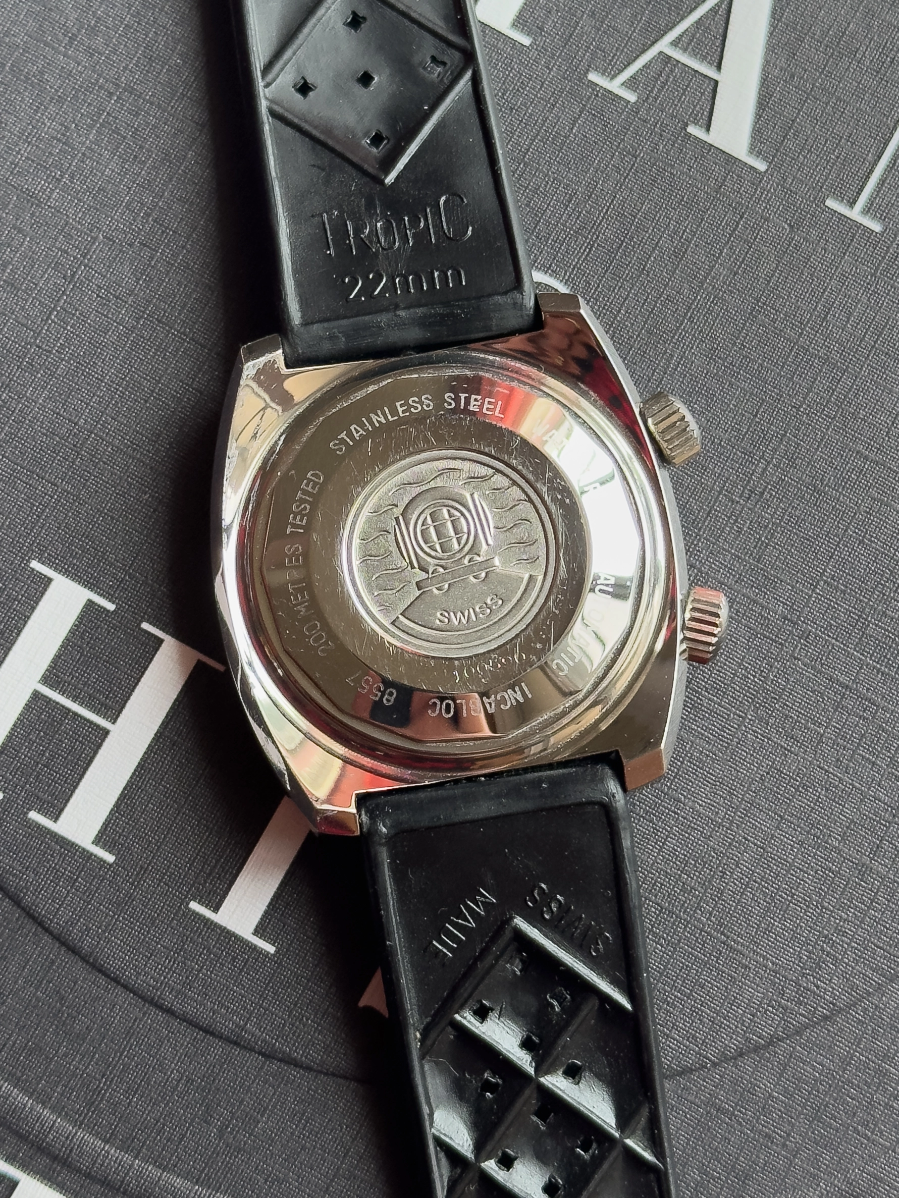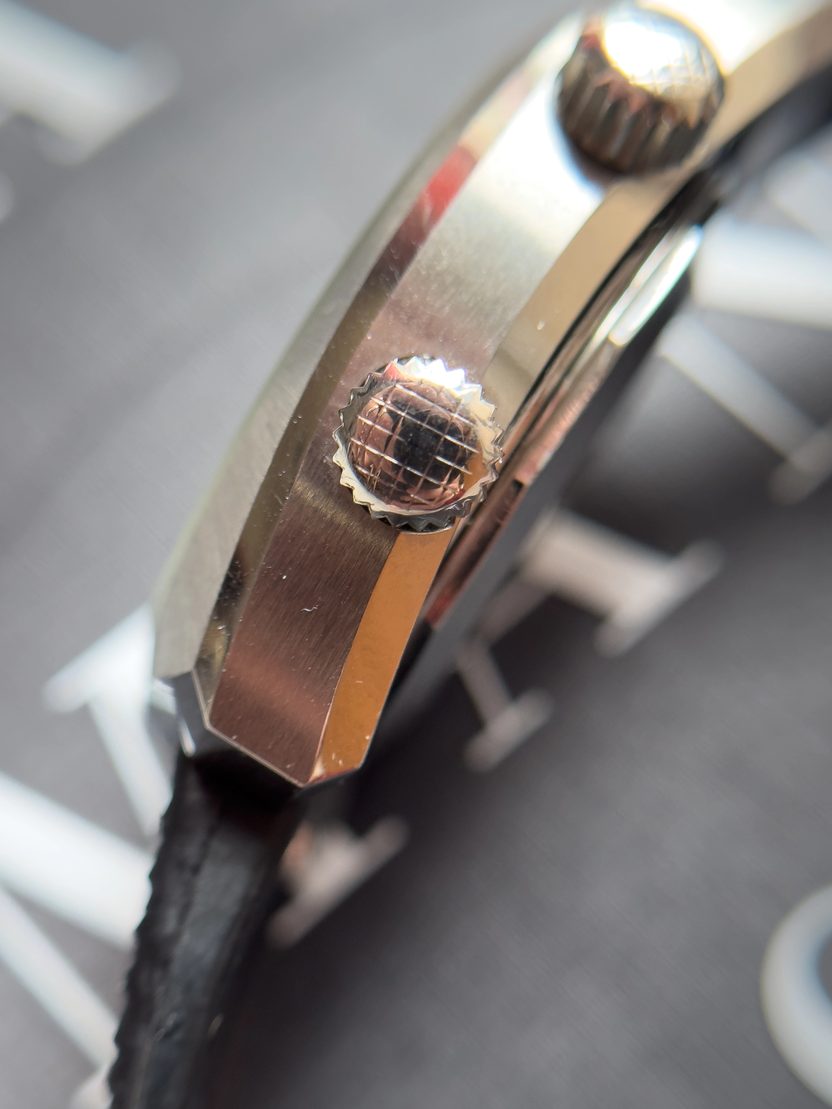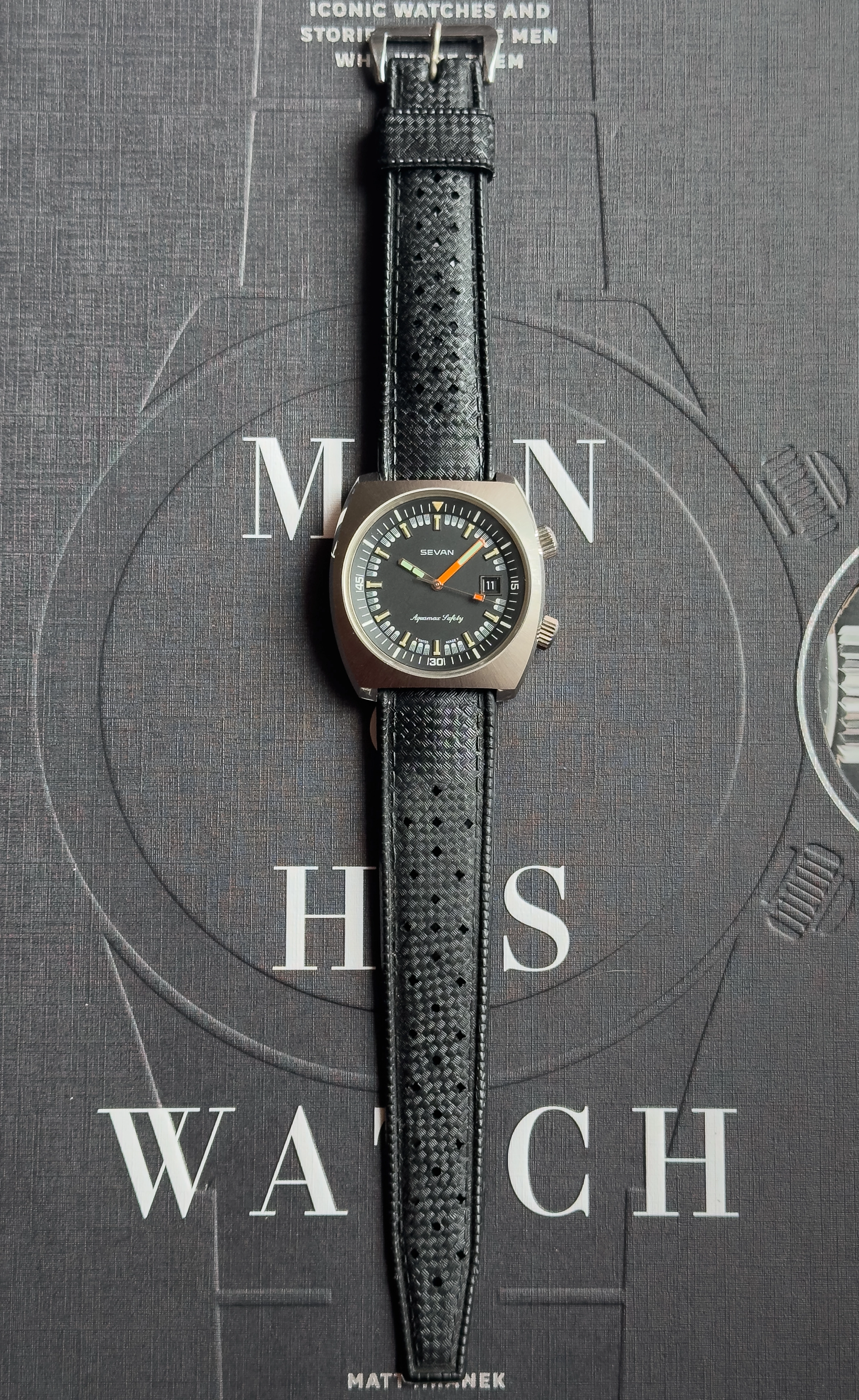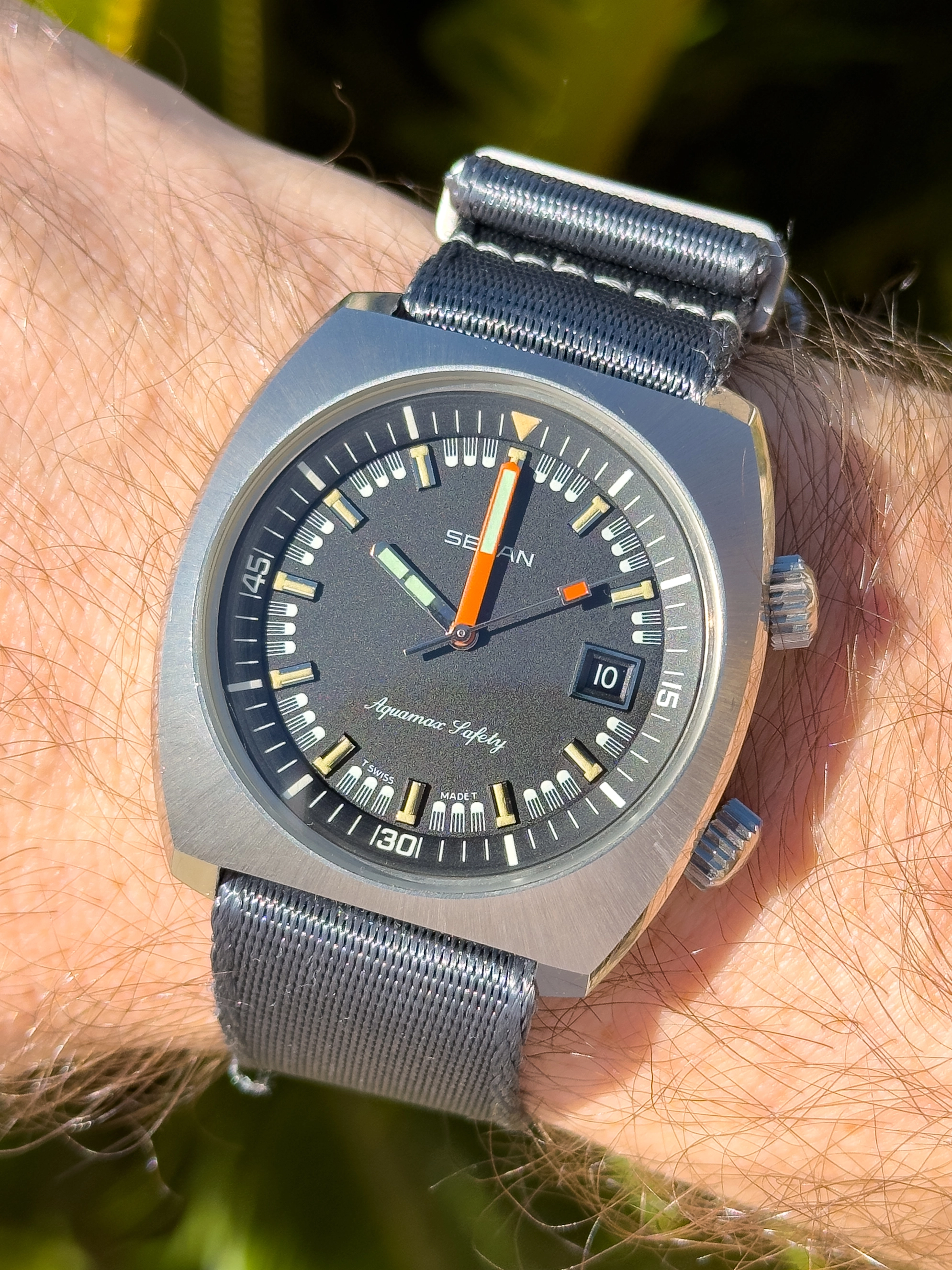 For sale is a pretty sharp 1970's dual-crown super compressor from Sevan with a vintage tropic strap. Haven't heard of Sevan? For shame ๐... but honestly neither had I; however, this is a cousin to the Precimax Aquamax Safety, which you can see in this listing from 5 years ago.
