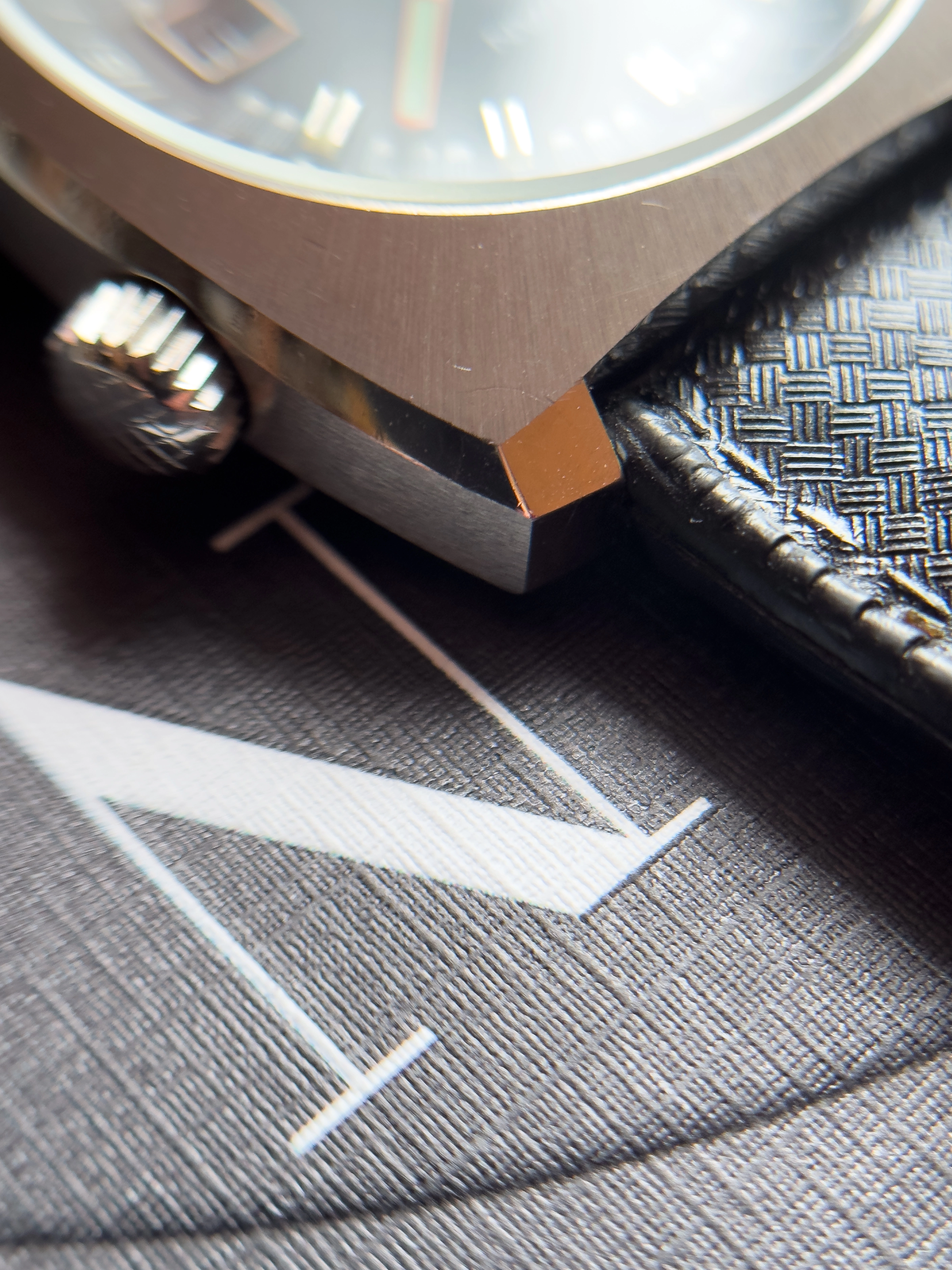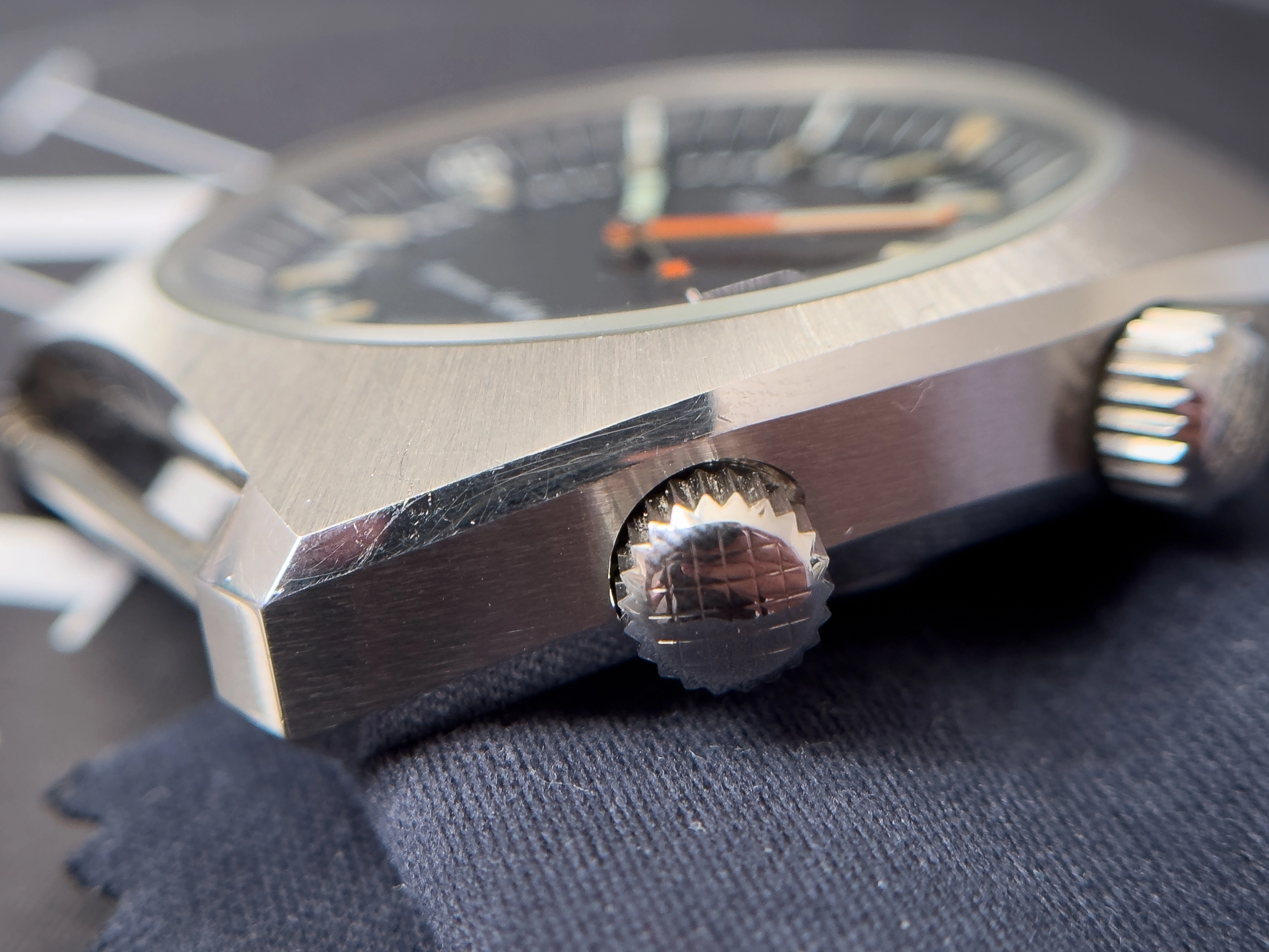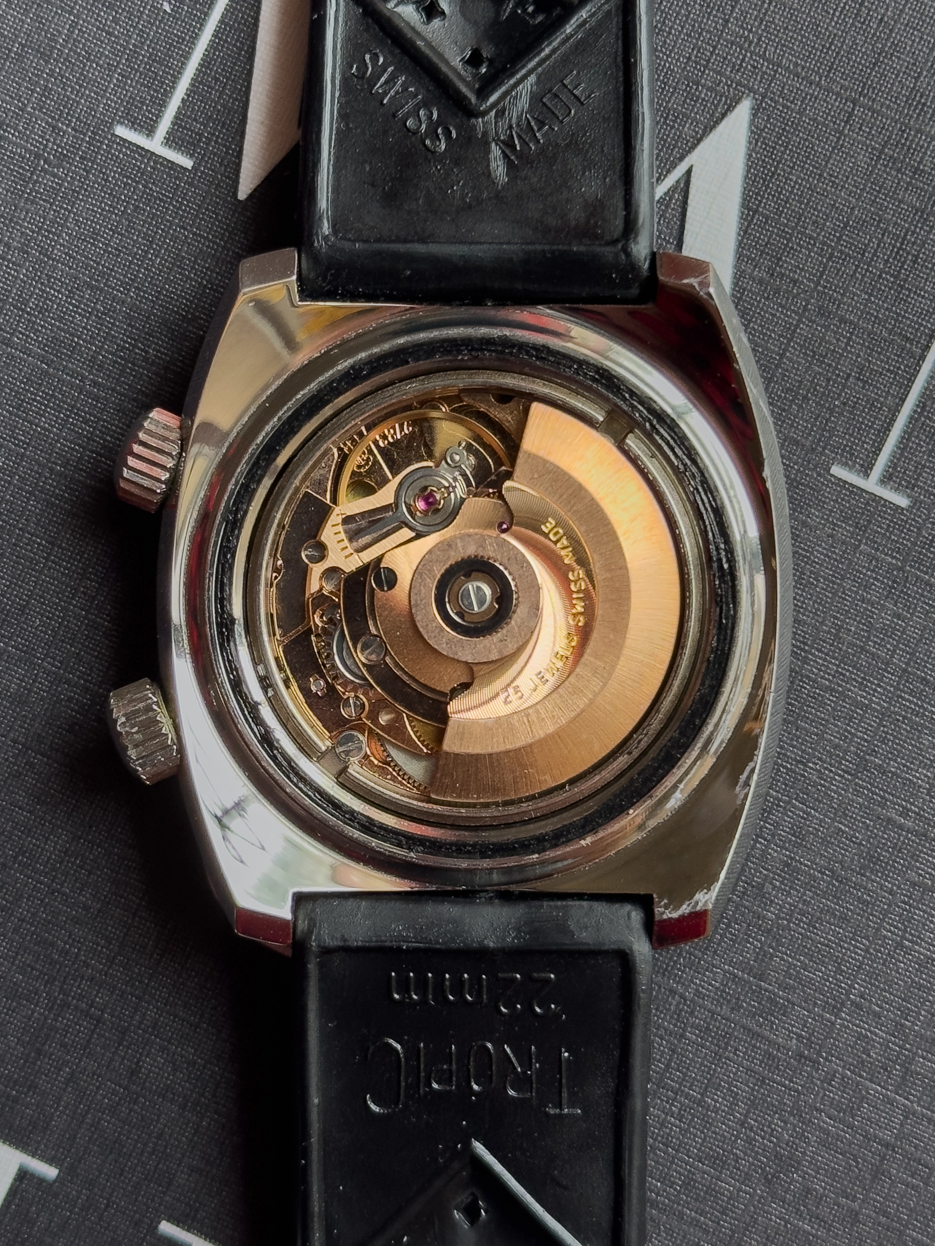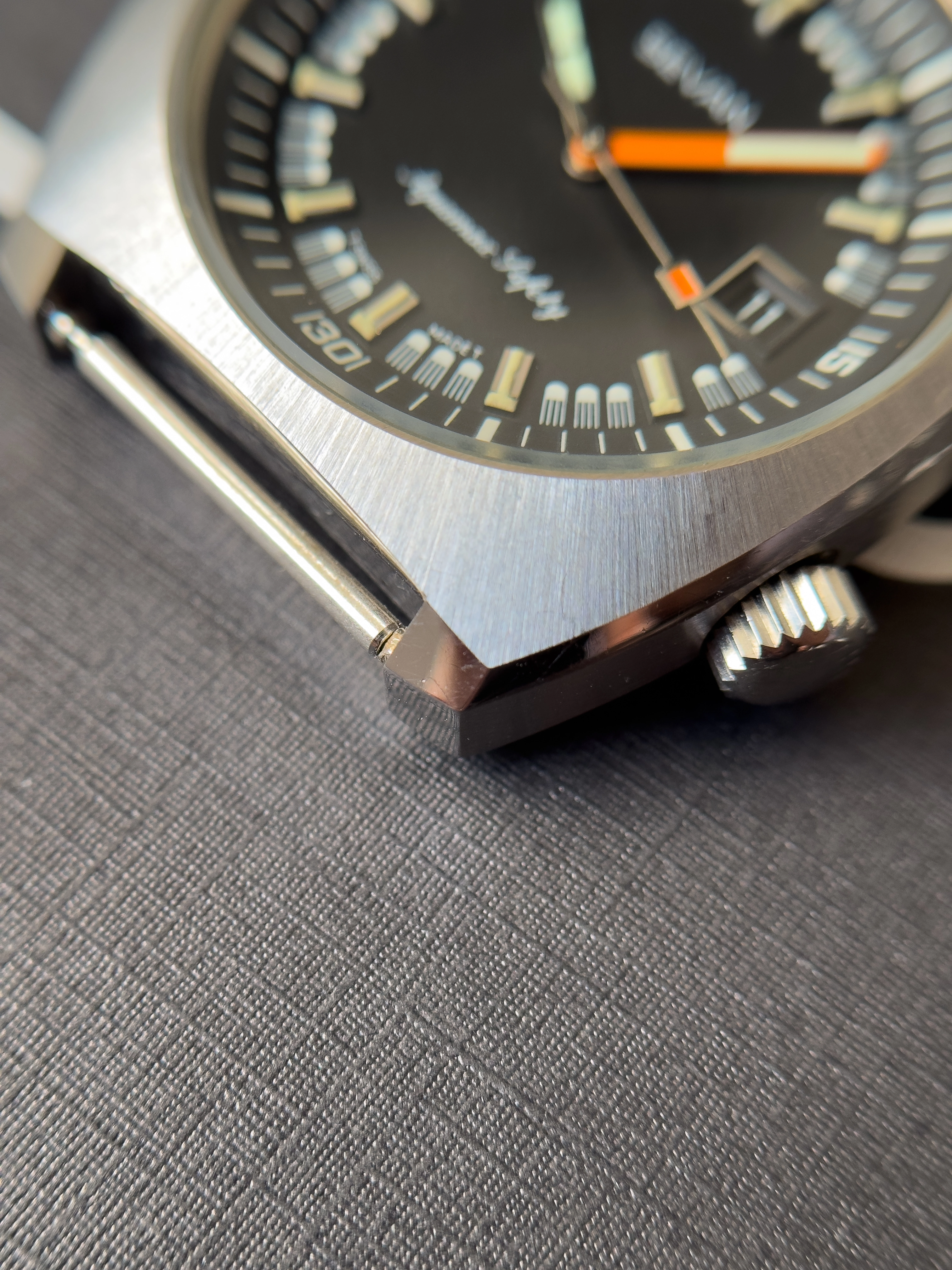 The watch is in excellent condition with the case being incredibly sharp, retaining its original lines and brushing. I have worn this watch occasionally over the near two years I have owned it, so it does have a few light wear marks, primarily on the caseback. The case is 40mm across (not including crowns) and 42mm lug to lug. It is a large watch, however it wears very comfortably on the wrist. The case is relatively slim giving it a nice compact feel with funky fun 70's presence on the wrist. The tritium on the dial is a nice yellow color while the tritium in the hands is a soft pale green. The bezel rotates how it should. The movement is an ETA 2783 and is very clean, as you can see in the photo below. It has not been serviced while in my possession but it runs well, winds smoothly, and I have not experienced any issues with it. The tropic strap is in great condition and feels soft/comfortable. The matte black dial with its texture, unique and funky minute markings, raised hour markers, and orange accents are all pleasing to look at and help give this piece fun wrist presence. The flat mineral crystal is free of any blemishes and is easy to view the fun design elements of this watch at just about any angle. It has been a little while since I have listed a watch for sale, so I feel a tad rusty writing this, but if you have any questions please don't hesitate to reach out to me.