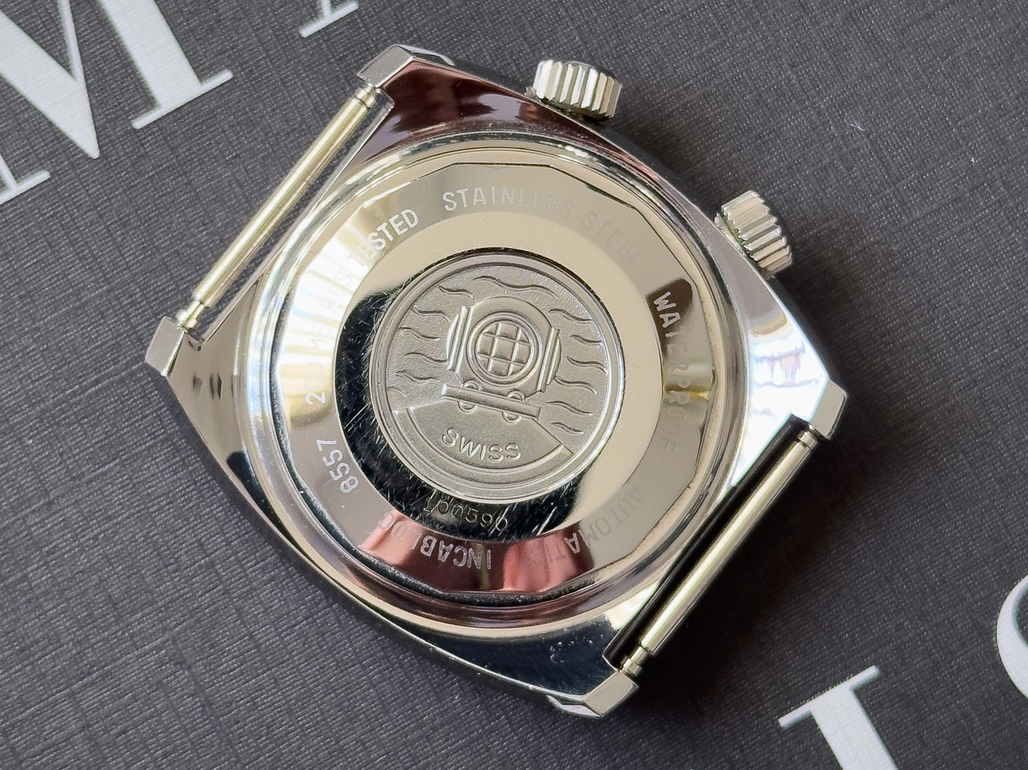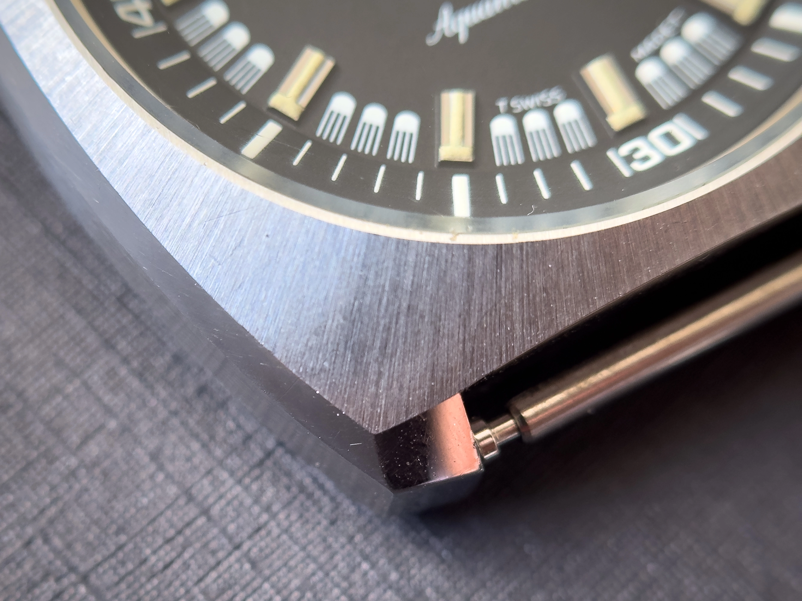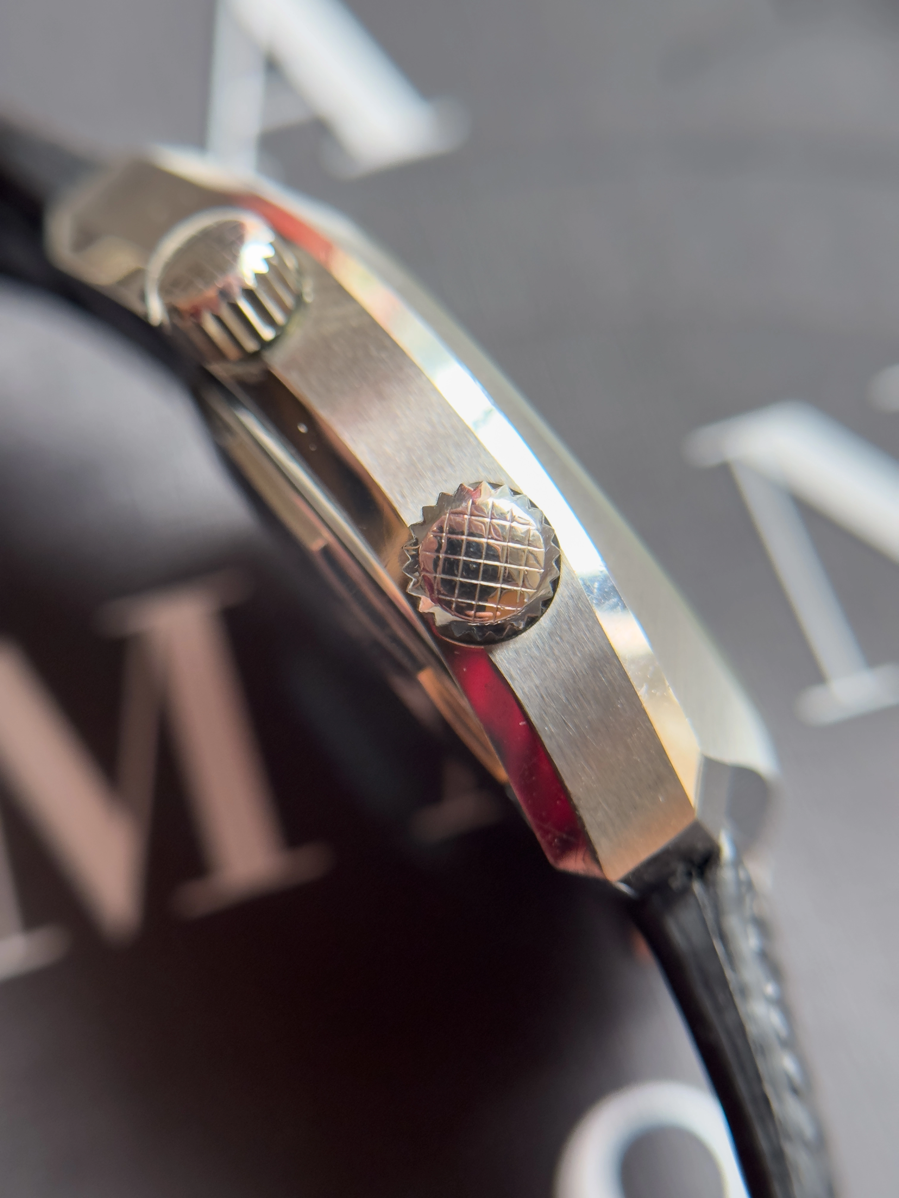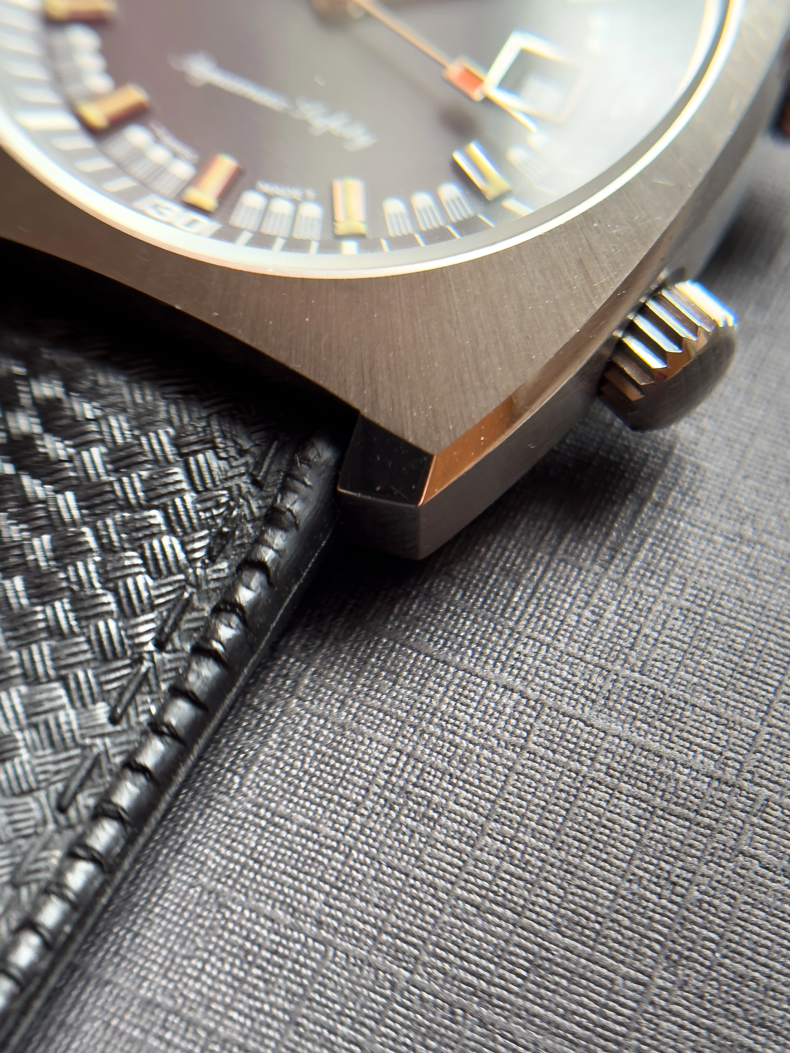 The watch is in excellent condition with the case being incredibly sharp, retaining its original lines and brushing. I have worn this watch occasionally over the near two years I have owned it, so it does have a few light wear marks, primarily on the caseback. The case is 40mm across (not including crowns) and 42mm lug to lug. It is a large watch, however it wears very comfortably on the wrist. The case is relatively slim giving it a nice compact feel with funky fun 70's presence on the wrist. The tritium on the dial is a nice yellow color while the tritium in the hands is a soft pale green. The bezel rotates how it should. The movement is an ETA 2783 and is very clean, as you can see in the photo below. It has not been serviced while in my possession but it runs well, winds smoothly, and I have not experienced any issues with it. The tropic strap is in great condition and feels soft/comfortable. The matte black dial with its texture, unique and funky minute markings, raised hour markers, and orange accents are all pleasing to look at and help give this piece fun wrist presence. The flat mineral crystal is free of any blemishes and is easy to view the fun design elements of this watch at just about any angle. It has been a little while since I have listed a watch for sale, so I feel a tad rusty writing this, but if you have any questions please don't hesitate to reach out to me.