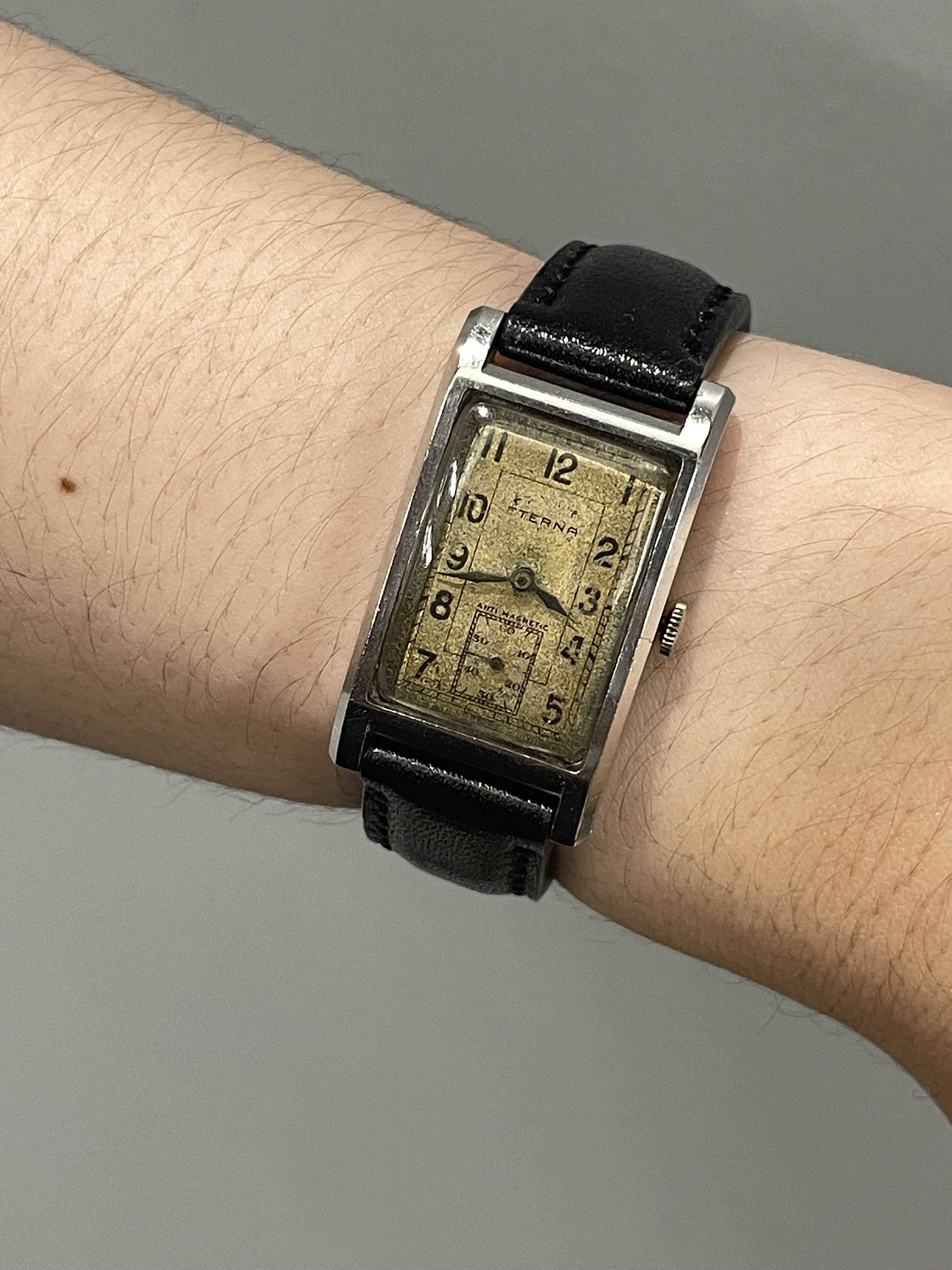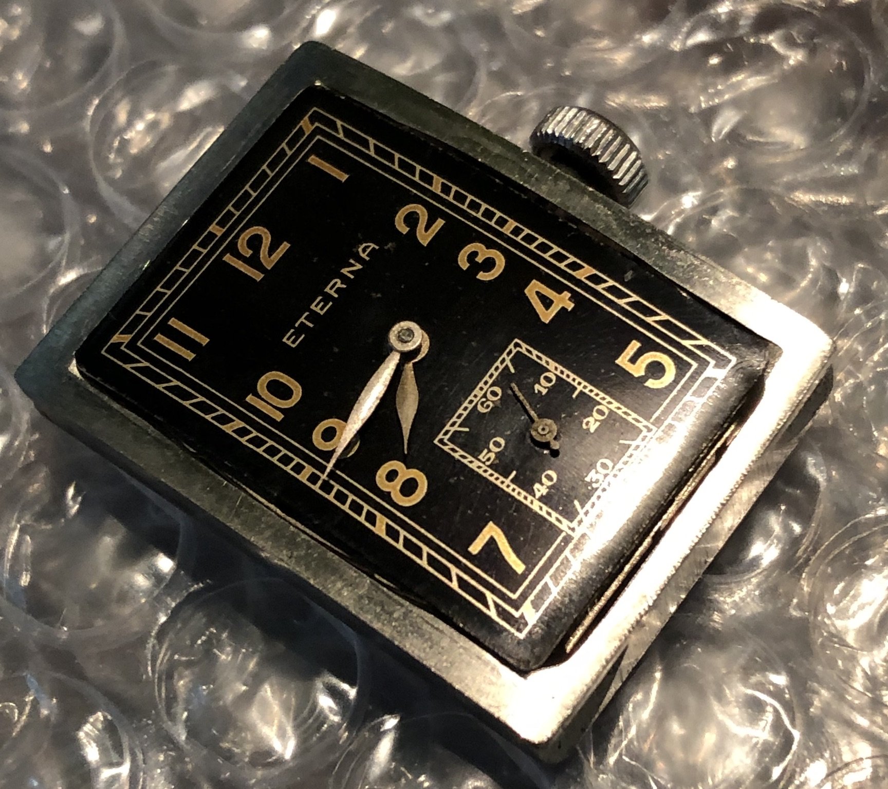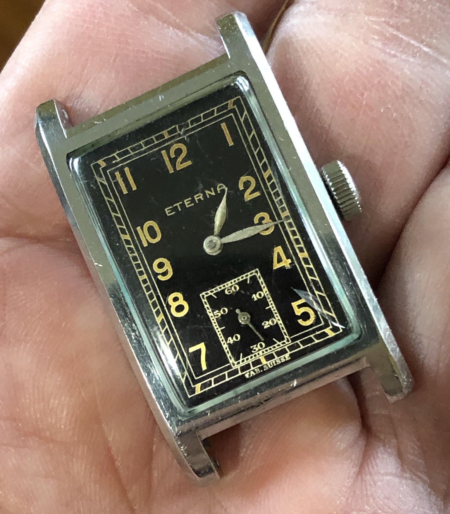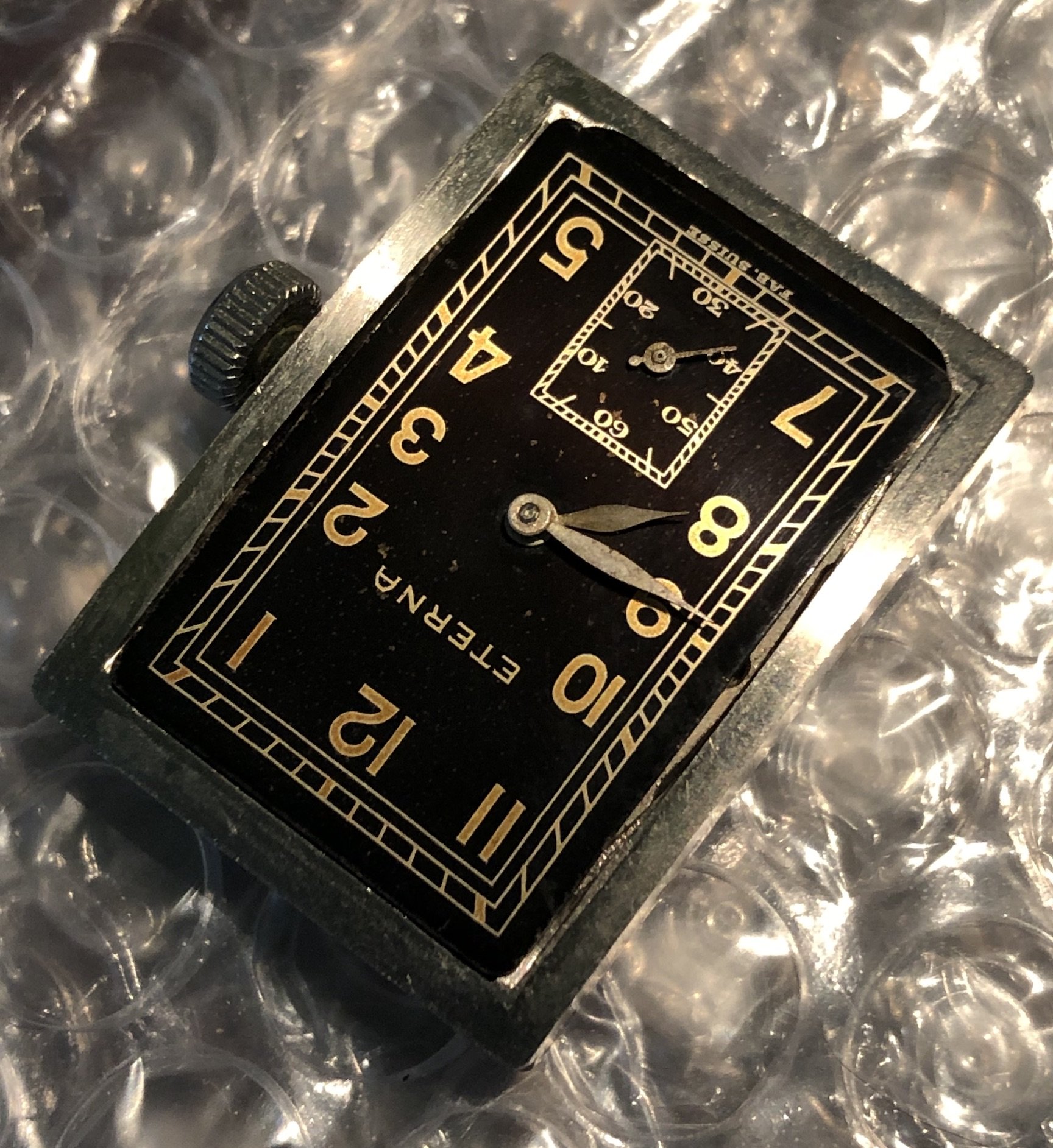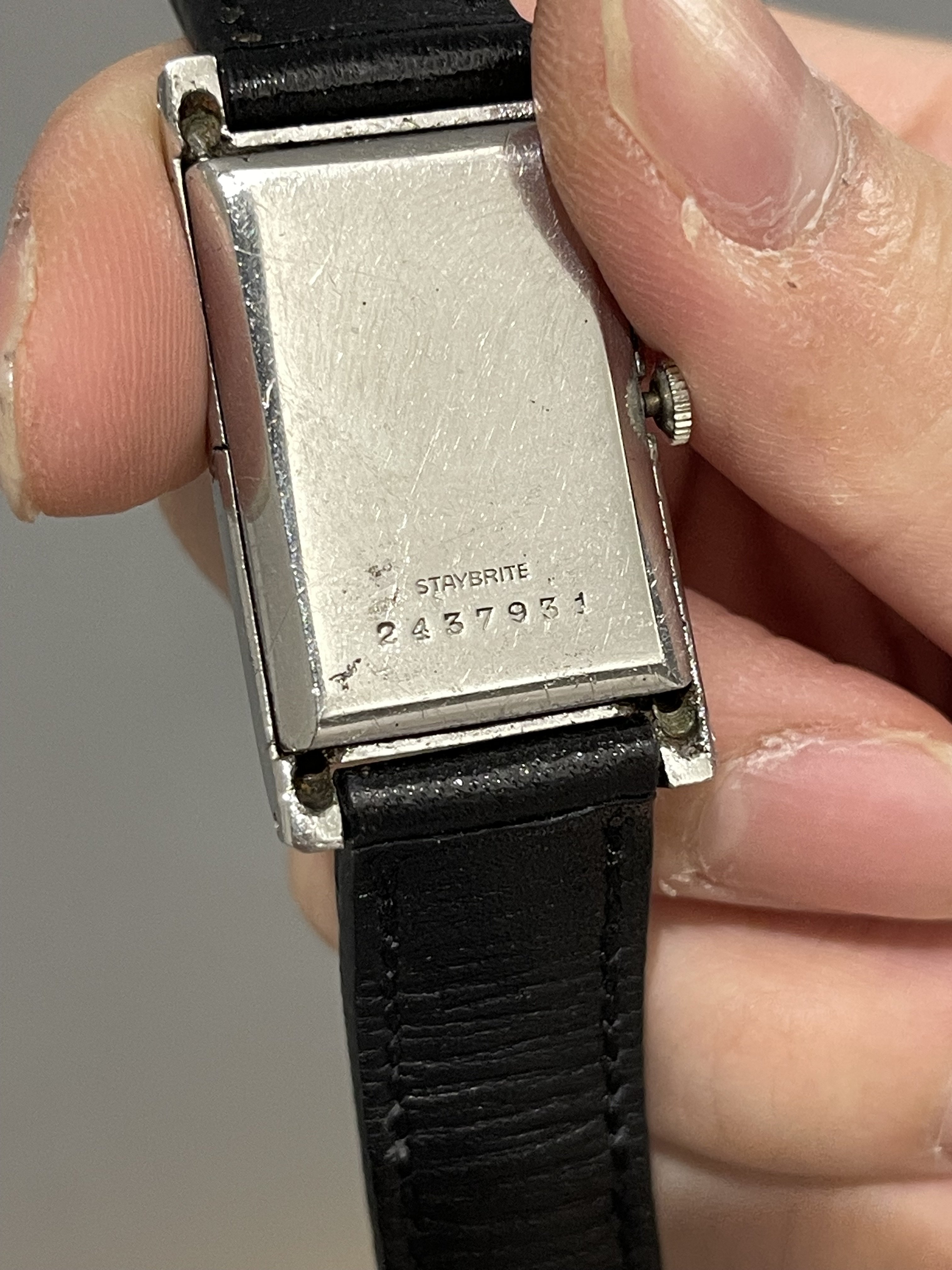路Pretty little tank watch that is a new arrival for me. Not a style normally in my wheelhouse, but it captured my attention in a recent auction because of the beautiful dial and early clamshell waterproof-style case with a slight curve.