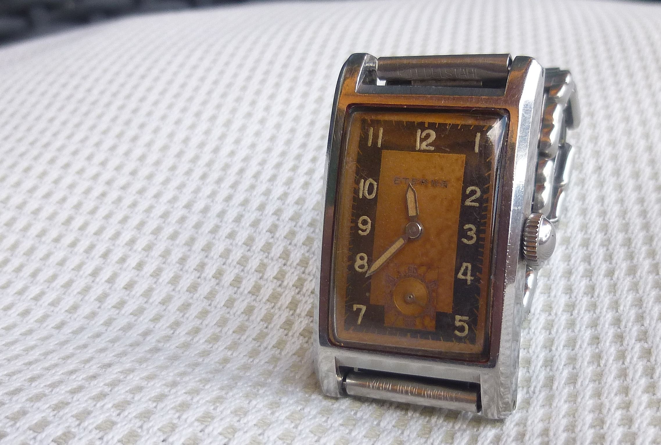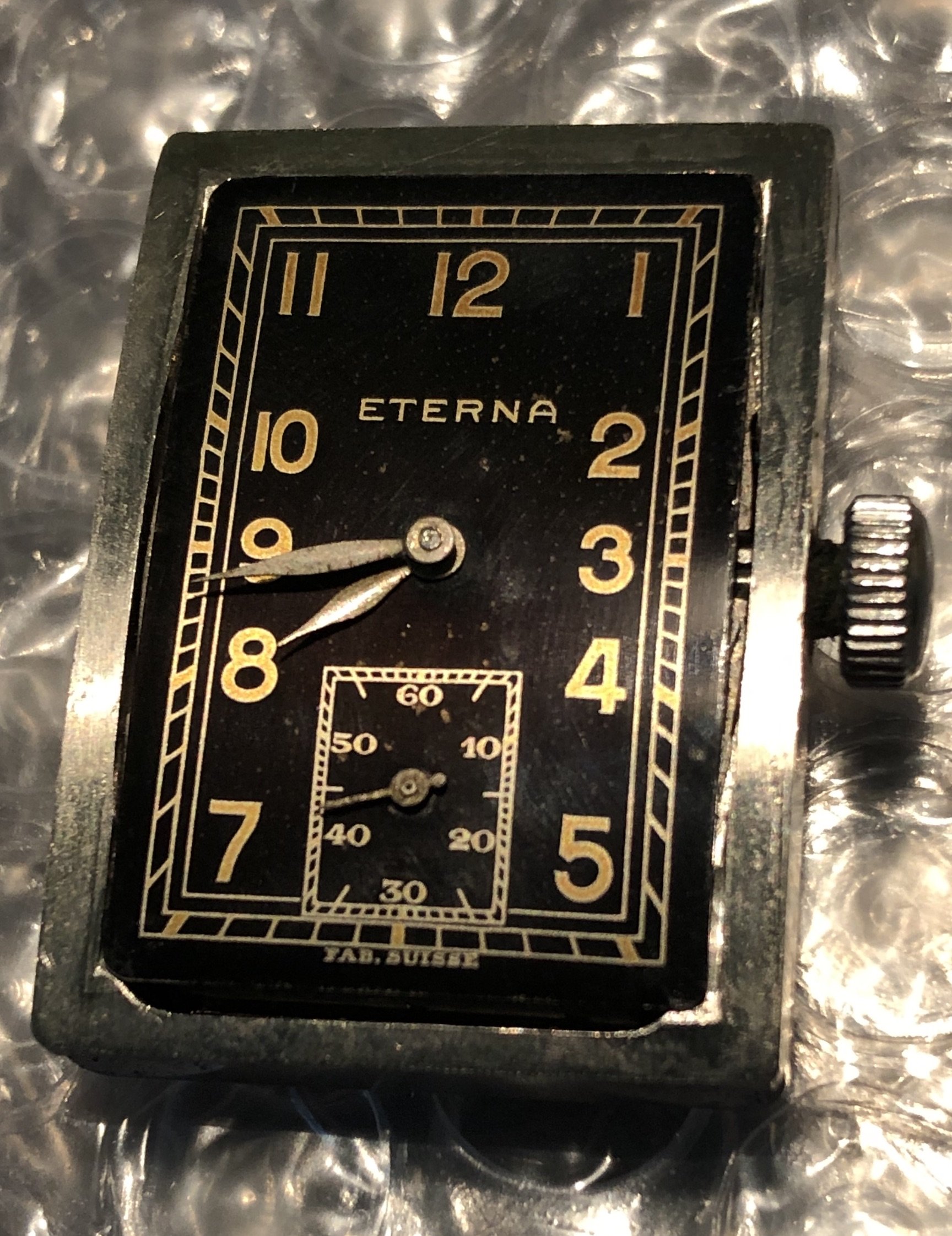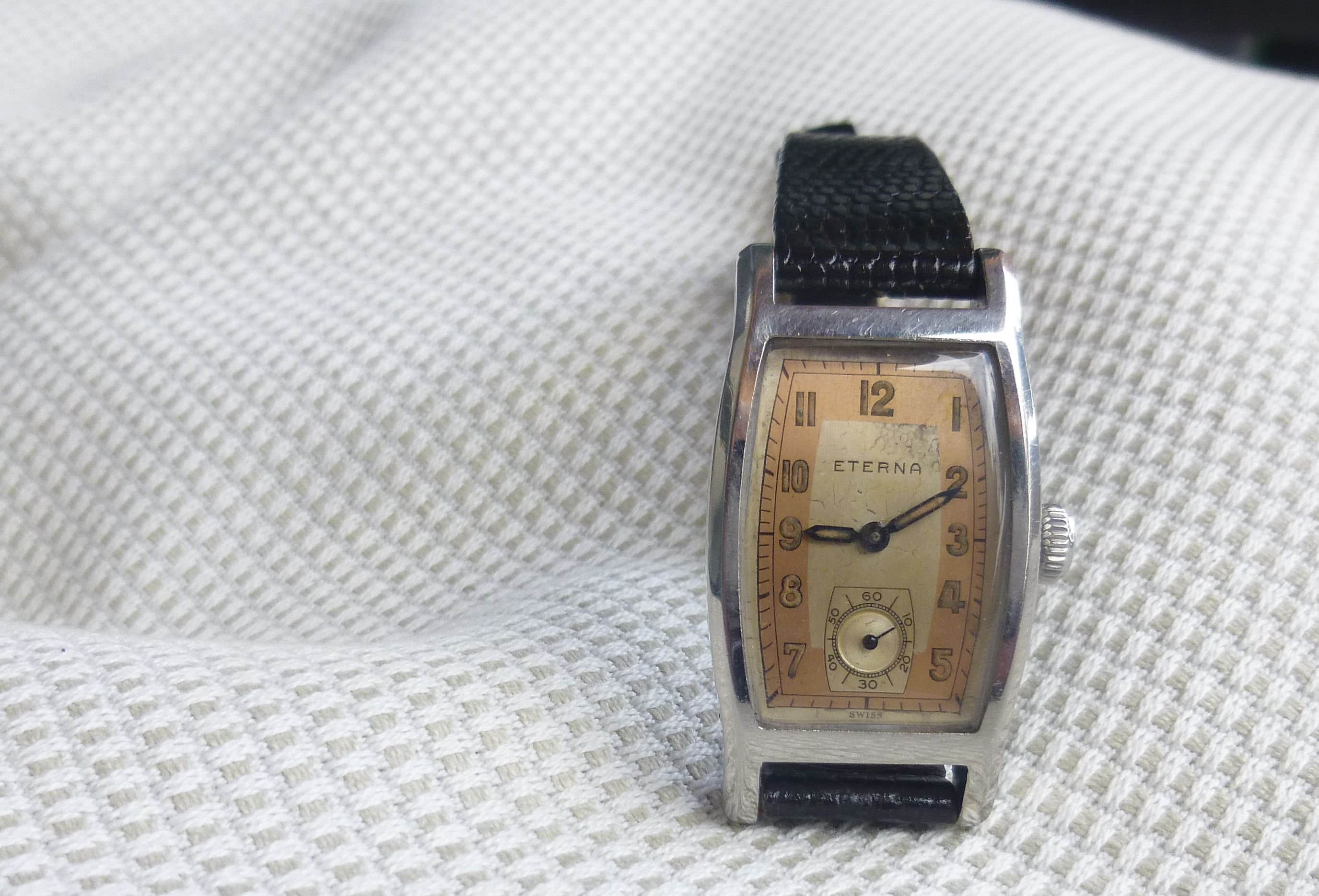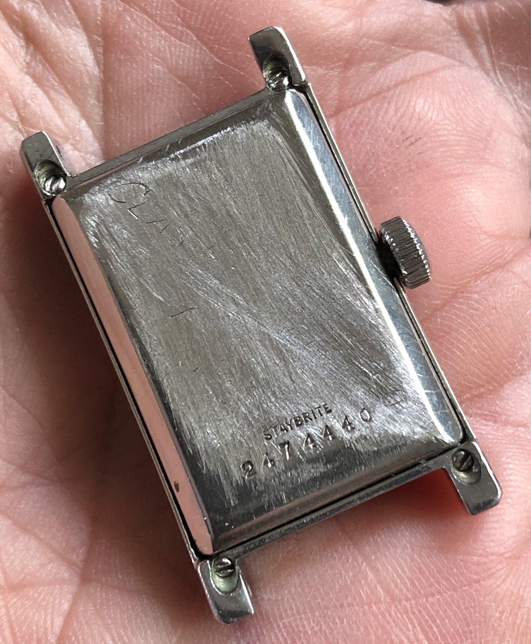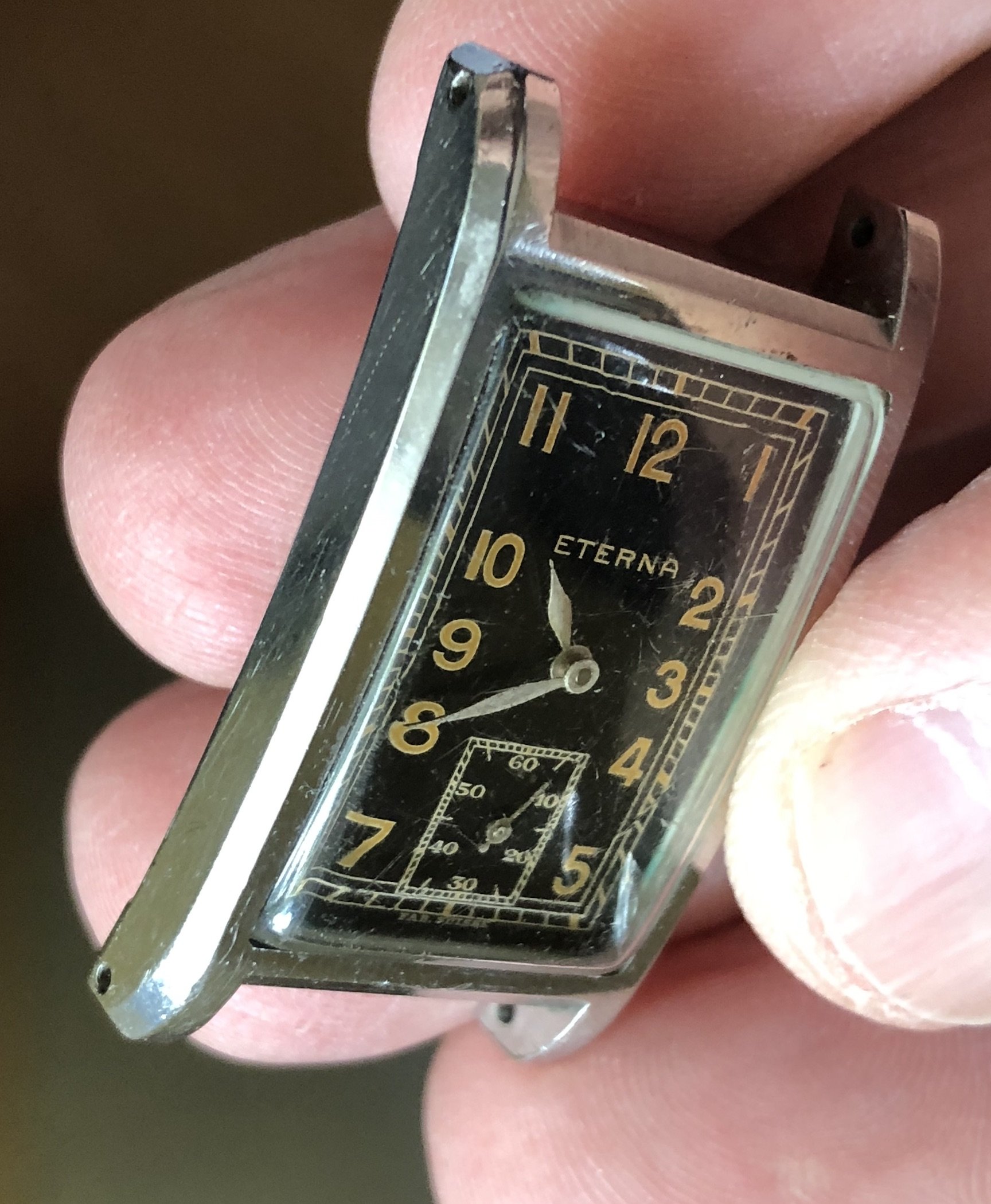 路Pretty little tank watch that is a new arrival for me. Not a style normally in my wheelhouse, but it captured my attention in a recent auction because of the beautiful dial and early clamshell waterproof-style case with a slight curve.
