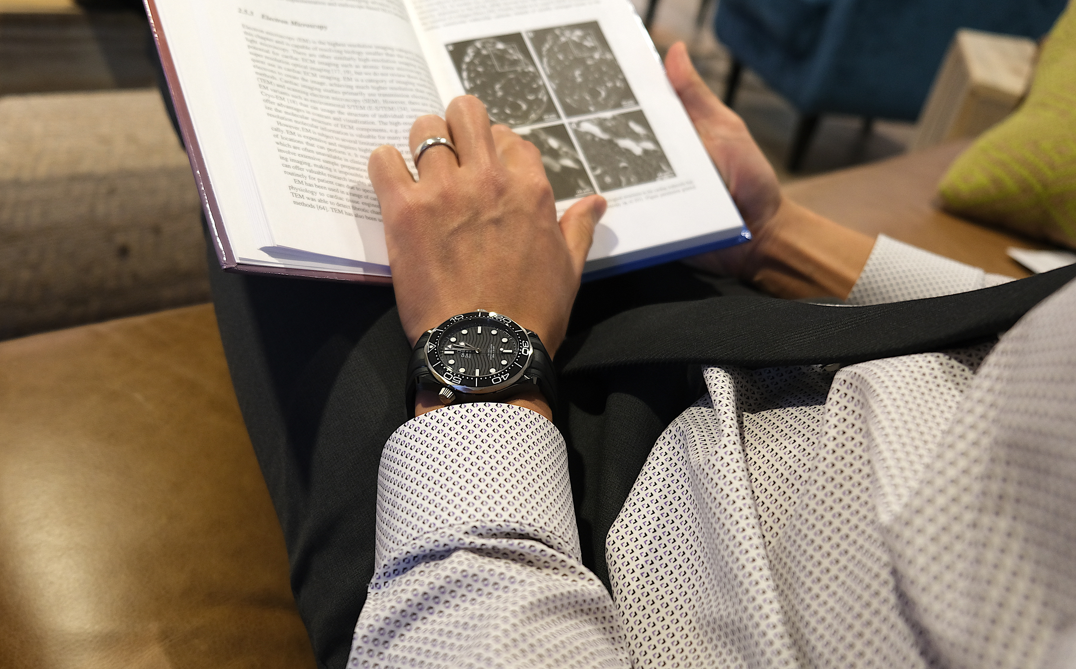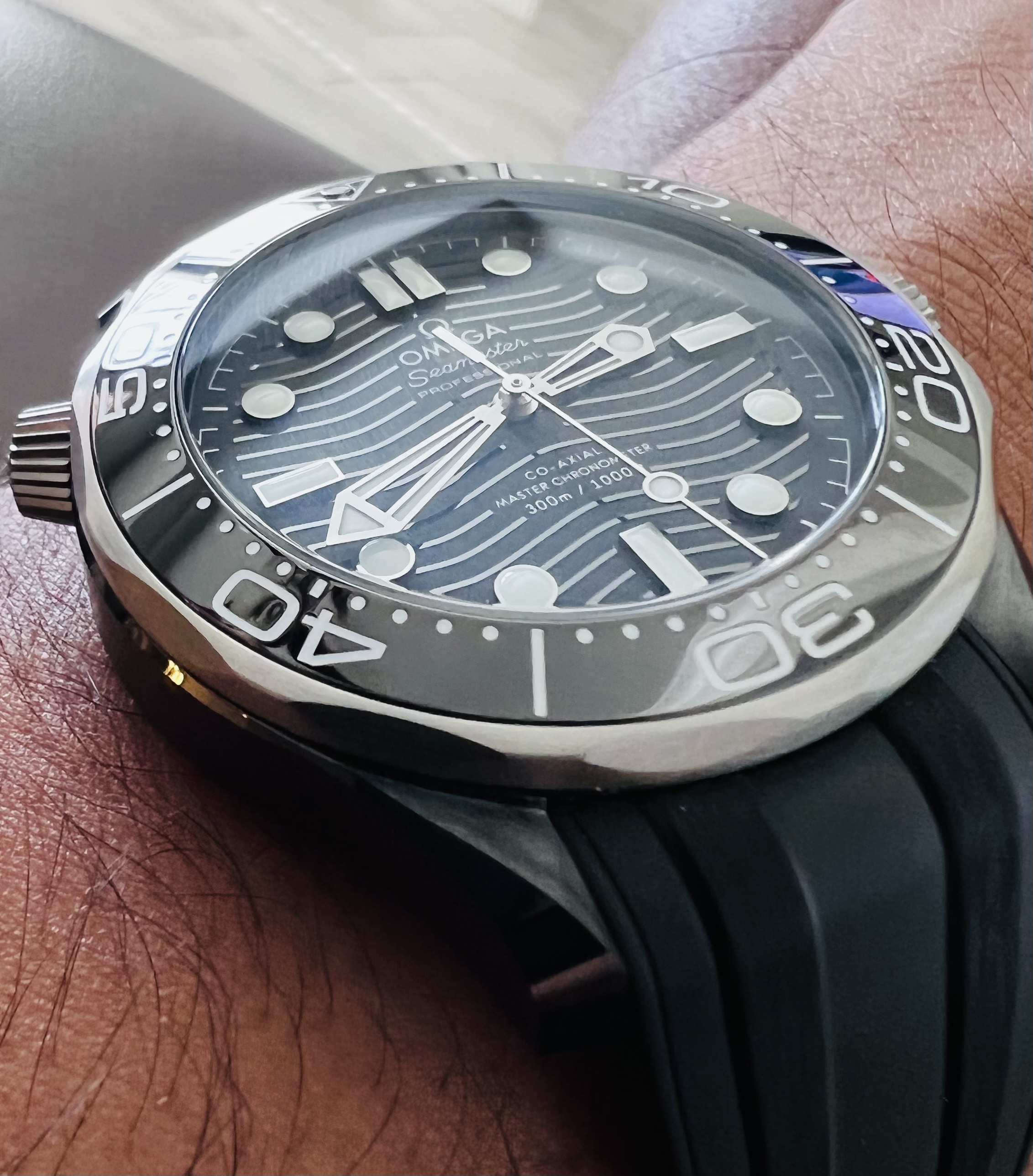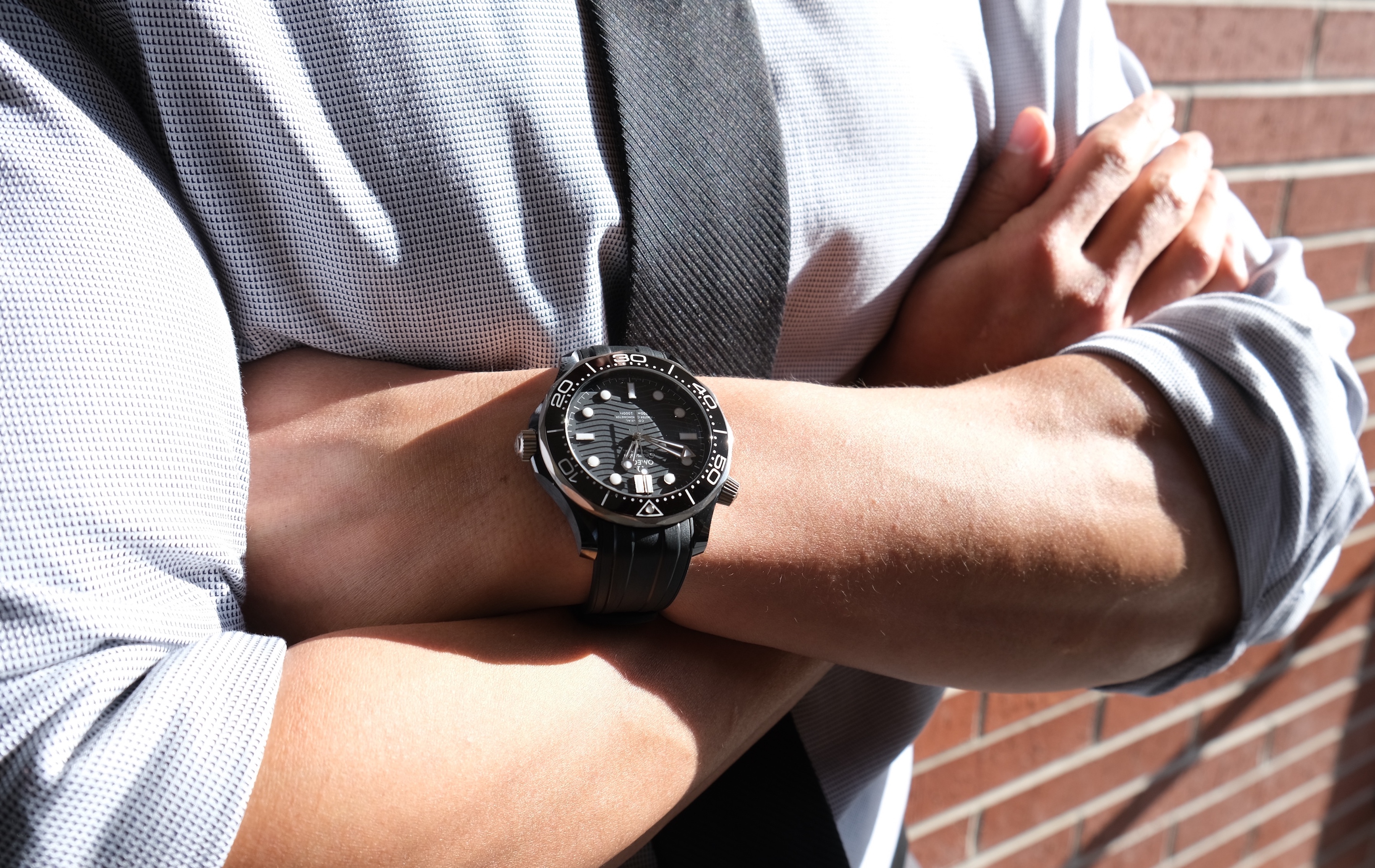 I initially had some concerns about the size of the black ceramic/titanium Seamaster Professional. Coming in with a diameter of 43.5 mm and a lug-to-lug length of 51.5 mm, this watch is the largest I have ever owned. That said, due to the immediate downward angling of the rubber strap, the watch is easily accommodated by my 6.8 to 7.0-inch wrist. The black ceramic case also has a slimming effect on the overall height of the watch, which makes the 14.5 mm height much less pronounced on the wrist than one might otherwise expect - even on a big fat OEM NATO strap.