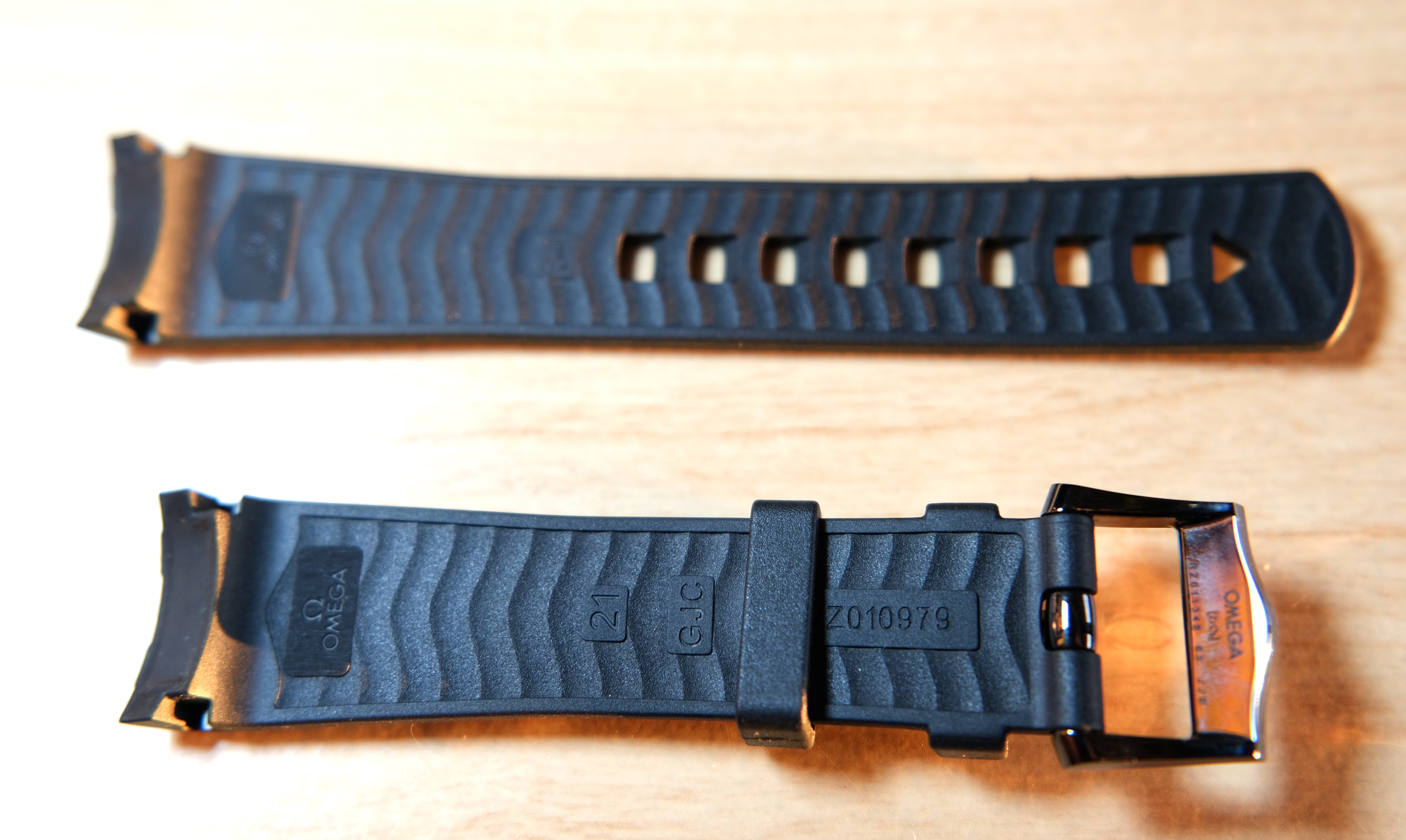 The strap that the black ceramic/titanium Seamaster Professional comes with is essentially the same as the one that comes with the stainless steel versions. The only differences are that this strap is 21 mm in width at the case end and that it has a black ceramic pin and buckle. Like the standard Seamaster Professional rubber strap, this one is dense, but flexible. The rubber does not have any particular smell and also does not attract lint - I am told these are traits of a high-quality rubber. It also features a titanium-reinforced keeper and a nicely polished black ceramic buckle. The strap is very comfortable and seems durable. With an MSRP of $8100 USD, however, I really think this watch should have come on a titanium bracelet. As I paid well below retail, this was not a deal-breaker for me.