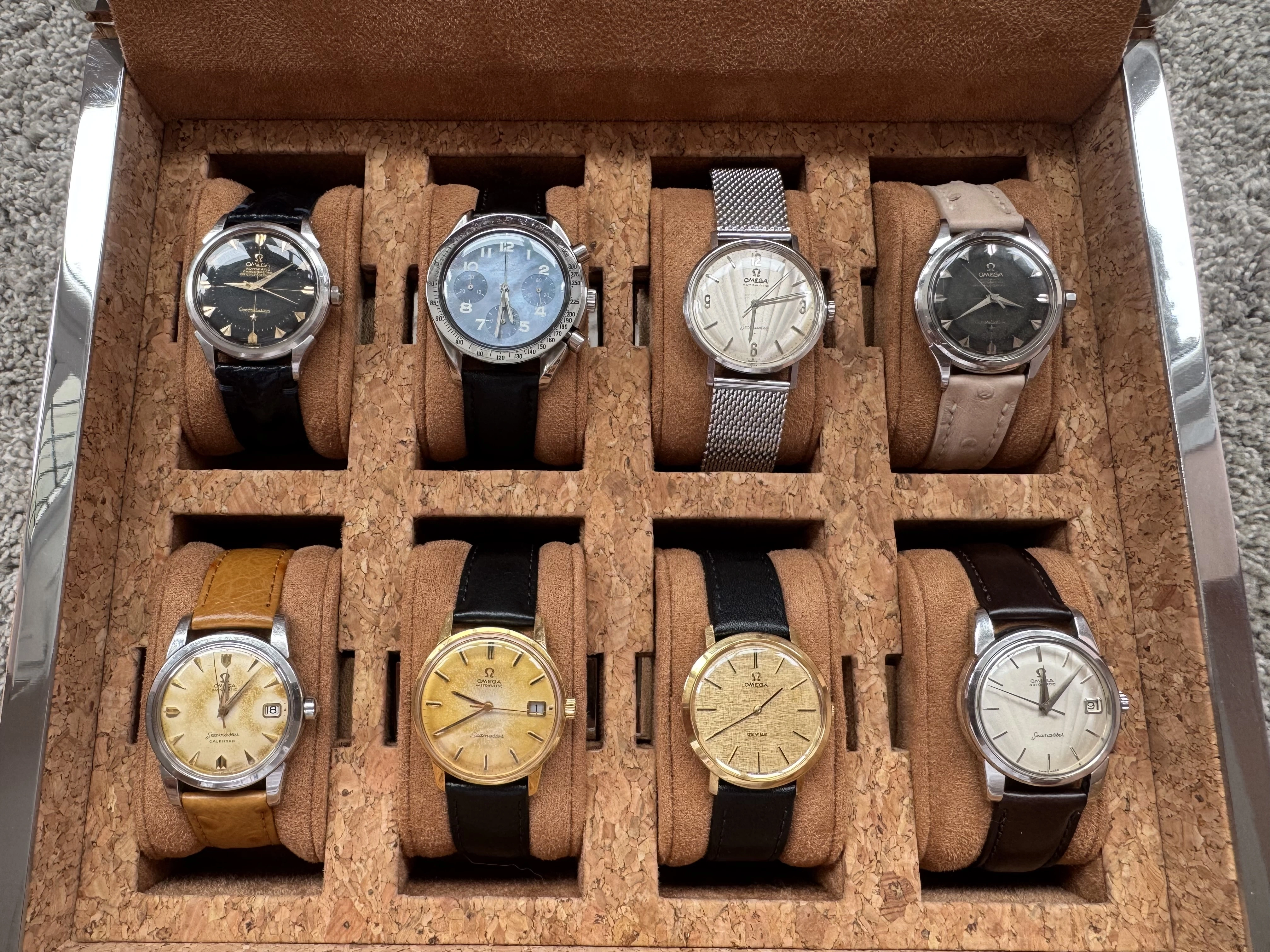 Stunning collection (and box)! Some interesting dials there, especially the Speedy reduced MOP dial and the clamshell dial Seamaster. The gold De Ville is a classic. 馃敟