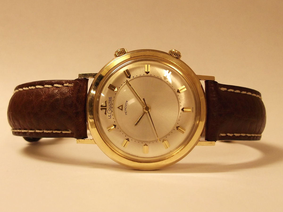 The Memovox was developed in 1949, following the development of wrist alarms by other manufacturers which since the first one in 1914 had been beset by problems. The first JLC Memovox was the manual wind cal 489 & was available to the public from 1951. Cal 489 was in production between 1950 & 1958. There are plenty of different case materials, dial furniture and sizes, but they al have the characteristic double crown arrangement. The bottom crown is a traditional winder and time setter. The top crown winds and sets the alarm time.