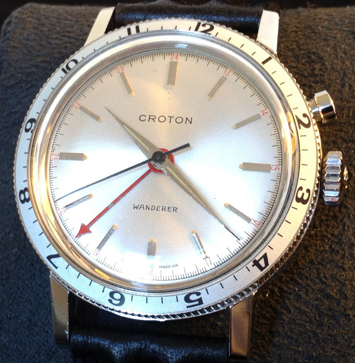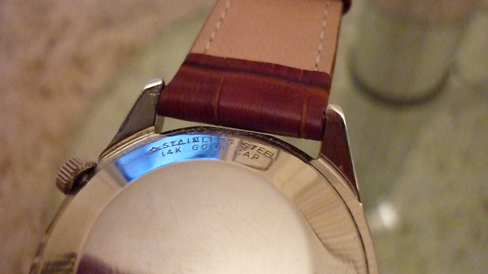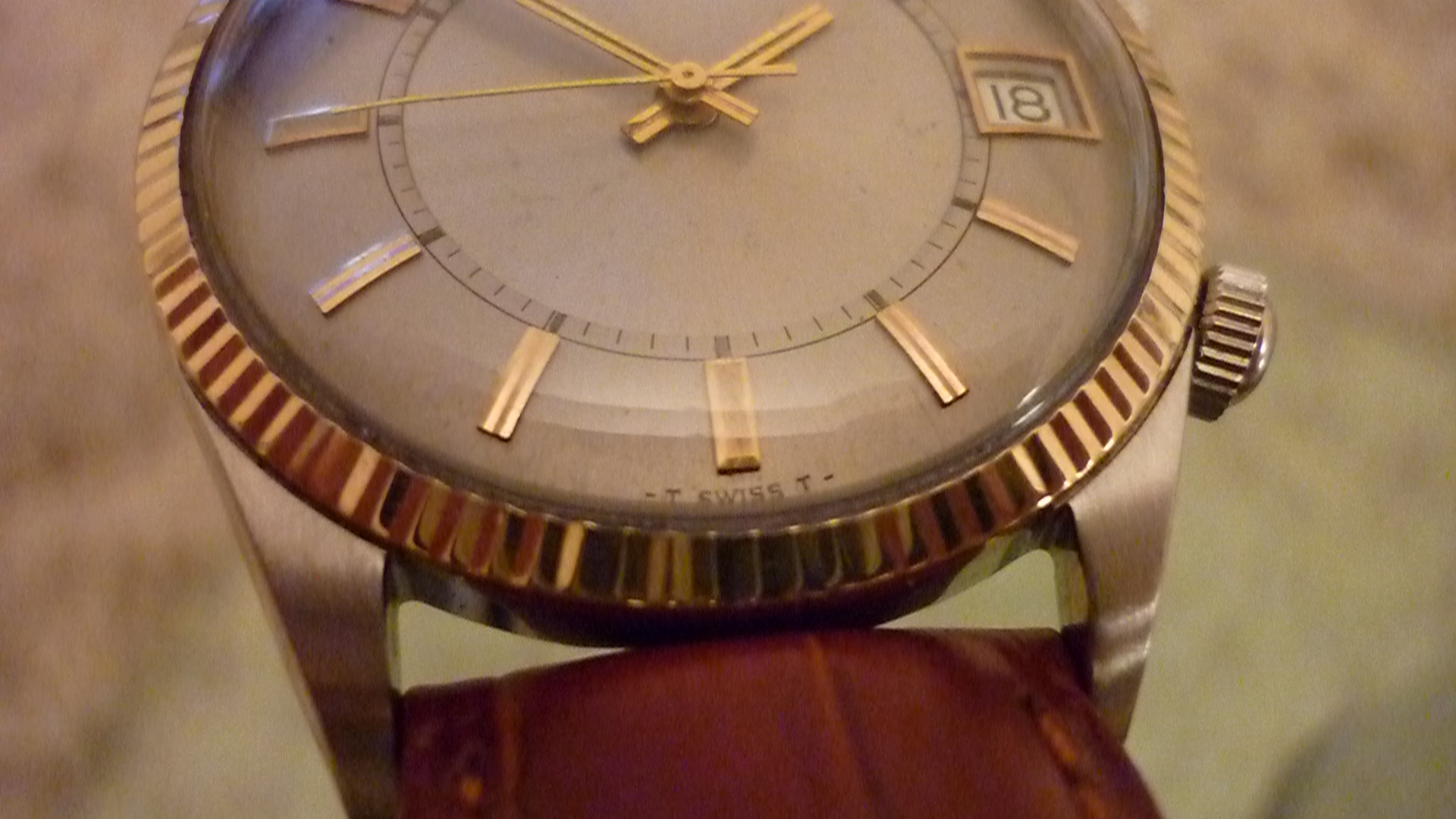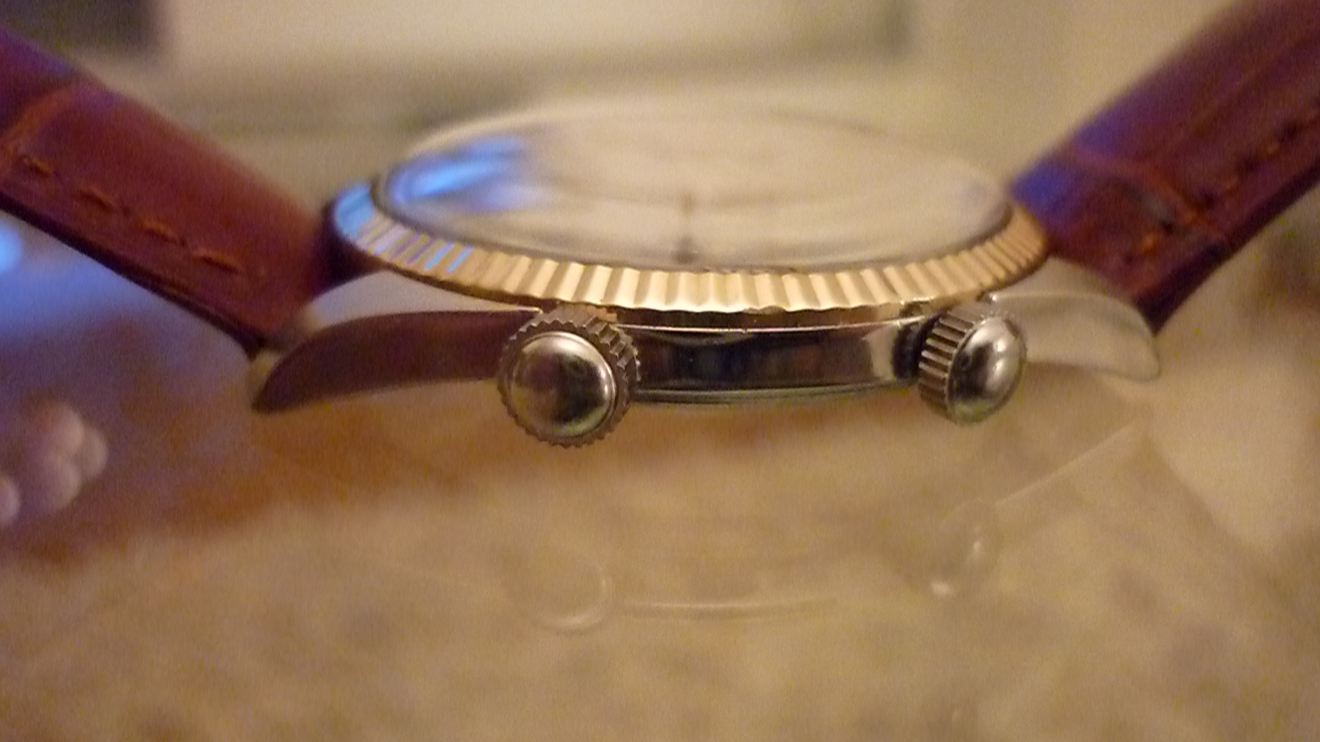 This particular watch has a serial no dating it to 1967 & is in a stainless case with a slightly unusual 14k solid gold bezel which adds a bit of jazz & light reflectivity to the case. It has a diameter of 35mm excl crown(s) and is 41mm lug to lug & a smoke grey dial which is showing some patination.