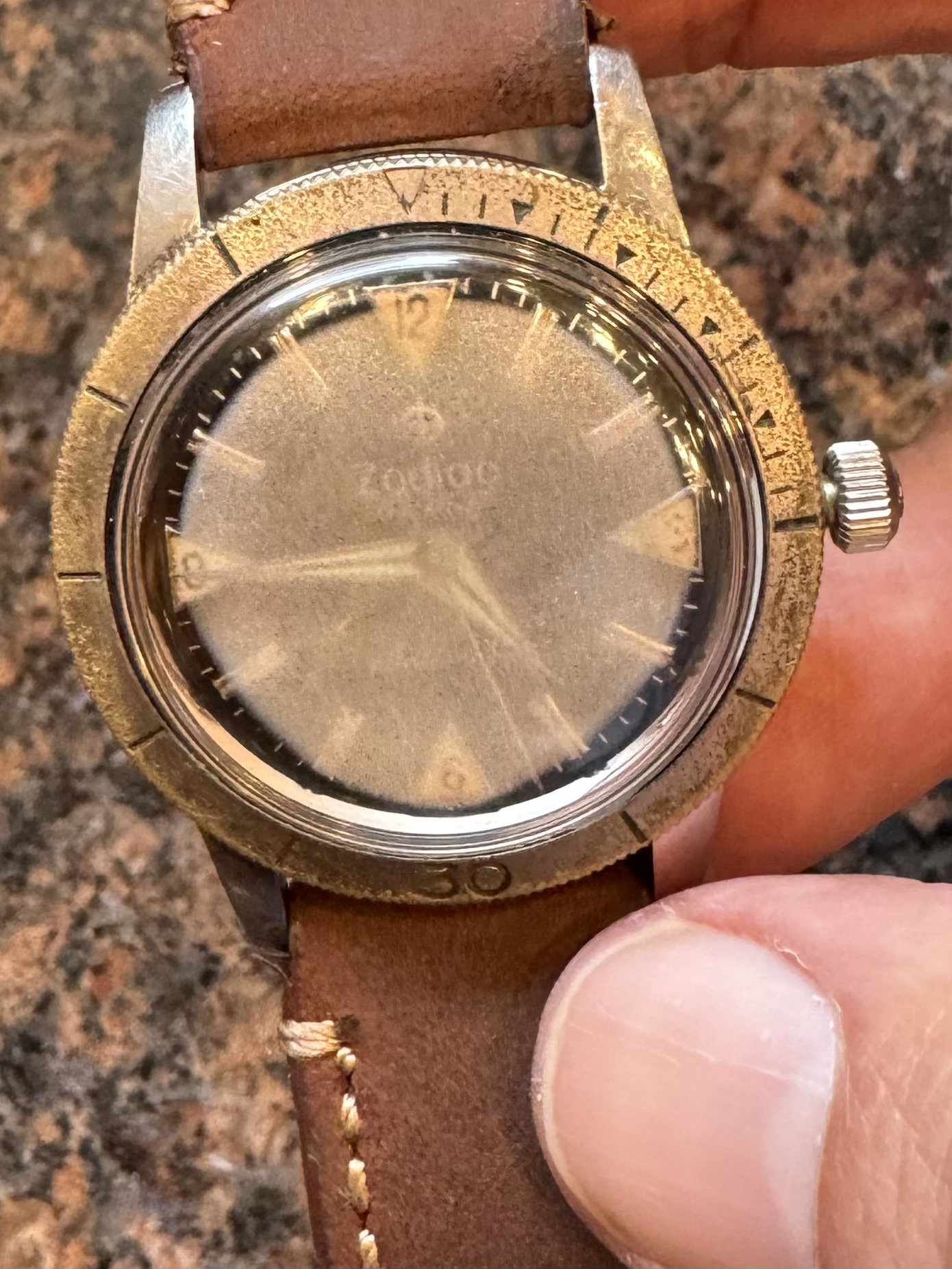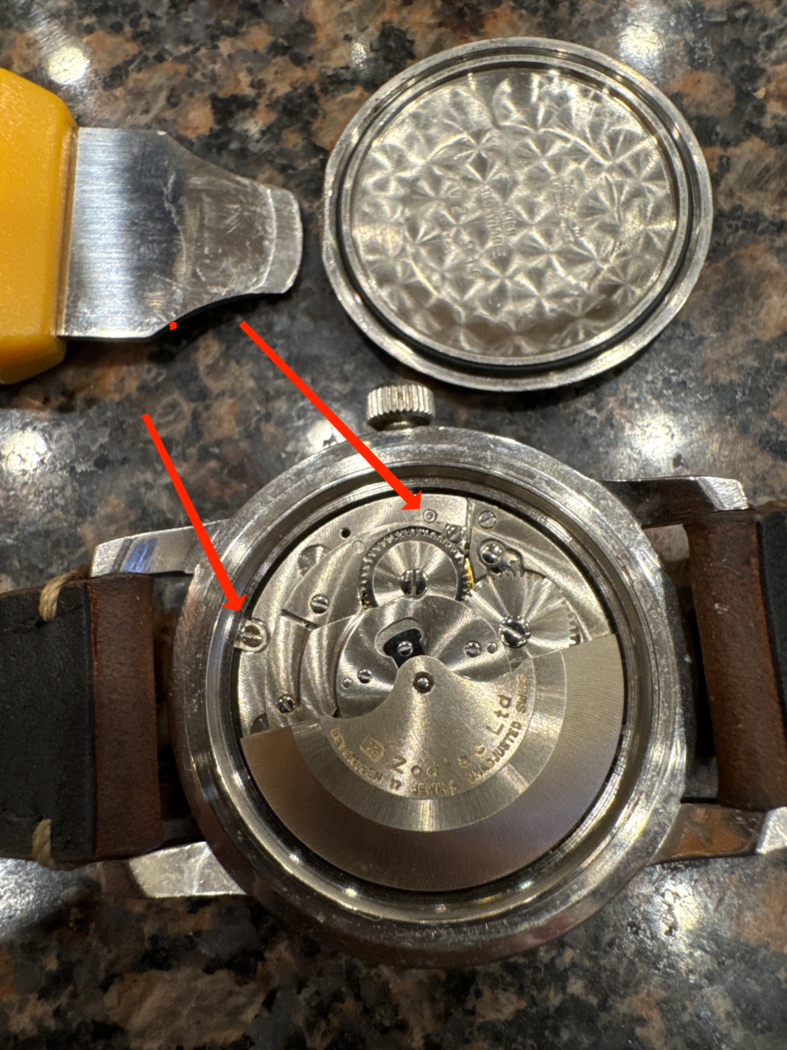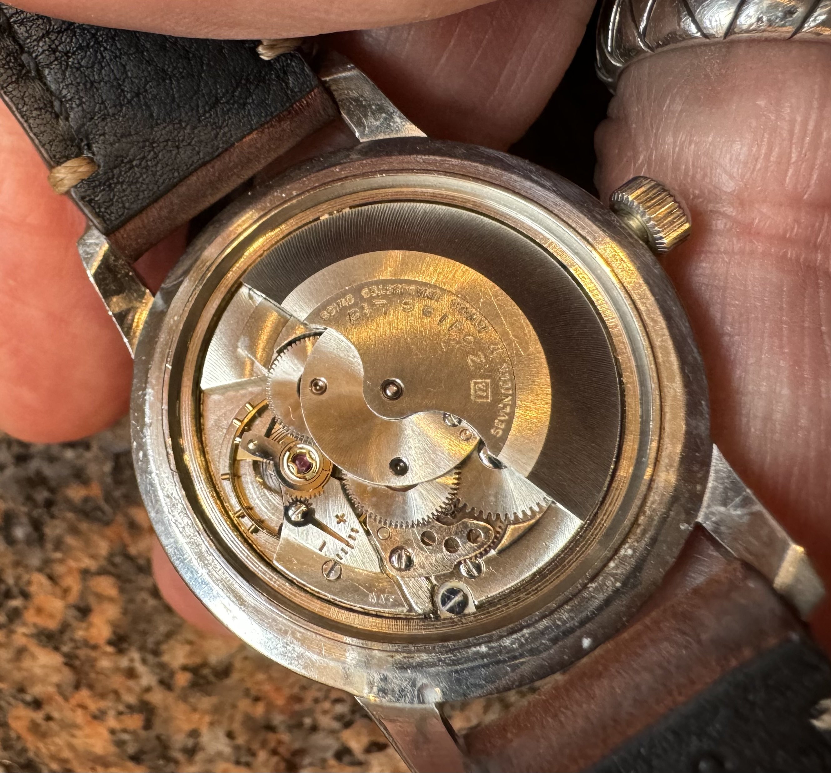 I immediately popped open the back to find ( as expected🙄) a drop of water under the rotor, and a few small specs around the hairspring and between case and movement. Fog formed under the crystal, but I don’t see any water on the dial. The movement had stopped running.. no surprise.