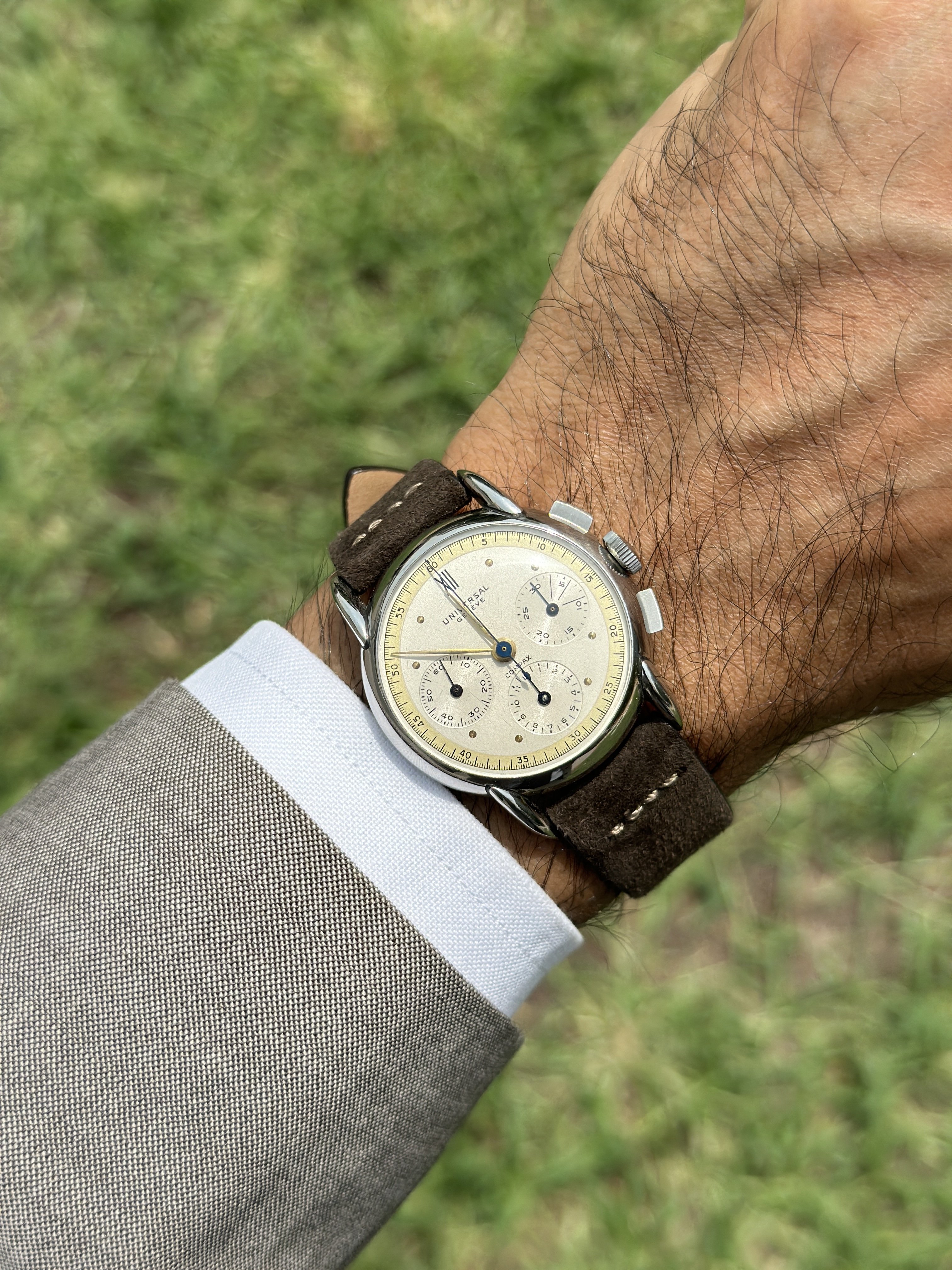 My friend, who has since bought the watch from the dealer, asked me to receive it, which I did earlier this week. To my untrained eye, the watch, especially the dial, looks pristine. I have no reason to believe or doubt that this is not NOS and I have tried to validate this based on my recently acquired, updated edition of the seminal, authoritative UG book by Sala.