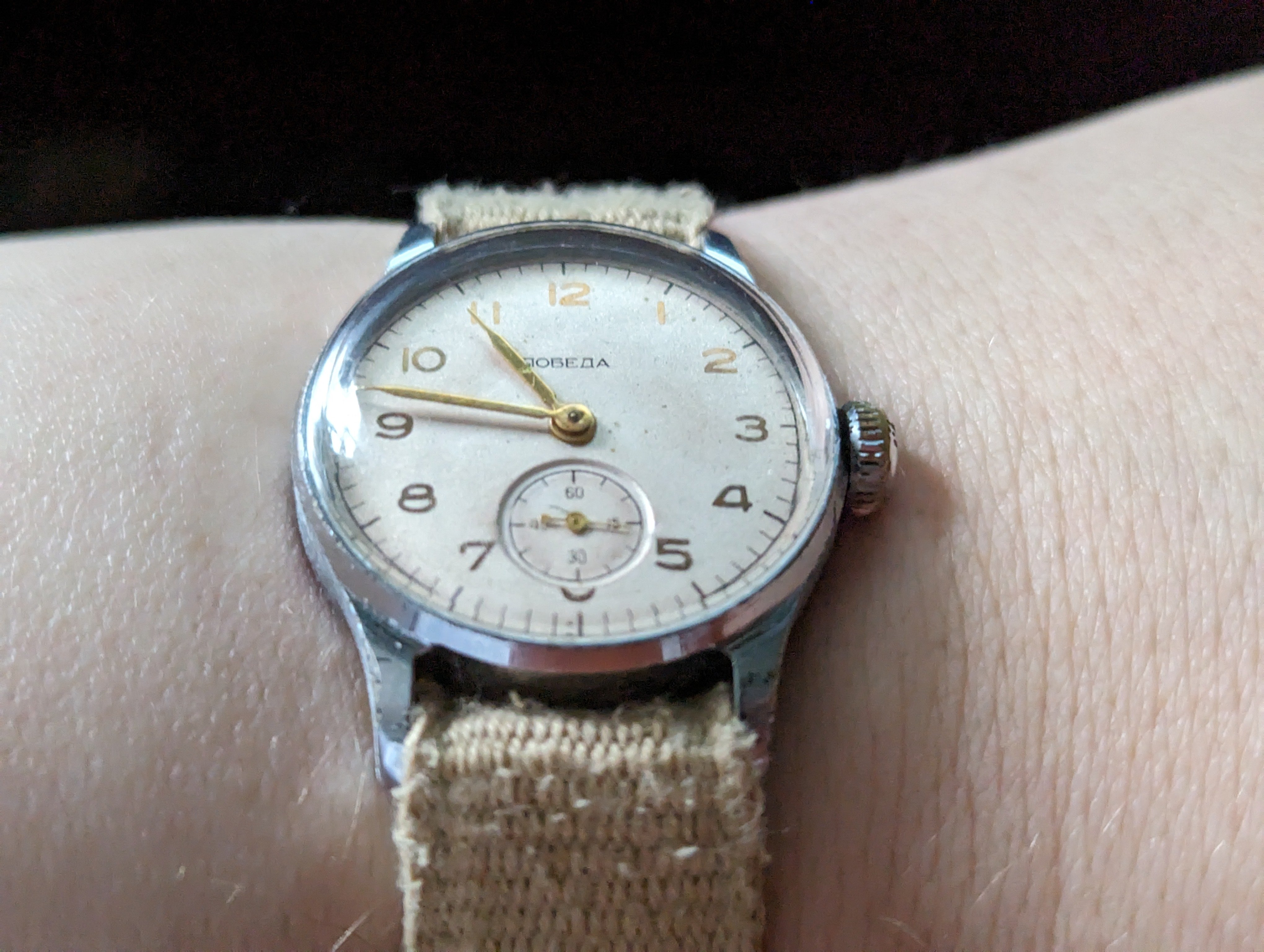 Posts 218 Likes 1,432 NikolShep ·Mar 6, 2024 pdxleaf WSWRUW (what space watch are you wearing) Chernushka's hermetic Pobeda! Mine says 'hi'.