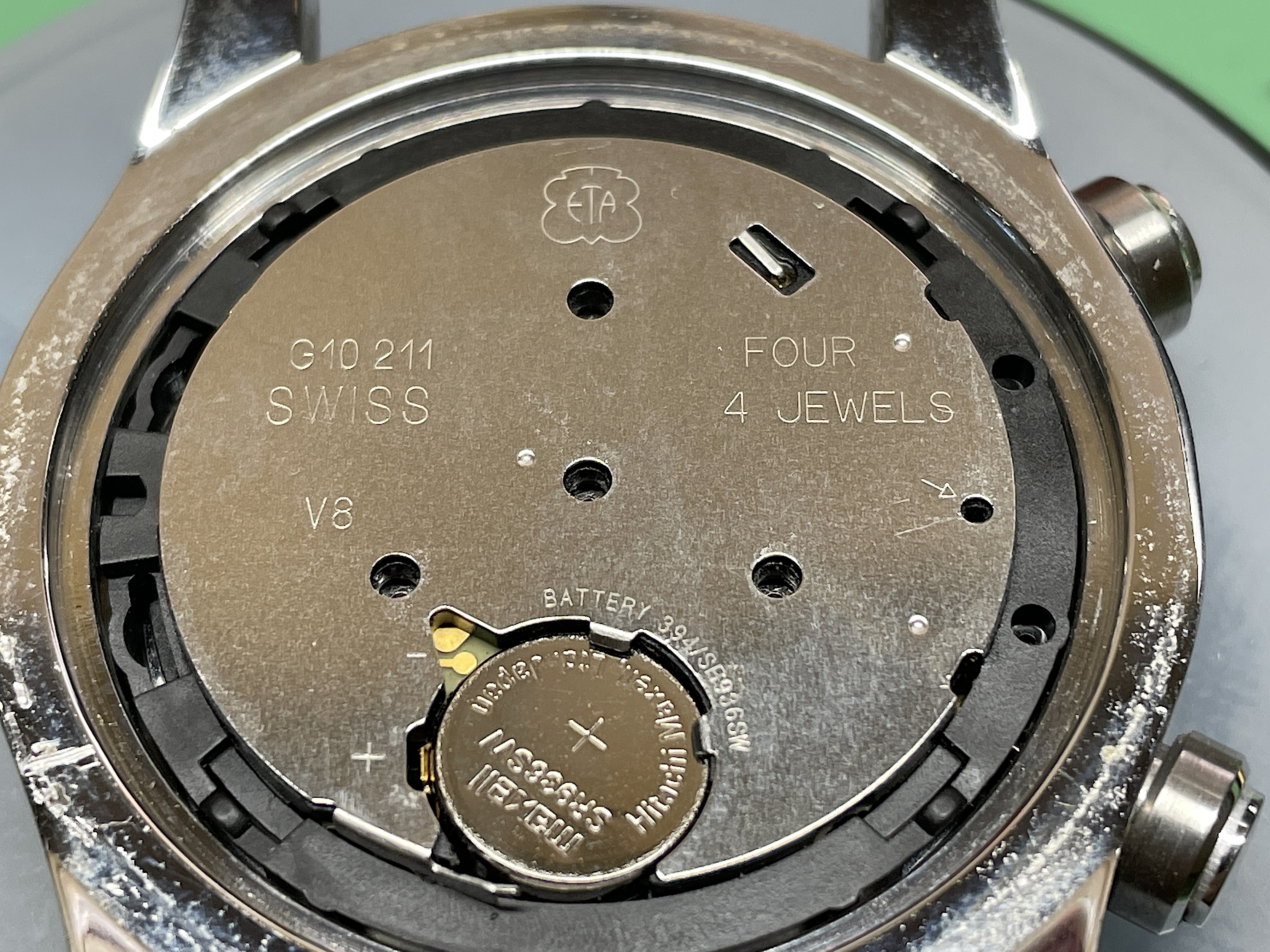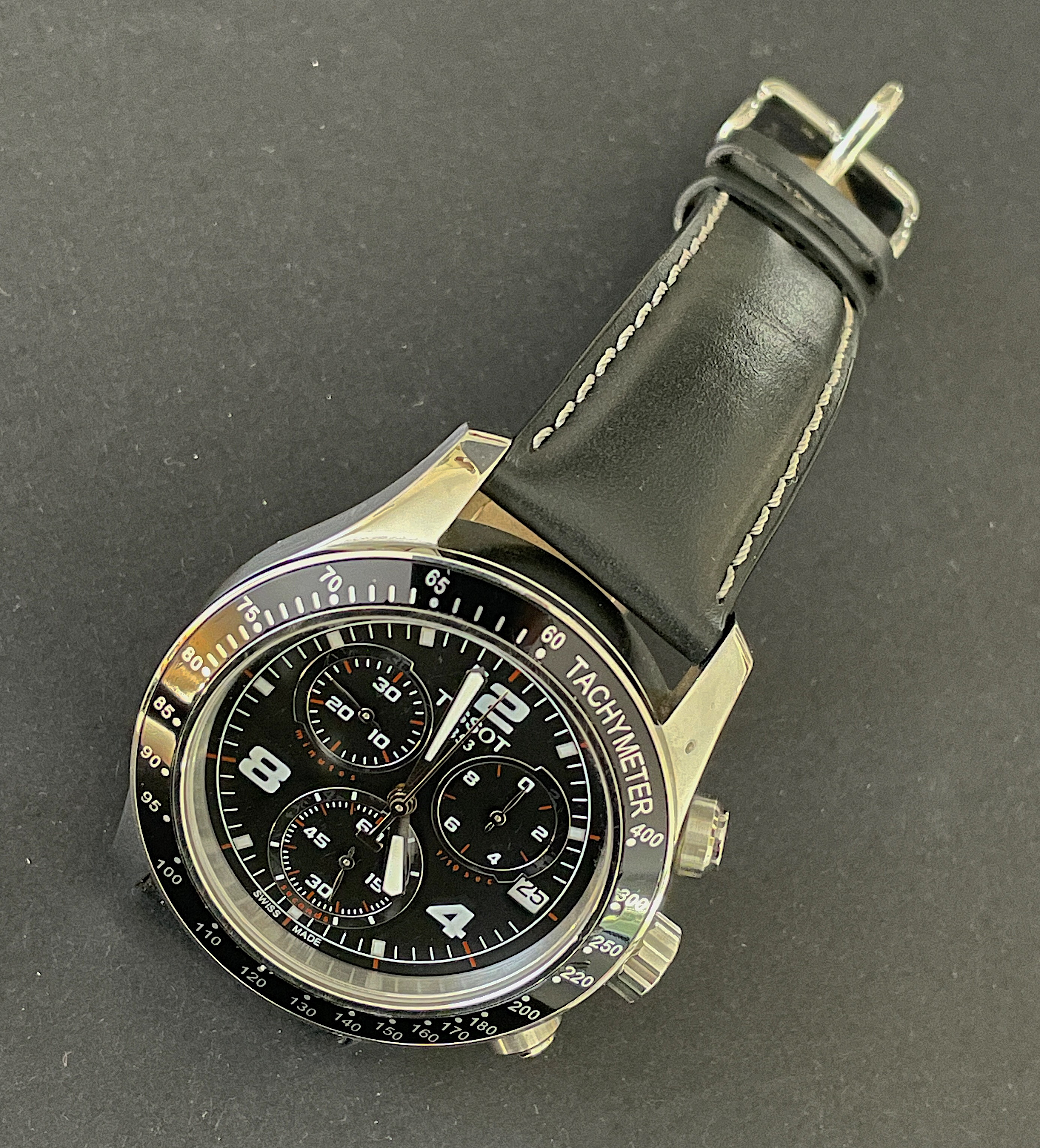 The watch is a Tissot “V8” chronograph with an ETA G10.211 caliber.