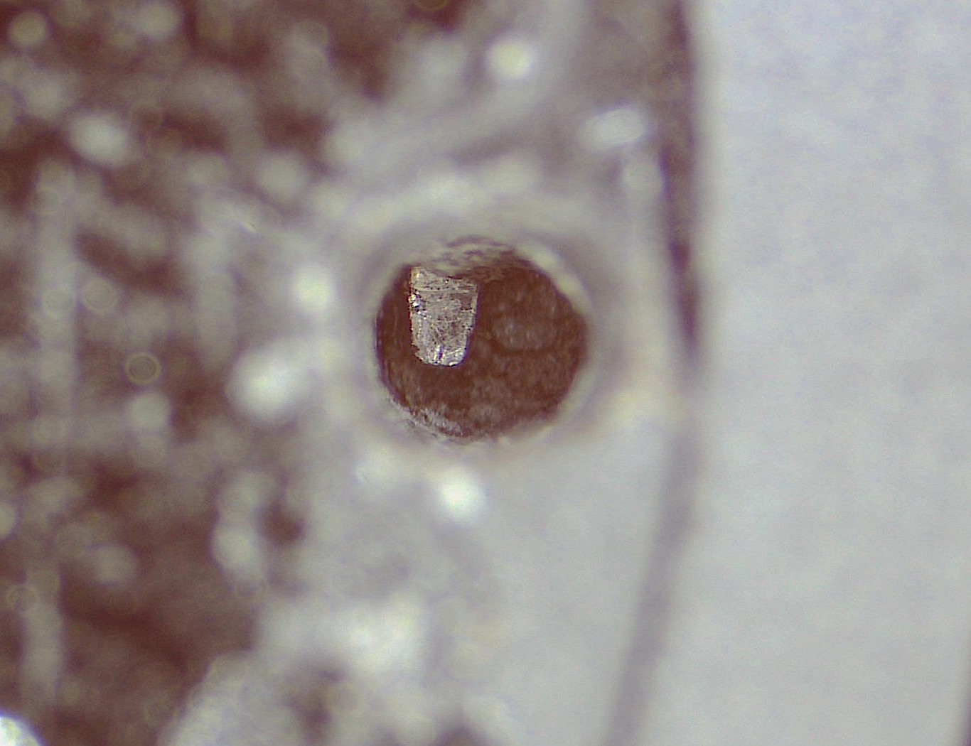 The outcome of the battery change was that pushing the stem/crown back in with force and no forethought displaced the stem release "button", and as the actual hole in the plate is a very tight 0.60mm, there is no way of depressing it.