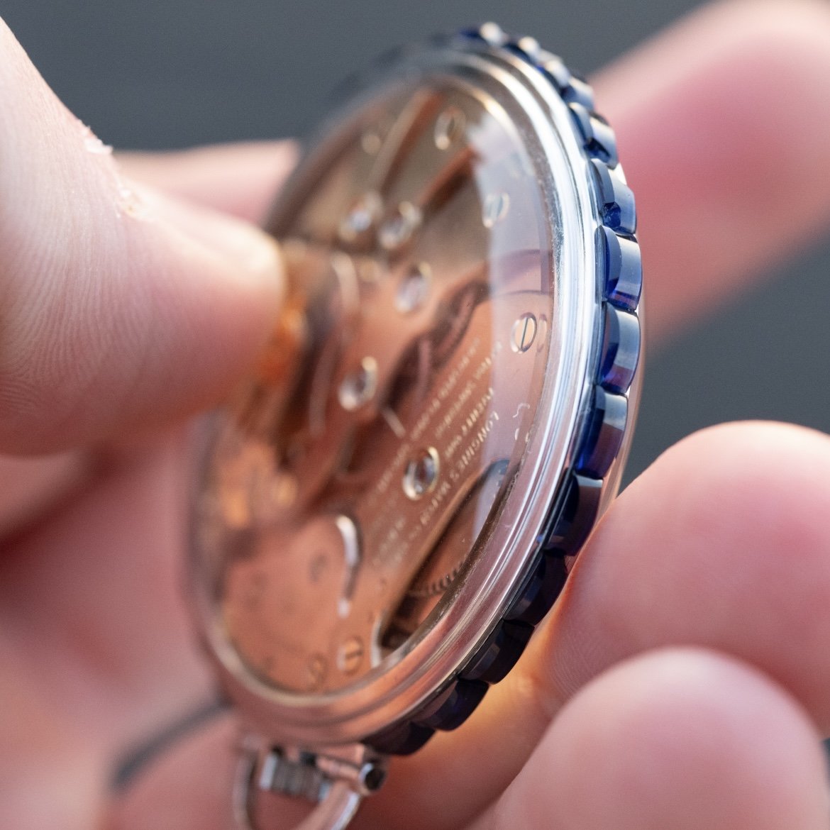 -Platinum case w. what appears to be a factory exhibition caseback (rear bezel identical to front). Caseband channel is set with 26 sapphires, several of which are chipped. No visible hallmarks with both bezels removed, although there isn’t much real-estate available. I’ll be interested to see if there are any identifiers on the inside of the caseband when the movement is eventually removed. I suspect the crown to be non-original.