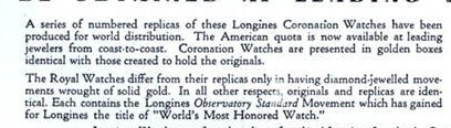 According to the ad, a limited number of “royal” pocket, wrist, and cocktail watches were produced and sold as “replicas”, differing only from the coronation-presented watches in that they did not share the exotic movements. Interestingly, the watches pictured all have the same crown motif visible on my example’s movement.