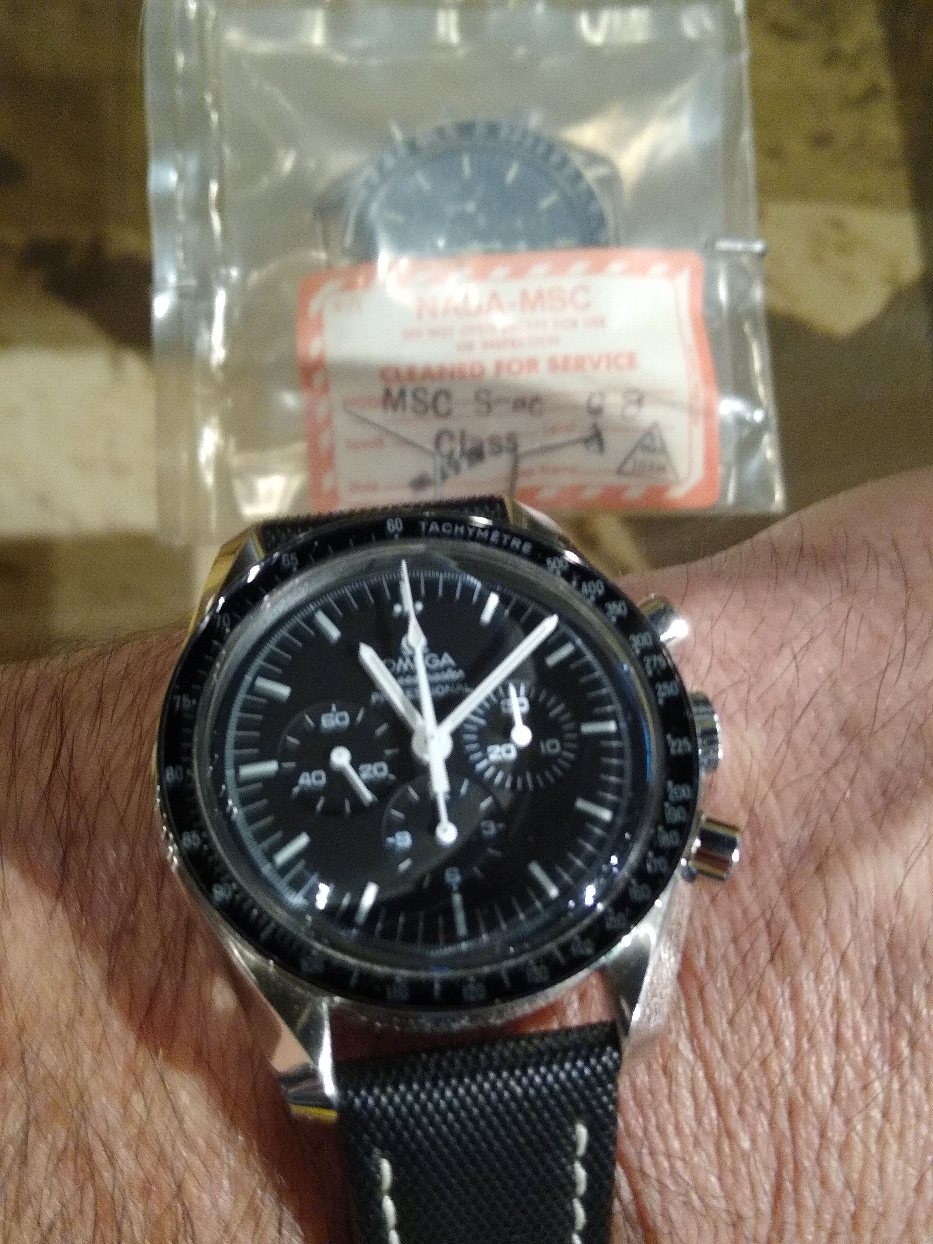 Do not buy the watch before seeing one in person. I was a little surprised the dial is not jet black as it appears in many of the Omega website photos. But is more of a dark grey. I’ve always pictured the dial the same color as the tachymetre bezel. But it’s not quite as dark. Also compare the Hesalite to the Sapphire in person side by side. I liked the look of the Hesalite more, but was afraid of it scratching. Reading through the forums I learned that any scratches are easily buffed out with a cotton ball and Polywatch. I wanted a new watch that I could call me own, wear everyday, and scratch up myself - all with the 5 year warranty. I could not seem to get the AD or Boutique to budge much on the price besides eating the tax. This was during the 50th anniversary and not sure if that was driving up demand. In the end I purchased through a trusted seller on Omega Forums (Kringkily). Best advice I received on the forum was “Buy the seller and not the watch”. Kringkily was top notch. Couldn’t say enough good things about him. Buying from Kringkily was the best of both worlds. The 5 year warranty without paying retail. It was a little scary wiring cash to a total stranger. But once again, Omega Forums to the rescue. I contacted a few people I noticed who bought from him and they reassured me along with all his glowing well deserved reviews. Their DMs and feedback set me at ease. Money wired on Monday and watch arrived on Wednesday.